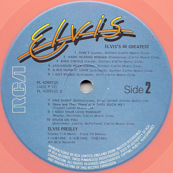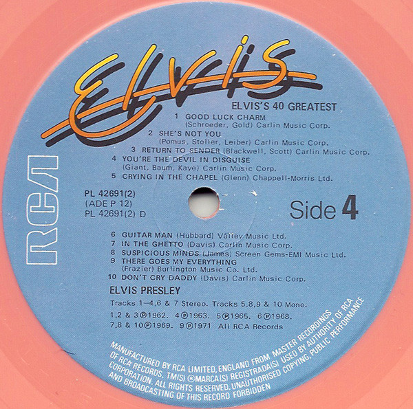 It was originally pressed with a brown cover and doctored image of Elvis, with blue labels, this short lived pressing was replaced by yellow label copies. The 1977 release, which appeared on the new RCA blue "signature" label, credited to "RCA Special Products", was released simultaneously on black vinyl and a more expensive pink vinyl edition. The black vinyl sold a stagger 250'000 copies LESS than the pink vinyl, making it the more collectable item, even though fans are often tricked in to thinking the pink vinyl is "rare". It is in fact one of the most common and best selling Elvis compilation albums of all time.