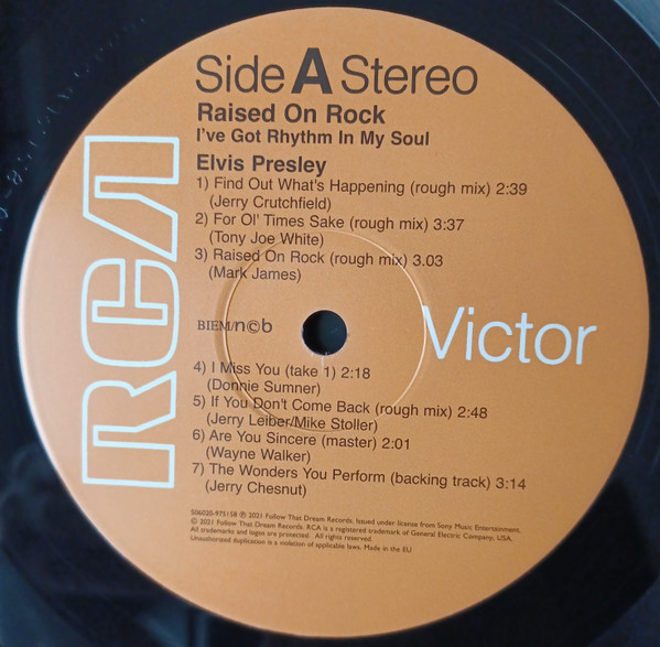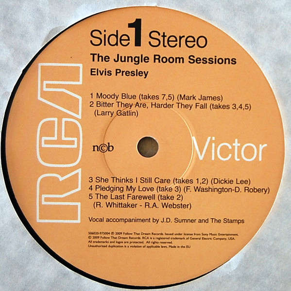 JUNGLE ROOM SESSIONS Side A: Moody Blue (Takes 7, 5)/ Bitter They Are, Harder They Fall (Takes 3, 4, 5)/ She Thinks I Still Care (Takes 1, 2)/ Pledging My Love (Take 3)/ The Last Farewell (Take 2) Side B: Hurt (Take 3)/ Danny Boy (Take 8 )/ Love Coming Down (Take 3)/ Never Again (Take 11)/ For The Heart (Take 3)/ Blue Eyes Crying In The Rain (Take 2)/ I'll Never Fall In Love Again (Take 5) Side C: Way Down (Take 2)/ It's Easy For You (Take 1)/ Pledging My Love (Unedited Master)/ He'll Have To Go (Rough-Mix Master)/ Moody Blue (Take 6)/ Solitaire (Take 3) Side D: Love Coming Down (Take 4)/ For The Heart (Take 1)/ She Thinks I Still Care (Take 3, 4)/ Bitter They Are, Harder They Fall (Take 1)/ Hurt (Take 5)/ Danny Boy (Take 9)/ Fire Down Below (Instrumental - Take 14)/ America (Closing Part Only) Released: October 10, 2009 Cat.-No.: 506020-975004 Format: 12'' / 33 ? rpm (2 Record Set) |