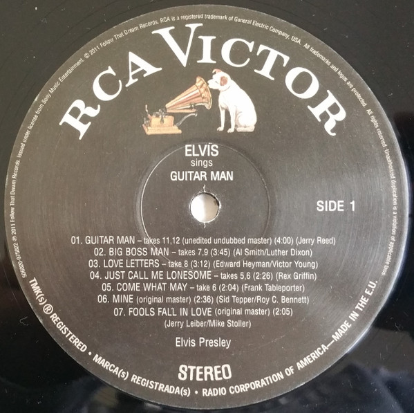 SINGS GUITAR MAN Side A: Guitar Man (Takes - 11, 12)/ Big Boss Man -(Takes - 7, 9)/ Love Letters (Take 8)/ Just Call Me Lonesome (Takes 5, 6)/ Come What May (Take 6)/ Mine (Original Master)/ Fools Fall In Love (Original Master) Side B: I'll Remember You (Vocal Overdub Uniidited Masters)/ High Heel Sneakers (Take 7)/ Down In The Alley (Take 6)/ Indescribably Blue (Vocal Overdub -Take 1)/ Tomorrow Is A Long Time (Takes 1, 2) Side C: Big Boss Man (Take 2)/ Just Call Me Lonesome (Takes 3, 4)/ Down In The Alley (Takes 2, 3, 4)/ Come What May (Takes 3, 4)/ We Call On Him (Take 8)/ Singing Tree (Remake - /akes 1, 2, 3)/ Guitar Man (Take 10) Side D: Love Letters (Take 2)/ Fools Fall In Love (Takes 1, 4)/ Singing Tree (Takes 10, 13)/ You Don't Know Me (Take 2)/ Come What May (Take 7)/ High Heel Sneakers (Take 5) Released: October 21, 2011 Cat.-No.: 506020-975022 Format: 12'' / 33 ? rpm (2 Record Set) |