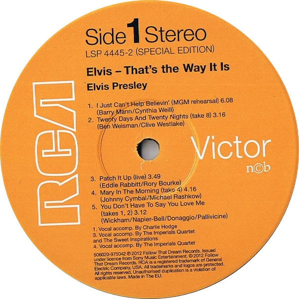 EDITION Side A: I Just Can't Help Believin' (MGM Rehearsal)/ Twenty Days And Twenty Nights (Take 8)/ Patch It Up (Live)/ Mary In The Morning (Take 4)/ You Don't Have To Say You Love Me (Takes 1, 2) Side B: You've Lost That Lovin' Feeling (Stage Rehearsal)/ I've Lost You (Live)/ Stranger In The Crowd (Master Take 9, Rough Mix)/ The Next Step Is Love (Live)/ Bridge Over Troubled Water (Live) Side C: Just Pretend (Takes 1, 2)/ How The Web Was Woven (Master)/ Patch It Up (Alternate Master Take 9)/ Sweet Caroline (Live)/ Make The World Go Away (Live)/ The Wonder Of You (Live) Side D: Little Sister/Get Back (Live)/ Something (Live)/ Patch It Up (Take 1)/ The Next Step Is Love (Takes 9, 10)/ I've Lost You (Takes 4-6) Released: June 2012 Cat.-No.: LSP-4445-2 (506020~975042) Format: 12'' / 33 ? rpm (2 Record Set) |