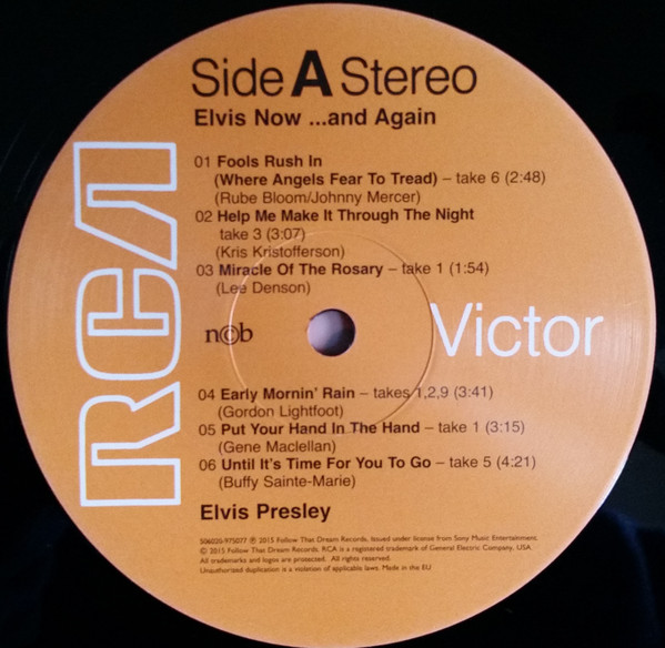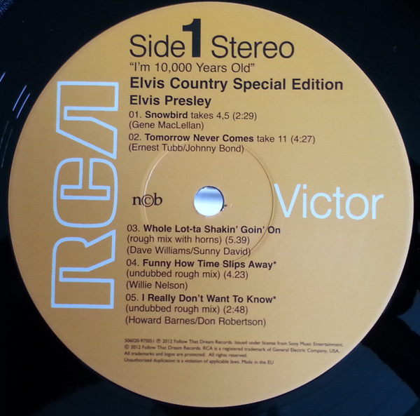 ELVIS COUNTRY - SPECIAL EDITION Side A: Snowbird (takes 4,5)/ Tomorrow Never Comes (take 11)/ Whole Lot-ta Shakin' Goin' On (rough mix with horns)/ Funny How Time Slips Away* (undubbed rough mix)/ I Really Don't Want To Know* (undubbed rough mix) Side B: There Goes My Everything (take 1)/ It's Your Baby, You Rock It (alternate master)/ Faded Love take 3 (alternate master)/ I Washed My Hands In Muddy Water (undubbed rough mix)/ Make The World Go Away (take 1 undubbed rough mix) Side C: I Didn't Make It On Playing Guitar (studio jam)/ Where Did They Go, Lord (take 1)/ The Fool (take 1)/ Faded Love (Country version)/ Little Cabin On The Hill (take 1)/ A Hundred Years From Now (take 2)/ Snowbird (rehearsal and take 1)/ I Was Born About Ten Thousand Years Ago (master) Side D: Snowbird (takes 4,5)/ Tomorrow Never Comes (take 2)/ Faded Love (takes 2,1 undubbed rough mix)/ The Next Step Is Love (undubbed rough mix)/ Where Did They Go, Lord (takes 2,3)/ When I'm Over You (undubbed rough mix) Released: October 15, 2012 Cat.-No.: LSP-4460-2 (506020-975051) Format: 12'' / 33 ? rpm (2 Record Set) |