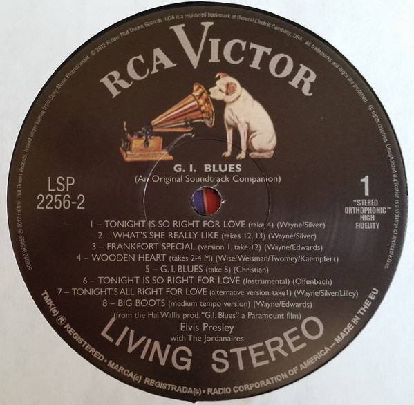 ELVIS IN G.I. BLUES Side A: Tonight Is So Right For Love (take 4)/ What's She Really Like (takes 12, 13)/ Frankfort Special (version 1, take 12)/ Wooden Heart (takes 2-4M)/ G.I. Blues (take 5)/ Tonight Is So Right For Love (instrumental) (2:14) (Barcarolle from "The Tales Of Hoffman" by Jacques Offenbach)/ Tonight's All Right For Love (alternative version, take1)/ Big Boots (medium tempo version) Side B: Pocketful Of Rainbows (version 1, take 10)/ Shoppin' Around (version 1, take 5)/ Big Boots (slow version, takes 2, 3)/ Didja' Ever (take 1)/ Shoppin' Around (instrumental, take 4)/ Doin' The Best I Can (takes 1-3)/ Doin' The Best I Can (takes 4-7) Side C: Tonight Is So Right For Love/ What's She Really Like/ Frankfort Special/ Wooden Heart/ G.I. Blues/ Bonus Tracks: Tonight Is So Right For Love (alternative version)/ G.I. Blues (take 1)/ Wooden Heart (take 1) Side D: Pocketful Of Rainbows/ Shoppin' Around/ Big Boots/ Didja' Ever/ Blue Suede Shoes/ Doin' The Best I Can/ Bonus Track: Doin' The Best I Can (takes 8, 9) Released: January 2013 Cat.-No.: LSP-2256/-2 (506020-975053) Format: 12'' / 33 ? rpm (2 Record Set) |