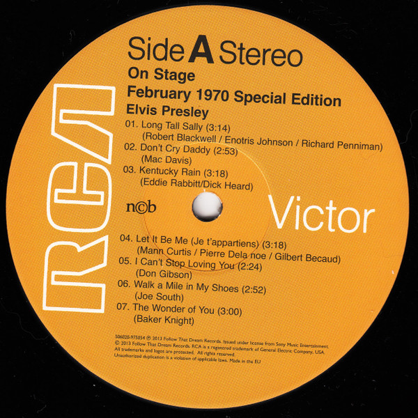 ON STAGE - SPECIAL EDITION Side A: Long Tall Sally/ Don't Cry Daddy/ Kentucky Rain/ Let It Be Me (Je t'appartiens)/ I Can't Stop Loving You/ Walk a Mile in My Shoes/ The Wonder Of You Side B: See See Rider/ Proud Mary/ Sweet Caroline/ Runaway/ Walk A Mile In My Shoes/ Release Me (And Let Me Love Again)/ Polk Salad Annie Side C: Hound Dog/ Love Me Tender/ Kentucky Rain/ Let It Be Me (Je t'appartiens)/ I Can't Stop Loving You/ Walk a Mile in My Shoes/ In The Ghetto Side D: The Wonder Of You/ Release Me (And Let Me Love Again)/ Polk Salad Annie/ Introductions/ Suspicious Minds/ Can't Help Falling In Love Released: April 2013 Cat.-No.: LSP-4362-2 (506020-975054) Format: 12'' / 33 ? rpm (2 Record Set) |