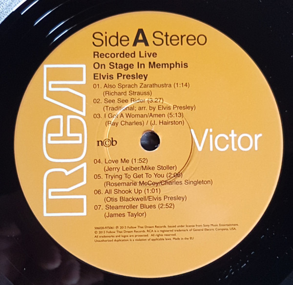ELVIS RECORDED LIVE ON STAGE IN MEMPHIS Side A: Also Sprach Zarathustra/ See See Rider/ I Got A Woman-Amen/ Love Me/ Trying To Get To You/ All Shook Up/ Steamroller Blues Side B: (Let Me Be Your) Teddy Bear-Don't Be Cruel/ Love Me Tender/ Long Tail Sally-Whole Lotta Shakin' Goin' On-Mama Don't Dance-Flip, Flop And Fly-Jailhouse Rock-Hound Dog/ Fever/ Polk Salad Annie/ Why Me Lord? Side C: How Great Thou Art/ Suspicious Minds/ Band Introductions/ Blueberry Hill-I Can't Stop Loving You/ Help Me Side D: An American Trilogy/ Let Me Be There/ My Baby Left Me/ Lawdy, Miss Clawdy/ Funny How Time Slips Away/ Can't Help Falling In Love Released: July 29, 2013 Cat.-No.: 506020-975061 Format: 12'' / 33 ? rpm (2 Record Set) |