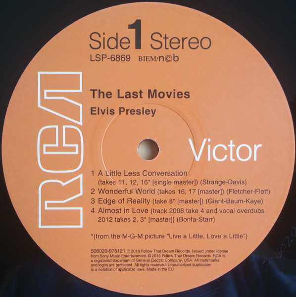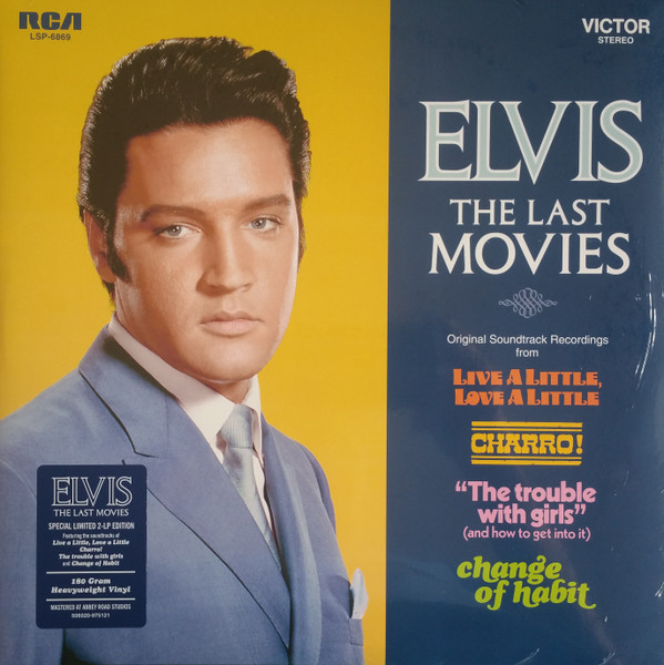 ELVIS - THE LAST MOVIES Side A: A Little Less Conversation (Take 11, 12, 16 - Single Master)/ Wonderful World (Take 16, 17 - Master)/ Edge Of Reality (Take 8 - Master)/ Almost In Love (Track 2006 Take 4 And Vocal Overdubs 2012 Take 2, 3 - Master) Side B: A Little Less Conversation (Take 1, 2)/ Wonderful World (Take 2, 3)/ Edge Of Reality (Take 3)/ Wonderful World (Take 7 - Movie Master)/ A Little Less Conversation (Take 10 - Album Master)/ Edge Of Reality (Take 5, 6 - Alternate Master) Side C: Charro/ Let's Forget About The Stars (Rough Mix)/ Clean Up Your Own Back Yard/ Swing Down Sweet Chariot (Female Vocals And Brass Overdub)/ Almost/ Signs Of The Zodiac (Duet With Marlyn Mason)/ College Songs Medley (Far Above Cayuga’s Waters - Boola Boola - Dartmouth’s In Town Again - The Eyes Of Texas - On, Wisconsin - The Whiffenpoof Song - Fair Harvard - Notre Dame - Violet) Side D: Change Of Habit/ Let’s Be Friends/ Have A Happy/ Let Us Pray (Alternate Vocal Overdub)/ Rubberneckin'/ Almost (Take 29)/ Charro (Rough Mix) Released: May 2018 Cat.-No.: LSP-6869 Format: 12'' / 33 ? rpm (2 Record Set) |