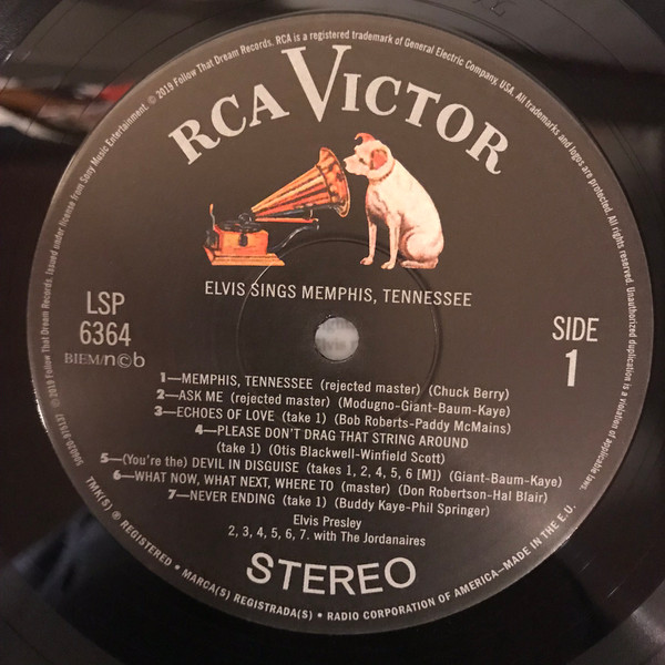 SINGS MEMPHIS, TENNESSEE Side A: Memphis, Tennessee (Rejected Master)/ Ask Me (Rejected Master)/ Echoes Of Love (Take 1)/ Please Don't Drag That String Around (Take 1)/ (You're The) Devil In Disguise (Take 1, 2, 4, 5, 6 Master)/ What Now, What Next, Where To (Master)/ Never Ending (Take 1) Side B: (It’s A) Long Lonely Highway (Master)/ Witchcraft (Take 1)/ Finders Keepers, Losers Weepers (Take 1)/ Love Me Tonight (Take 1)/ Memphis, Tennessee (Take 1 - 12.01.1964)/ Ask Me (Take 1, 2 - 12.01.1964)/ Western Union (Take 1)/ Please Don't Drag That String Around (Take 2) Side C: Slowly But Surely (Take 1)/ Never Ending (Take 2, 3 Master)/ (You're The) Devil In Disguise (Take 3)/ Please Don't Drag That String Around (Take 3, 4, 5)/ Witchcraft (Take 2)/ Ask Me (Take 5, 6 - Alternate Rejected Master) Side D: (It’s A) Long Lonely Highway (Master)/ Witchcraft (Take 1)/ Finders Keepers, Losers Weepers (Take 1)/ Love Me Tonight (Take 1)/ Memphis, Tennessee (Take 1 - 12.01.1964)/ Ask Me (Take 1, 2 - 12.01.1964)/ Western Union (Take 1)/ Please Don't Drag That String Around (Take 2) Released: August 2019 Cat.-No.: LSP-6364 Format: 12'' / 33 ? rpm (2 Record Set) |