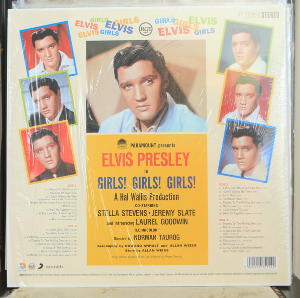 GIRLS! GIRLS! Side A: Return To Sender - Because Of Love - I Don’t Wanna Be Tied (Movie Version - Take 8 & Take 10 Intro) - Where Do You Come From (Take 13) - Mama - We’ll Be Together - A Boy Like Me, A Girl Like You (Take 1, 2) - Mama (Instrumental) Side B: Girls! Girls! Girls! - The Walls Have Ears - Earth Boy (Movie Version - Splice Of Take 2 & 4) - Thanks To The Rolling Sea (Take 3) - Where Do You Come From - Song Of The Shrimp - We’re Coming In Loaded - Mama (1970 "Let’s Be Friends"-Album Version) Side C: A Boy Like Me, A Girl Like You - I Don’t Wanna Be Tied - Earth Boy - Plantation Rock - Thanks To The Rolling Sea (Take 10) - Mama (Take 1, 2, 3, 4) - I Don’t Want To - We’ll Be Together (Take 8, 10) Side D: Thanks To The Rolling Sea - Mama (The Amigos) - A Boy Like Me, A Girl Like You (Take 3. 4) - Plantation Rock (Take 17 & Insert) - Mama (Take 5 - 8) - Mama (Take 9) - End Title: Dainty Little Moonbeams / Girls! Girls! Girls! Released: August 2021 Cat.-No.: SF-7534-2 (506020-975154) Format: 12'' / 33 ? rpm (2 Record Set) |