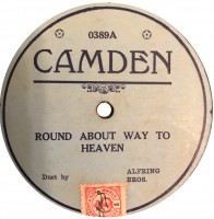 | We believe that underneath these Australian Camden labels, we will find a British Vocalion. In 1927, Vocalion introduced their 8"Broadcast label, having given up making 10" discs. Remaining stocks of the latter were jobbed off and exported to Australia, where Camden labels were affixed. So some Camdens will be electrically recorded, and some by the old mechanical system. It is the latter that qualifies them to appear on this page. There was also a light blue label of the same design with dark blue printing. | ||||