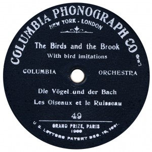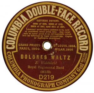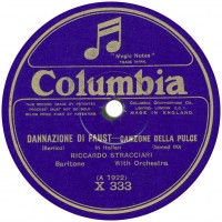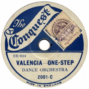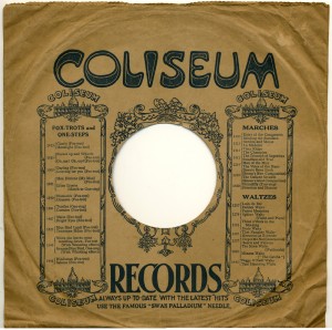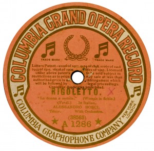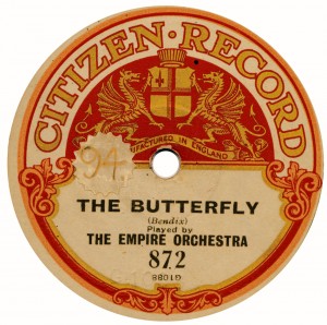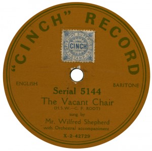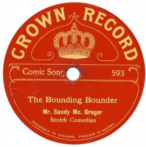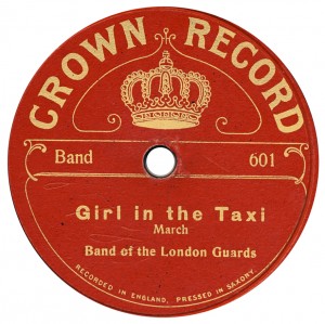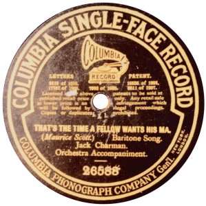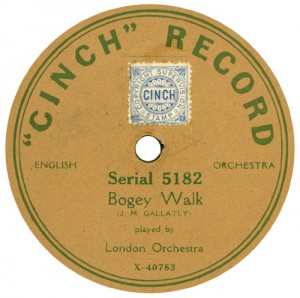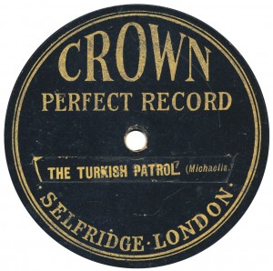 (sometimes just the title) on the original Columbia label underneath. The discs were recorded not later than 1905. Frank Andrews informed Arthur that single-sided Columbia were all deleted in 1908, so you may surmise that Selfridges bought some – or all – of the remaining stocks and stuck their own labels on them. Seven examples turned up together, but Arthur had never seen one before, thus making this label exceptionally scarce. Also we can also show another type, which differs by having only a ‘half-label’. Thus, Selfridge’s are not mentioned, and the disc actually displays not only the original Columbia catalogue number, but also the rightful maker. Obviously, we wonder which sort came first? Well, many early single-sided Columbias carried a ‘back sticker’ – a printed label listing patent numbers, resale price maintenance &c. (one type of these – there were several versions – may be seen under Columbia, above). Reports state that the ‘back sticker’ on one of these discs have been covered up with black paper. This must have been tedious, not to mention the cutting out of variously-shaped slots in the full Crown Perfect label. Accordingly, it is suggested that this ‘fiddly’ procedure was employed first; and that later, Selfridges abandoned it, settling for the half-label, either with or without the approval of Columbia. (26710 has no ‘back sticker’ anyway; its use was eventually abandoned by Columbia – another indicator that the half label is later?) |
