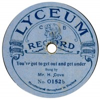 | There were two distinct incarnations of Lyceum. The ‘C B’ on the label stands for the wholesaler Cooper Brothers. Since 1912, CB’s only label had been Coliseum, but they must have felt another was needed, as the price war was raging in late 1913, and cheaper and cheaper discs were required. An initial batch of 87 discs, made in Germany by Beka, appeared first, by November 1913, in time for the Christmas trade. The colour of O-68 is an unusual variant – its other side is normal. However, the series did attain O-200 – but by this time War had broken out, and O-152 above is ‘manufactured throughout in England’. This type would have been pressed at the Lindström works in Hertford. Frank informs us that the (newly re-founded) Wm. Cooper Bros. Ltd. concern stopped promoting Lyceum records from November 1917. There was, however, a second incarnation of Lyceum a year or two later in an O-2000 series. Frank knows only of four examples, O2009 being the highest. These last issues, derived from the Sound Recording Co., ‘Popular’ masters and pressed by Crystalate, probably date from 1918-20 and are very scarce indeed. As you can see, they are printed on a much darker blue paper, and since the type is in dark blue as well, the labels are not terribly legible! In Lyceum we have a classic example of an always elusive label, yet which was produced in three different factories, with three quite different sources of repertoire none of which was actually original to Lyceum. | ||||