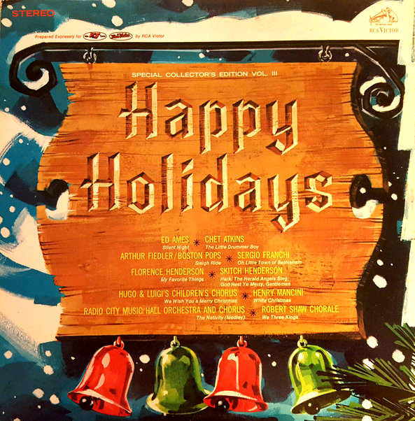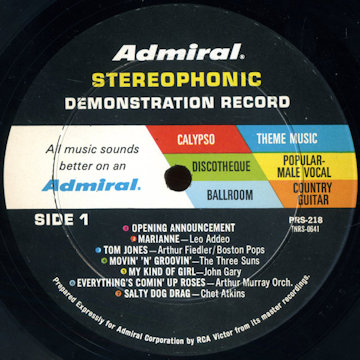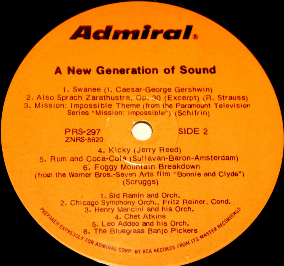 In mid-1963, RCA Special Products started noting the sponsors on the label itself, with a small curved note near the bottom of the label (far left). In the late 1960s, occasionally an orange label was used with the same design as the tan label shown below. |