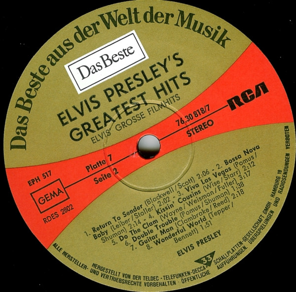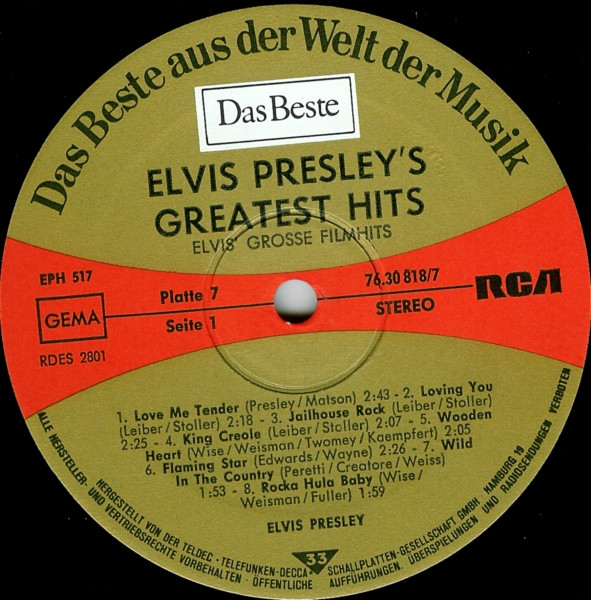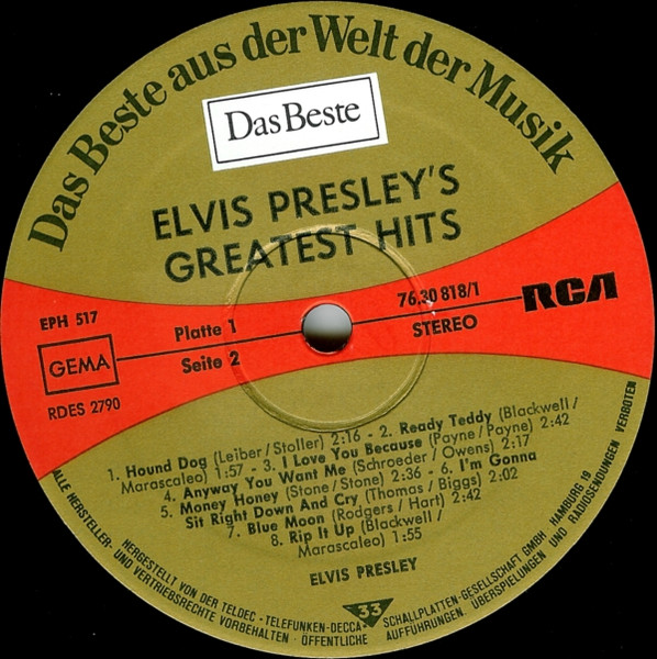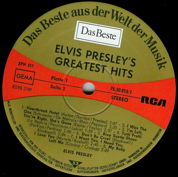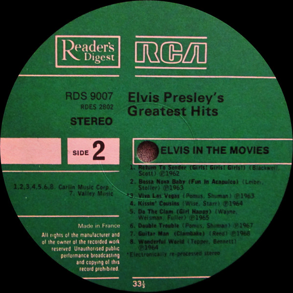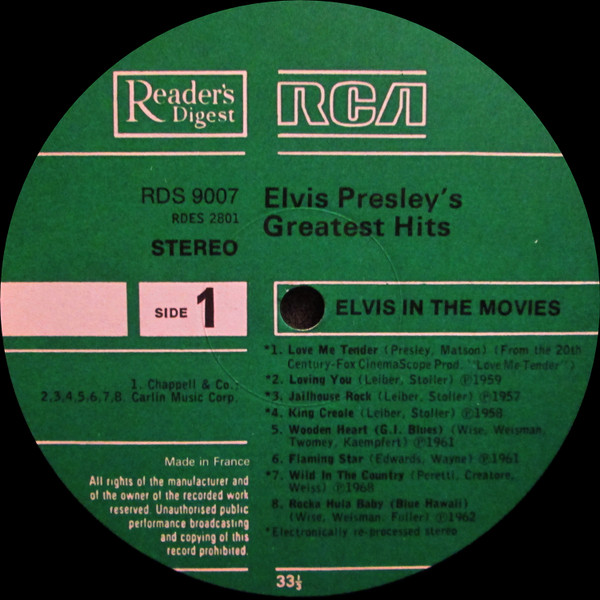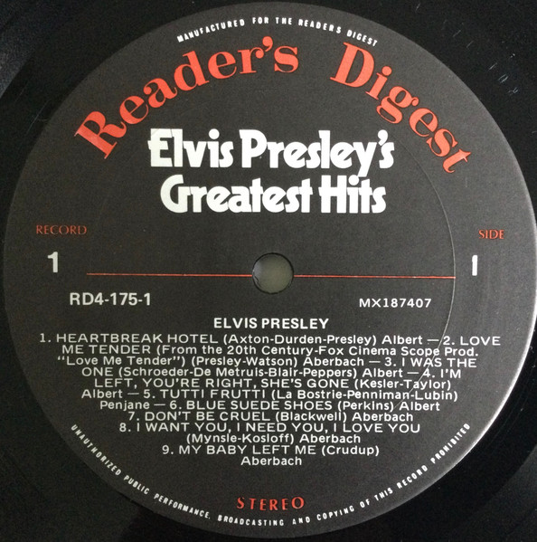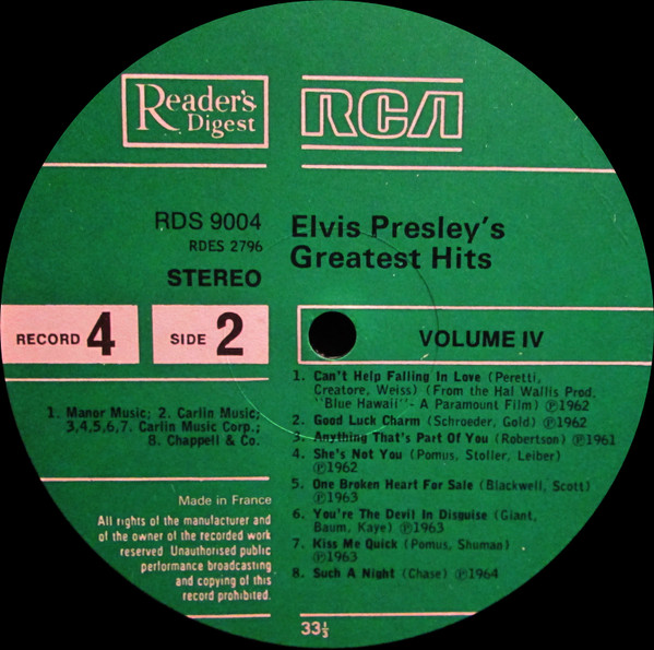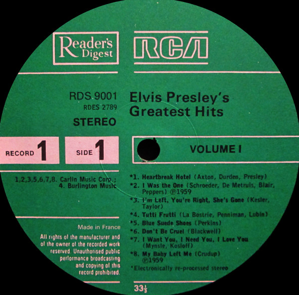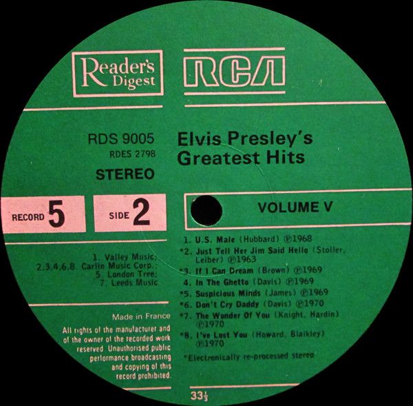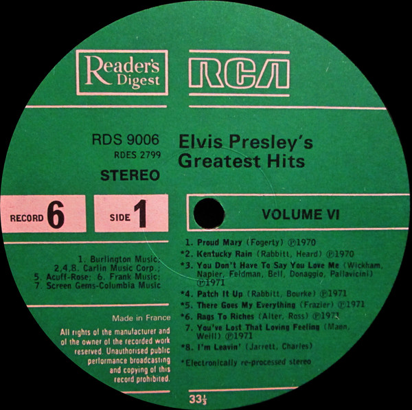 Presley's Greatest Hits Label: Reader's Digest – GELV-6A, RCA – GELV-6A Format: 6 x Vinyl, LP, Compilation, Vinyl, LP, Album, Compilation, Stereo, Box Set, Stereo, Sonopress Pressing Country: UK Released: 1975 RCA – GELV-6A, |