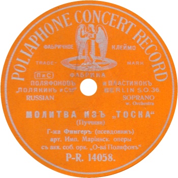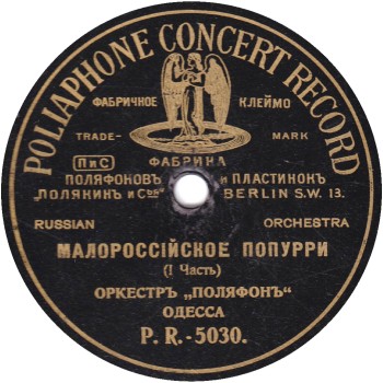 masters bought from German companies Stella, Beka and etc. Judging by the existing copies of records, the company achieved certain perfection in the business of copying somebody else's records: on this record the own announcement is attached to the copied phonogram! One can make this conclusion after careful listening to the record: the announcement sounds indistinctly and faintly, while the orchestra sounds brightly and richly. Supposedly, for achieving this goal they used a pantograph with attached to it mouthpiece. The process might work this way: first they started the recorder, then spoke necessary phrase into the mouthpiece, then without stopping started the playback of the original record. Since all records have more or less prolonged lead-in groove, there should be a lapse between the end of the phrase and the beginning of the actual sound - this is exactly what we observe! Usually there is no such delay on the original recordings. Using this hi-tech technology combined with social skills of Poliakin-senior explains the fact why "all attempts of thieved artists to stop the illegal business ended up without success - wise Poliakin-senior befriended with local police as well as with fathers of the city, so they closed their eyes on all his pranks".After passing of the Copyright Law in March 20, 1911, the company began making its own recording, mostly with folk music. |