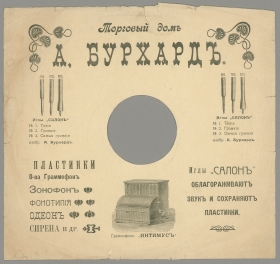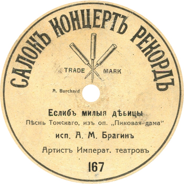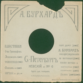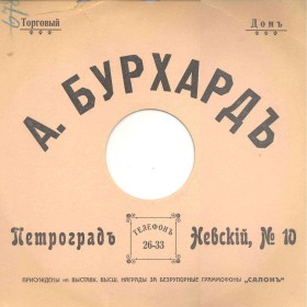 | August Friedrich Burchard had a shop in St.-Petersburg, he also was known as businessman, engineer and inventor. The advertisement about gramophone records, recorded and printed by his order, was published in the Grammofonnij Mir (The Gramophone World) magazine (December 5, 1911, ? 22-23, p. 25). Currently it is not known on which plant the records were pressed, supposenly it is Metropol Record that used to take such kinds of orders. The beginning did not have further development, no more Salon Record were evere issued. Currently, Salon Record records are extreme collection rarity. They have "grand" format and bright labels with August Burchard's trademark that depicts a special needle that looks like a pen point. On Salon Record records were featured famous St.-Petersburg singers M.Michailova, N.Bolshakov, A.Bragin, M.A.Emskaya and etc. | |||