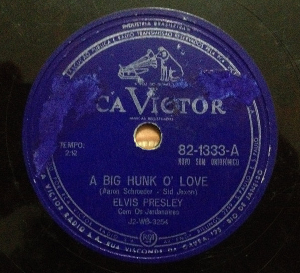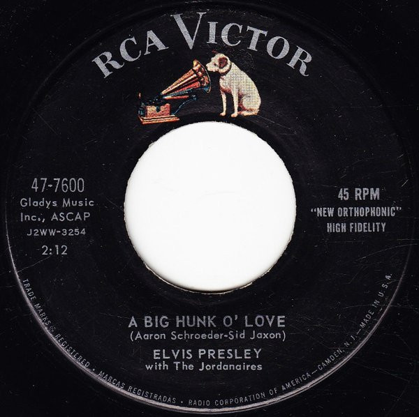 Big Hunk O' Love ** Record Company Radio Corporation Of America Indianapolis pressing with Black label, dog on top. 45 RPM on side. On A BIG HUNK O' LOVE side, Gladys Music Inc., ASCAP on left side. Writer credits Aaron Schroeder - Sid Jaxon. Side A published by Gladys Music, Inc. ASCAP Matrix / Runout (Side A Label): J2WW-3254 |