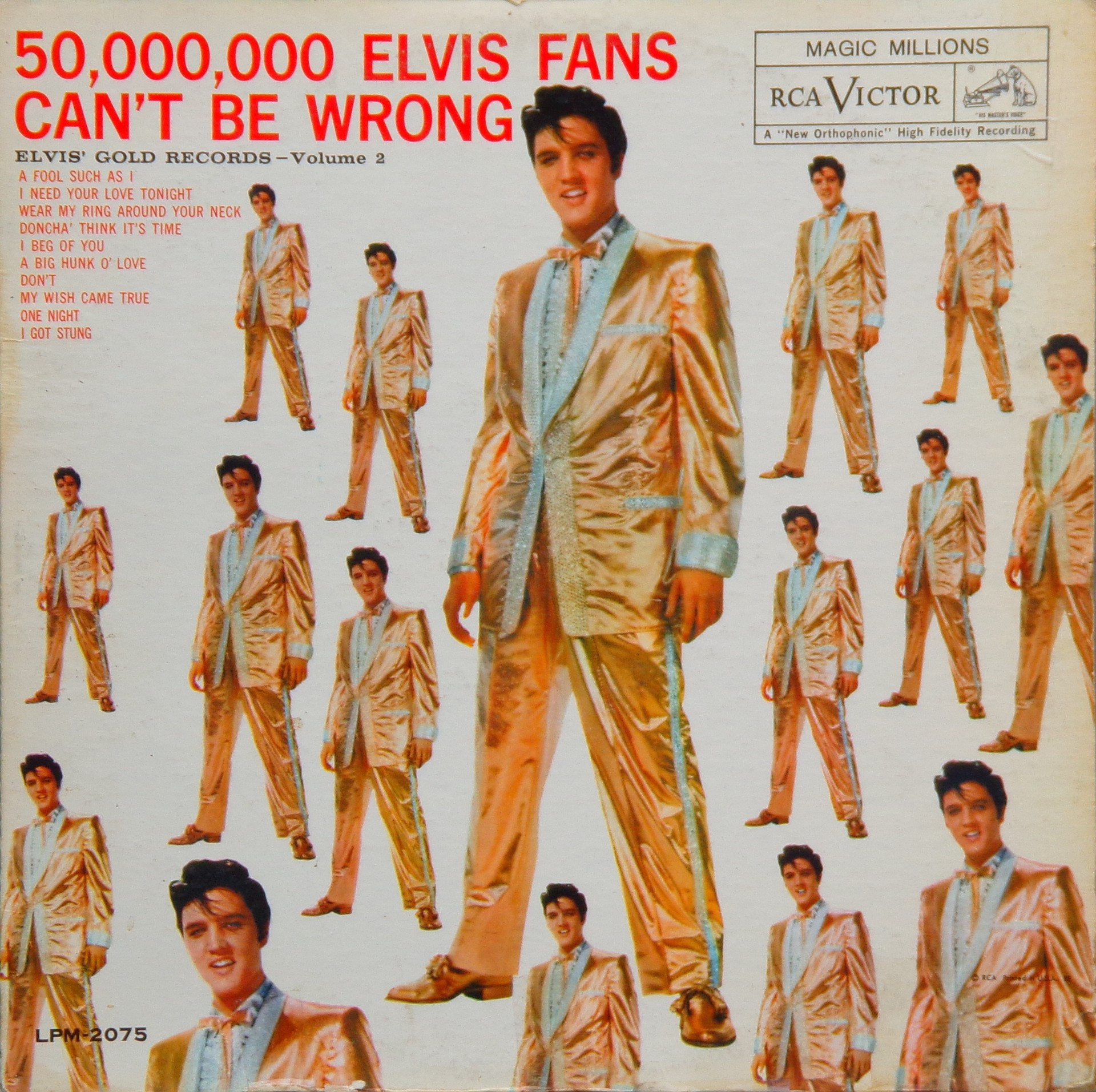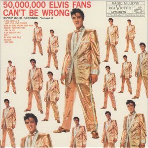 ELVIS FANS CAN'T BE WRONG (LP) 50,000,000 Elvis Fans Can't Be Wrong: Elvis' Gold Records - Volume 2 is the ninth album by Elvis Presley, issued on RCA Victor Records (LPM 2075) in November 1959. It is a compilation of hit singles released in 1958 and 1959 by Presley, from two recording sessions in June 1958 at RCA Studios in Nashville and three at Radio Recorders in Hollywood. The album peaked at #31 on the Billboard Top Pop Albums chart, and is considered to be one of the most successful and influential compilation albums of all time. It was certified Gold on 11/1/1966 and Platinum on 3/27/1992 by the R.I.A.A. Gold Records Vol. 2 comprises every single, both A-sides and B-sides, released by Presley during 1958 and 1959, with the exception of "Hard Headed Woman" backed with "Don't Ask Me Why," both of which having been previously issued on King Creole. The singles all made the Top Five on the Billboard Hot 100, and the b-sides all charted in the Top 40 independently of the hit sides. In the 1950s, a gold record awarded for a single referred to sales of one million units, different from the definition in use by the late 1970s for albums, where a gold record came to mean sales of 500,000 units. Exact sales figures from the RIAA for each record, however, are difficult to confirm. Although RCA executive Steve Sholes was the in-house A&R man for Presley, and nominally in charge of his recording sessions at RCA, accounts by Presley historian Peter Guralnick and Presley discographer Ernst Mikael Jorgensen indicate that Presley himself acted as the producer for his RCA sessions in the 1950s. Front Cover : Elvis in his famous gold suit. Catalogue number top right