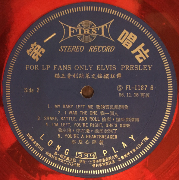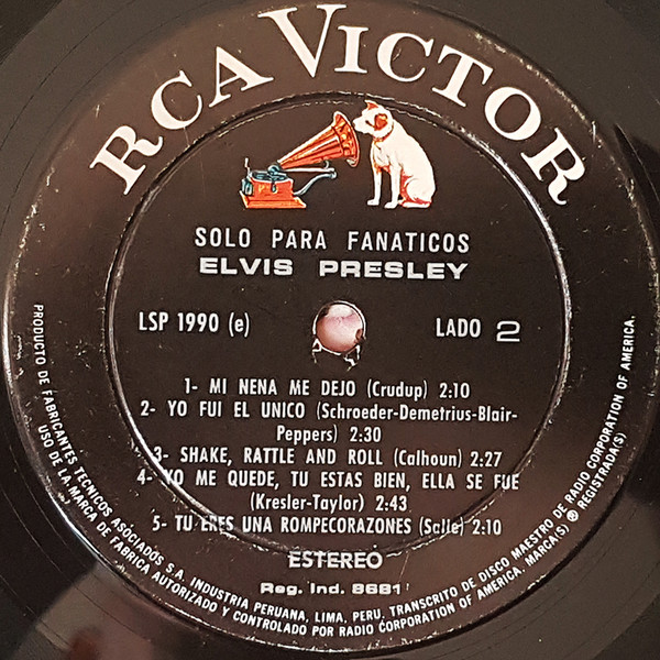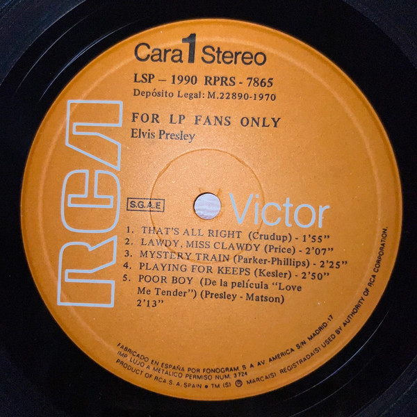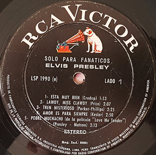 | For Lp Fans Only Label: RCA LSP 1990 01: Esta Muy Bien (That's All Right) 02: Lawdy, Miss Clawdy 03: Tren Misterioso (Mystery Train) 04: Amor Es Para Siempre (Playing For Keeps) 05: Pobre Muchacho (Poor Boy) Side 2: 01: Mi Nena Me Dejo (My Baby Left Me) 02: Yo Fui El Unico (I Was The One) 03: Shake, Rattle And Roll 04: Yo Me Quede, Tu Estas Bien, Ella Se Fue (I'm Left, You're Right, She's Gone) 05: Tu Eres Una Rompecorazones (You're A Heartbreaker) Manufactured For FTA |