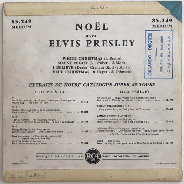 | Elvis Presley Noel Avec Elvis Label: RCA 86.249 Side 1: Side 2 Manufactured By AREA Made in France by AREA from RCA master recording Matrix / Runout (Side A (etched)): 71J2PH128 1D1 |