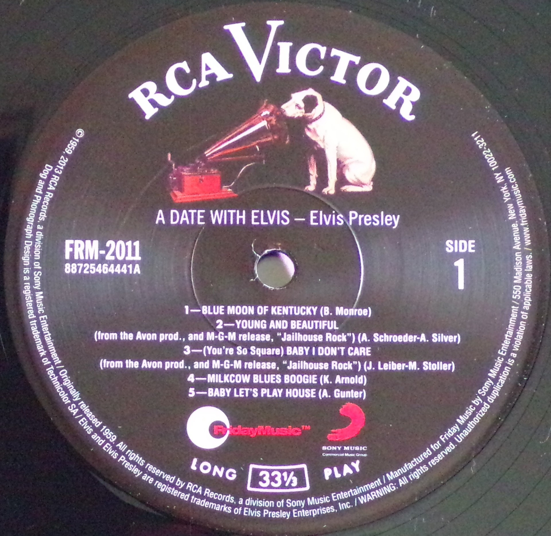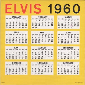 WITH ELVIS (LP) Brief History : A Date with Elvis is the eighth album by Elvis Presley, issued on RCA Victor Records (LPM 2011) in July 1959. It is a compilation of previously unreleased material from an August 1956 recording session at 20th Century Fox Stage One, two from Radio Recorders in Hollywood, and multiple sessions at Sun Studio. The album reached #32 on the Billboard Top Pop Albums chart. After Presley's induction into the army on March 24, 1958, RCA and his manager, Colonel Tom Parker, were faced with the prospect of keeping his name before the public for two years with no possibility of live performances, no movies, and with few unissued marketable recordings in the vault. A recording session was arranged for two days in June, which yielded enough items for five more single sides, singles being the commercial focus for rock and roll in the 1950s. Four of those tracks would be issued on 45s in 1958 and 1959 during his absence while doing military service. Presley, however, also did well in the albums market, all but one of his previous seven LPs charting no lower than #3, and RCA wished to continue promoting albums by Presley given his sales record. Much of Presley's material had not been released on LP, and for this album RCA collected material previously unavailable on album. Like its predecessor For LP Fans Only, this album featured tracks that had been issued on Sun Records with limited release, and were almost impossible to locate beyond certain parts of the south. The remaining five tracks derived from three different EPs issued in 1956 and 1957. Even by the standards of the late 1950s and early 1960s, where long-playing albums often ran to only about 35 minutes, this was a very short album at twenty-three minutes, and as such became the lowest charting Presley LP of the decade. RCA would squeeze one more album in 1959 out of previously issued material, the second singles collection, but it too would be a lower seller by previous standard. Presley would return from overseas in 1960 to commence proper recording again. this album also folds out to be a calendar for the year 1960. Front Cover : 4 Elvis photos. Catalogue number top right. Red sticker