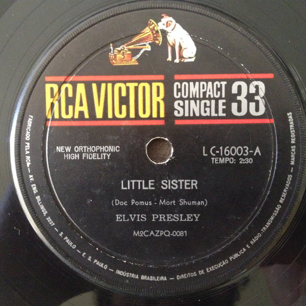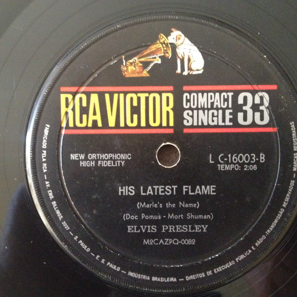 Label: RCA Victor – LC-16003 Format: Vinyl, 7", 33 ? RPM, Single Country: Brazil Released: 1961 Brazilian edition in 33rpm, 1961, black label with Compact Single 33 red and yellow logo. Generic sleeve. Sides were switched from the US release. Track 2 appears on label as "His Latest Flame (Marle's The Name)". |