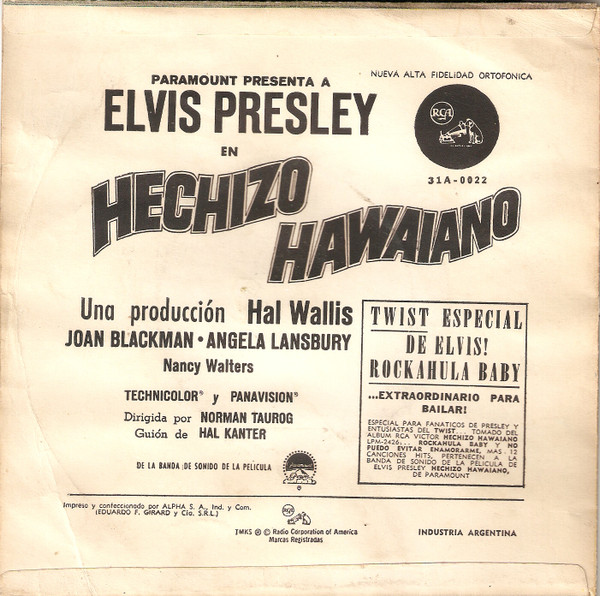 | Label: RCA Victor – 31A-0022 Format: Vinyl, 7", 33 ? RPM, Single Country: Argentina Released: 1961 Record Company – RCA Victor Argentina S.A.I.C. Both tracks : De La Pel. Paramount "Hechizo Hawaiano". Industria Argentina. Matrix / Runout (Label side A): MAHI-4412 |