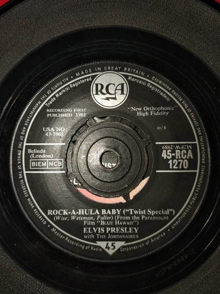 Label: RCA – 45-RCA 1270 Format: Vinyl, 7", Single, 45 RPM, Label variant, mispressing Country: UK Released: Jan 1962 Published By – Manor Music A-side text on label appears to be mispressed. Beneath the words "ELVIS PRESLEY" instead of saying "with THE JORDANAIRES" it says "Film "BLUE HAWAII")" Otherwise identical to Elvis Presley With The Jordanaires - Can't Help Falling In Love / Rock-A-Hula Baby ("Twist Special") Rights Society: BIEM NCB |