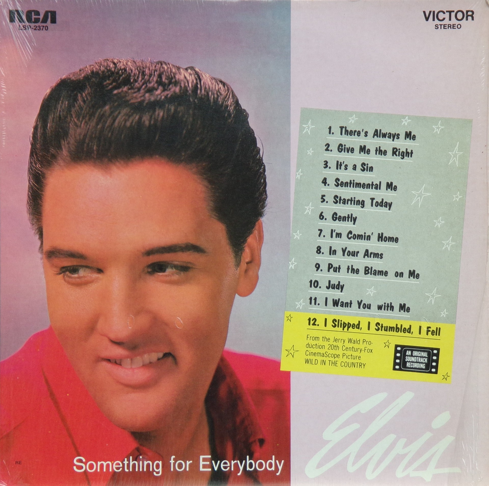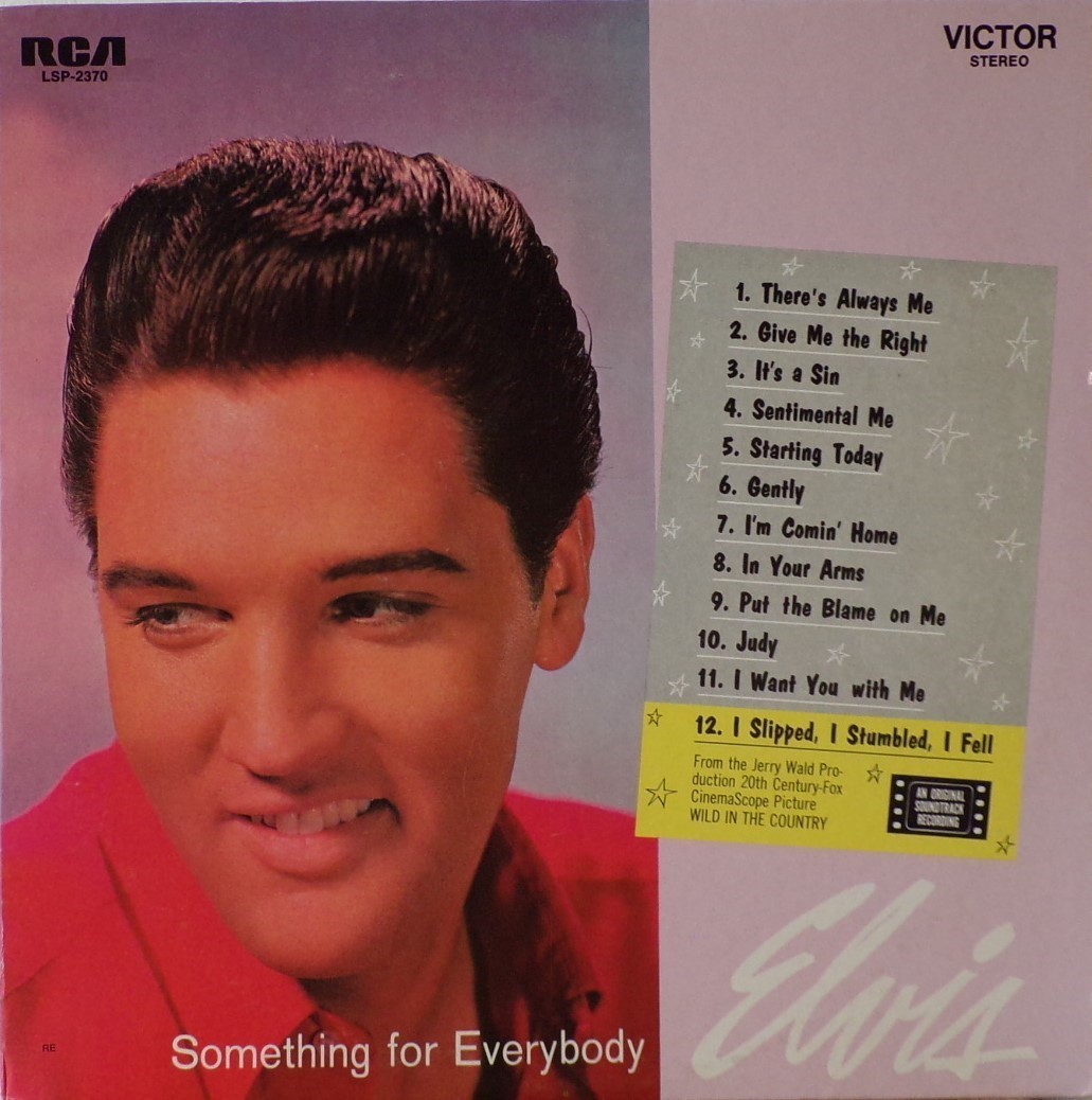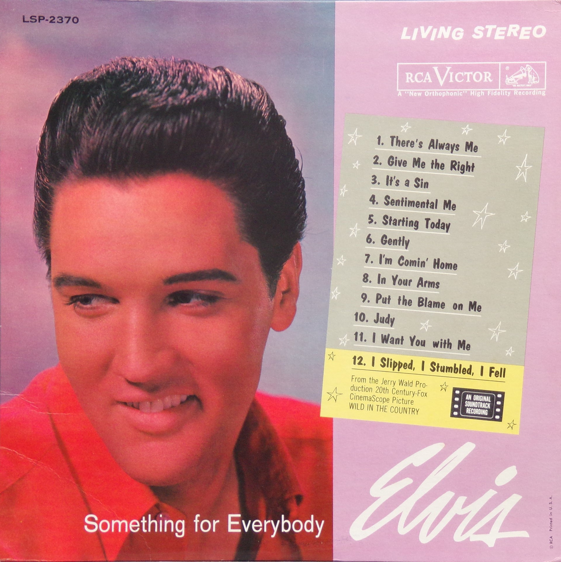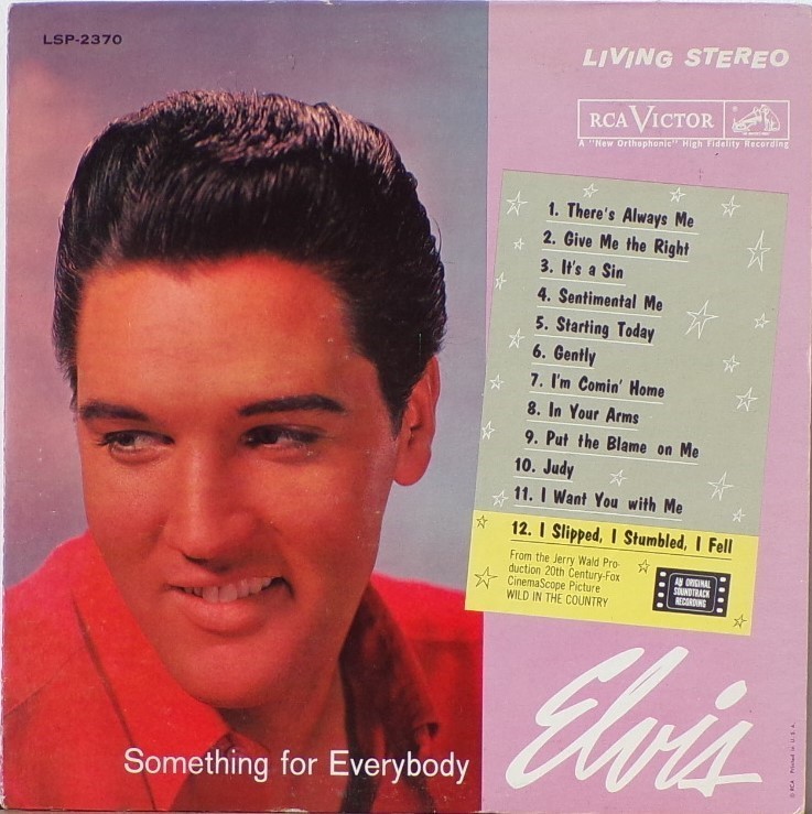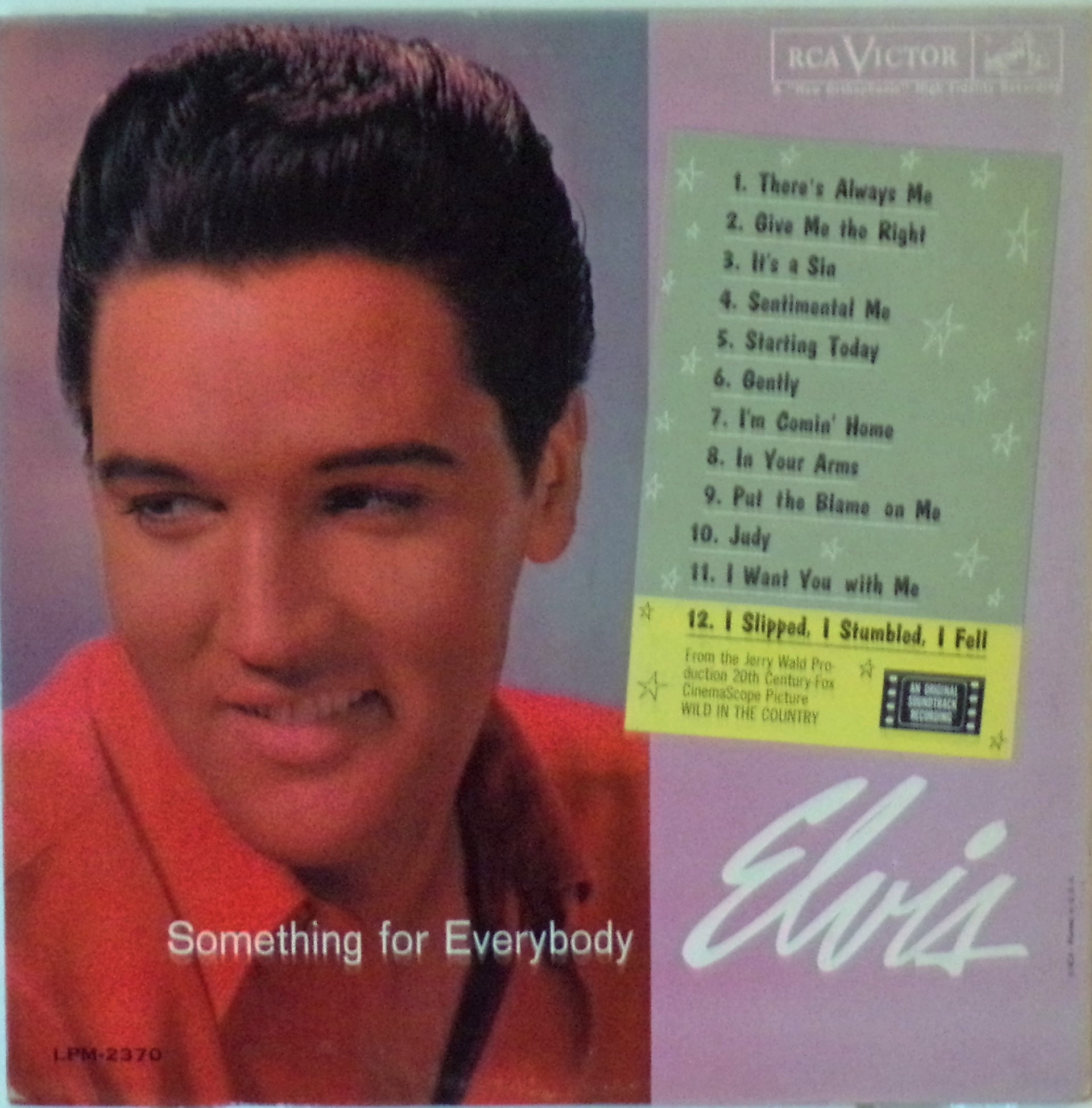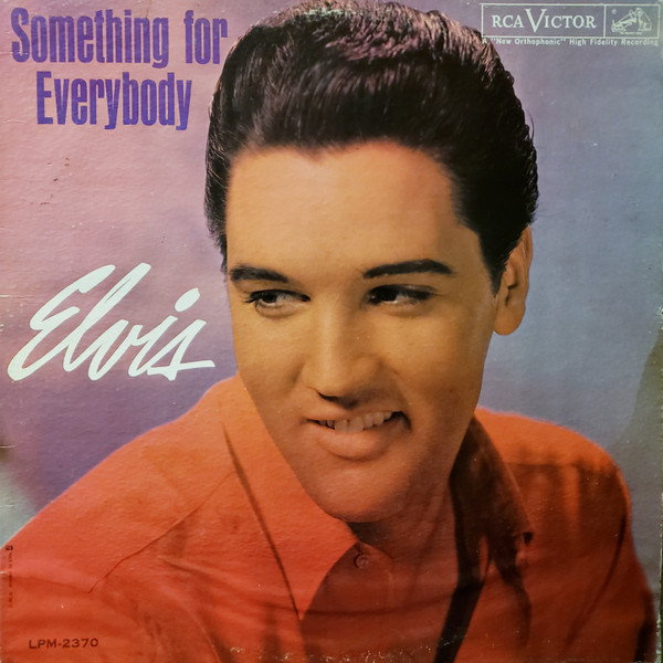 Radio Recorders, Hollywood, November 8, 1960 Something For Everybody is the thirteenth album by Elvis Presley, released on RCA Victor in mono and stereo, LPM/LSP 2370, in June 1961. Recording sessions took place on November 8, 1960, at Radio Recorders in Hollywood, and on March 12, 1961 at RCA Studio B in Nashville, Tennessee. It peaked at #1 on the Top Pop Albums chart. It was certified Gold on 7/15/1999 by the R.I.A.A. After his military discharge from the army in March 1960, any doubts about Presley's ability to recapture the momentum of his career in the 1950s had been laid to rest. During that year his three singles had all topped the charts, and his first album, Elvis Is Back!, had gone to #2 on the album chart. His musical film G.I. Blues had been wildly successful, its soundtrack also going to #1 on the album chart. Pressing on, he entered the familiar Studio B in Nashville and recorded eleven of the tracks for this album in one twelve-hour session, in addition to the single "I Feel So Bad". The single was initially scheduled to be the twelfth track for the album, but Presley chose it to accompany the title track to the film Wild in the Country as the promotional 45 for the film. Another track that had appeared in the film but not released commercially on records, "I Slipped, I Stumbled, I Fell", became the final track for the album. Front Cover : Photo of Elvis. Song titles to right. Catalogue number
