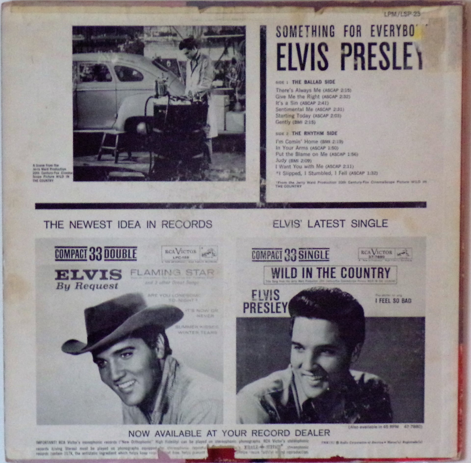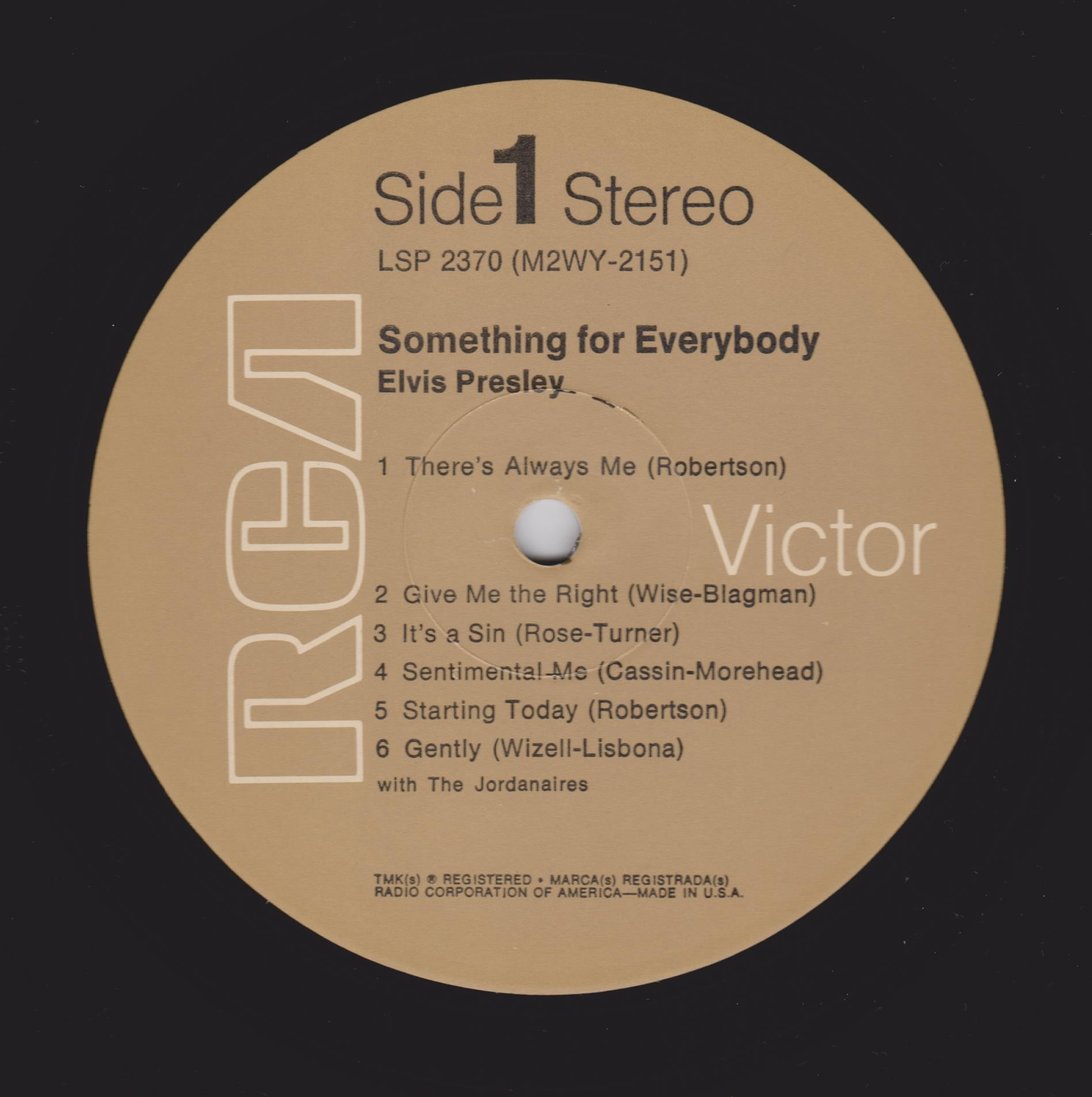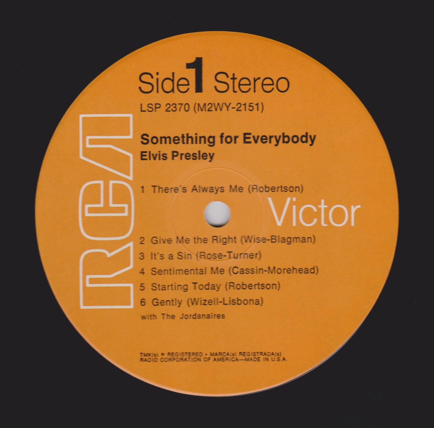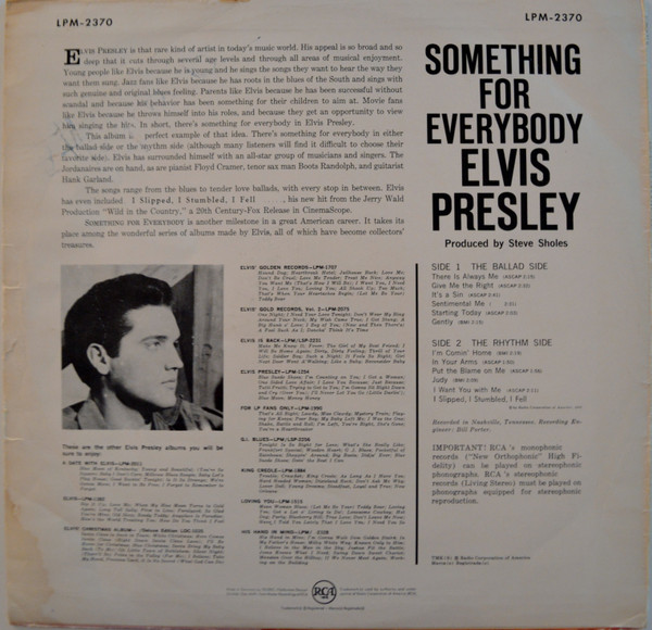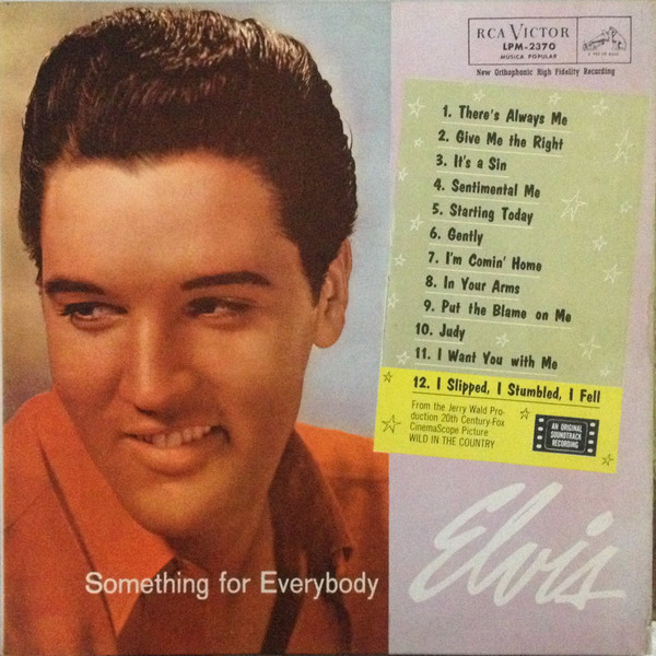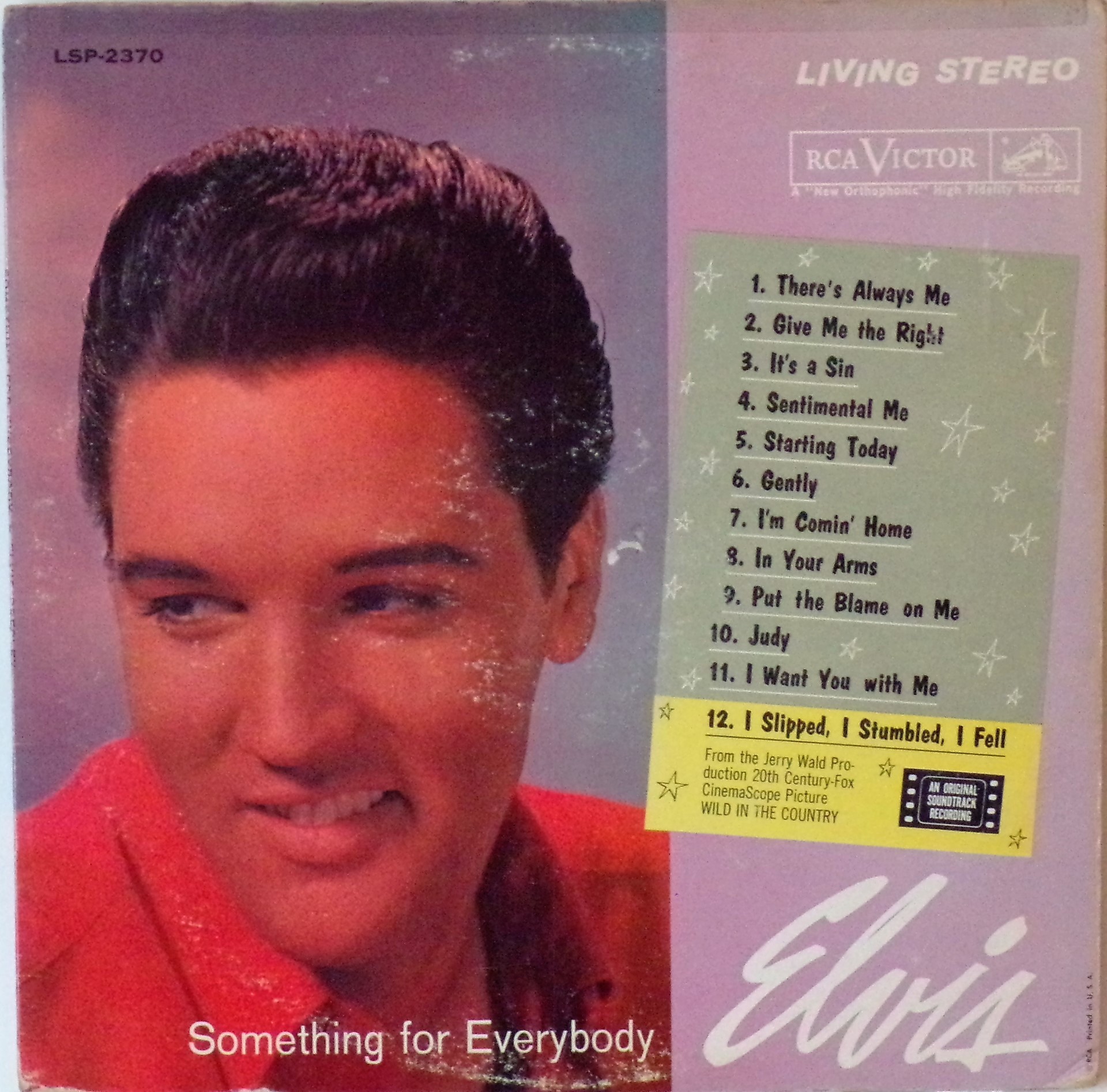 Radio Recorders, Hollywood, November 8, 1960 Something For Everybody is the thirteenth album by Elvis Presley, released on RCA Victor in mono and stereo, LPM/LSP 2370, in June 1961. Recording sessions took place on November 8, 1960, at Radio Recorders in Hollywood, and on March 12, 1961 at RCA Studio B in Nashville, Tennessee. It peaked at #1 on the Top Pop Albums chart. It was certified Gold on 7/15/1999 by the R.I.A.A. After his military discharge from the army in March 1960, any doubts about Presley's ability to recapture the momentum of his career in the 1950s had been laid to rest. During that year his three singles had all topped the charts, and his first album, Elvis Is Back!, had gone to #2 on the album chart. His musical film G.I. Blues had been wildly successful, its soundtrack also going to #1 on the album chart. Pressing on, he entered the familiar Studio B in Nashville and recorded eleven of the tracks for this album in one twelve-hour session, in addition to the single "I Feel So Bad". The single was initially scheduled to be the twelfth track for the album, but Presley chose it to accompany the title track to the film Wild in the Country as the promotional 45 for the film. Another track that had appeared in the film but not released commercially on records, "I Slipped, I Stumbled, I Fell", became the final track for the album. Front Cover : Photo of Elvis. Song titles to right. Catalogue number