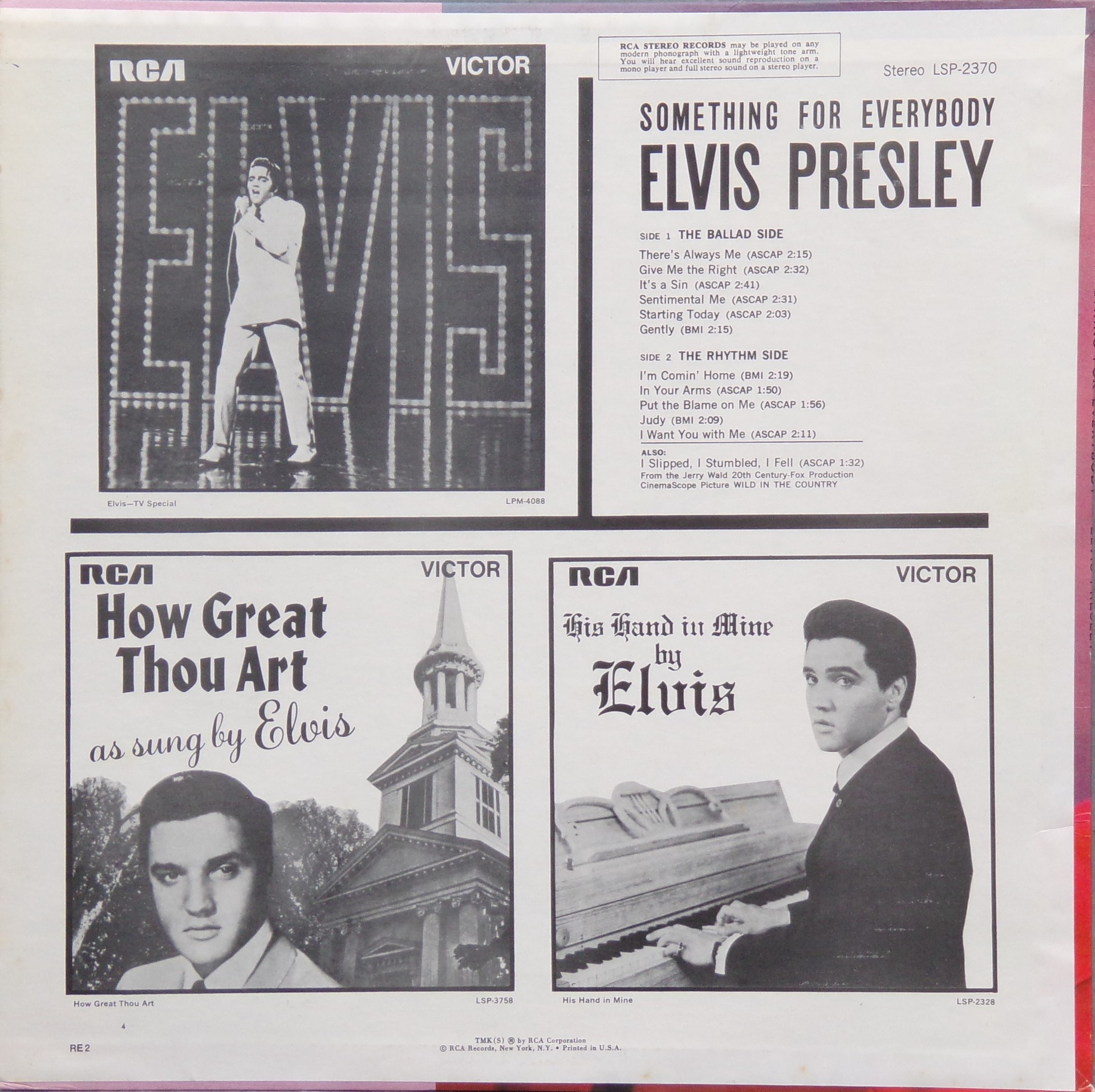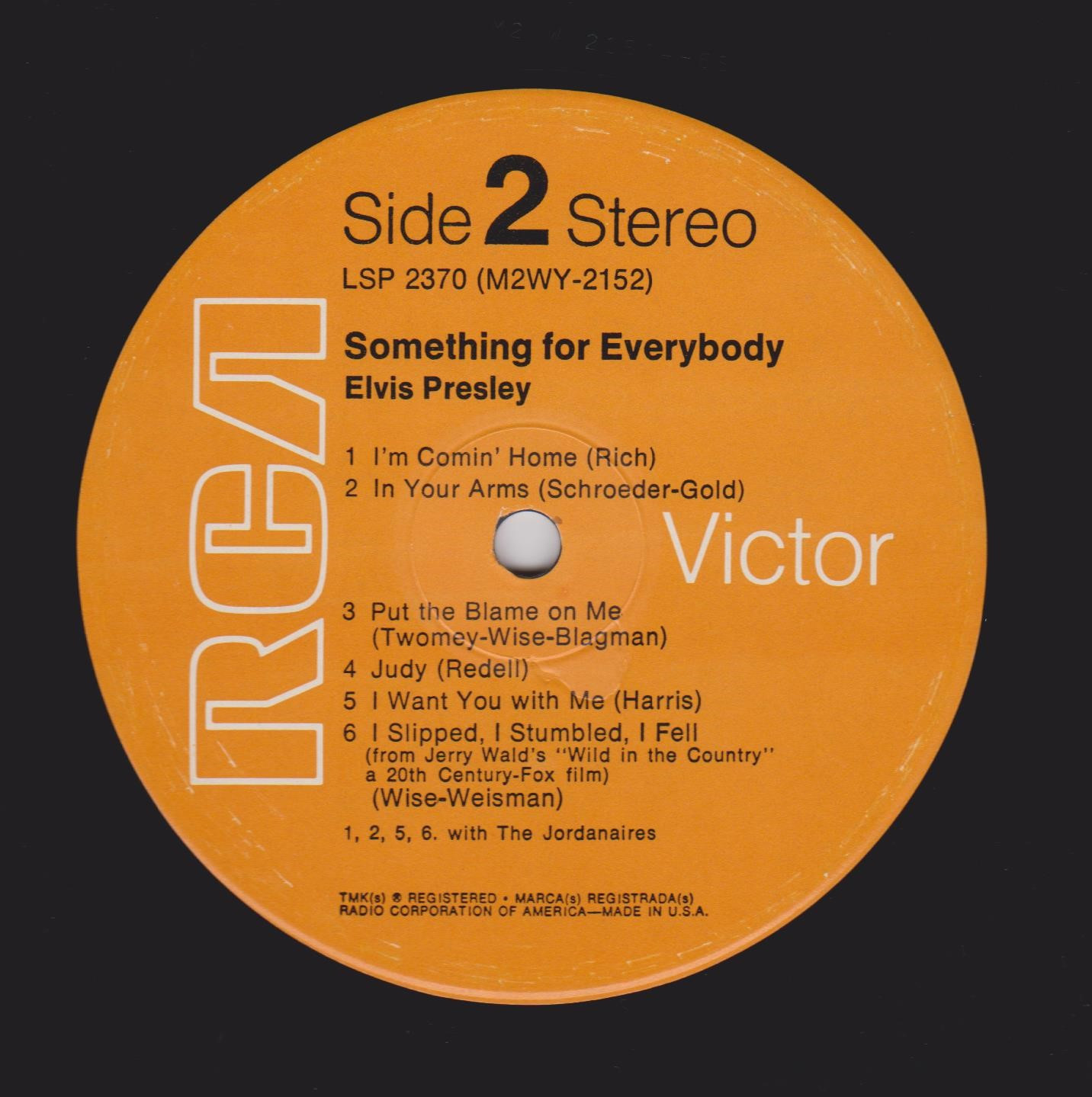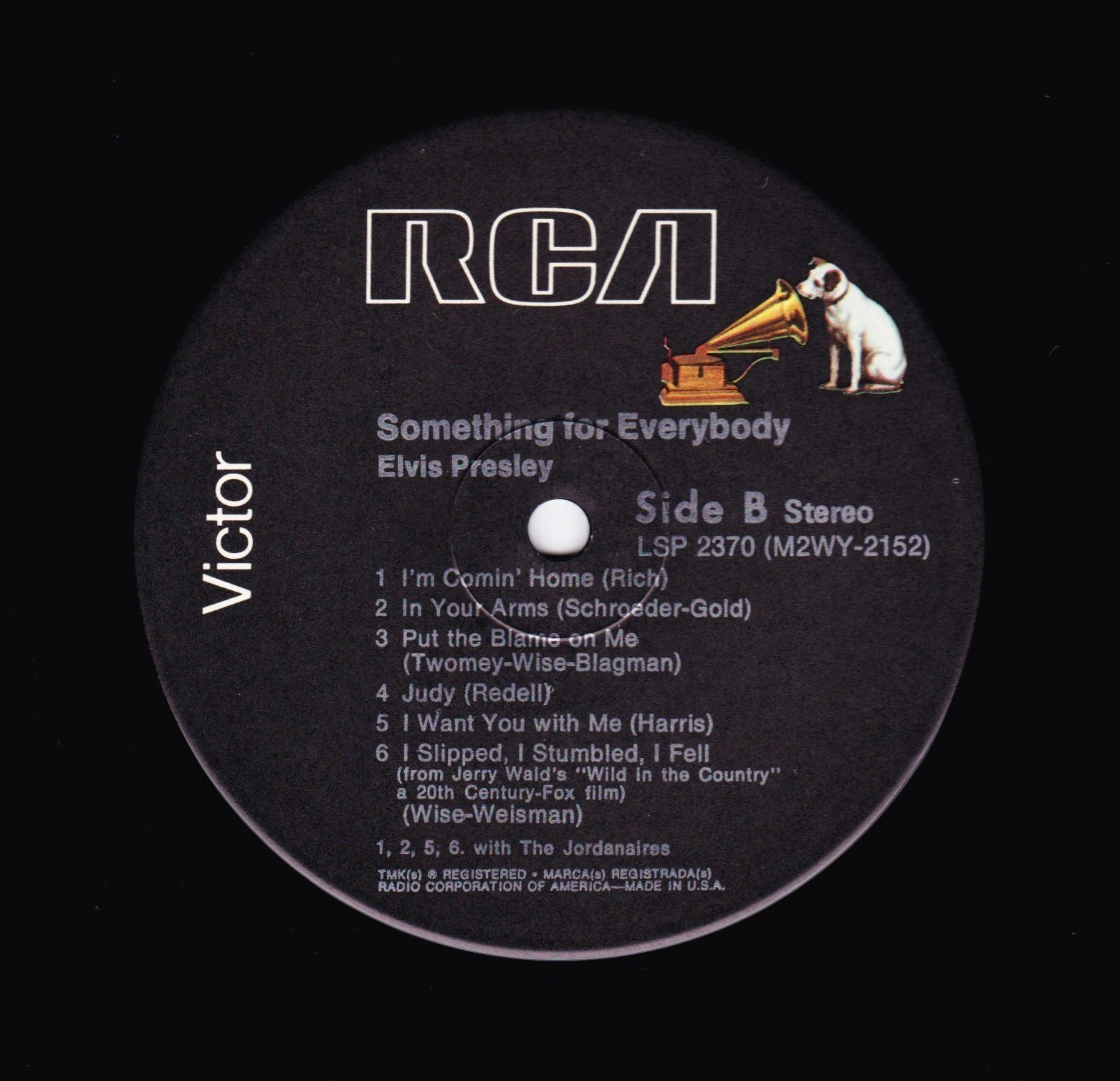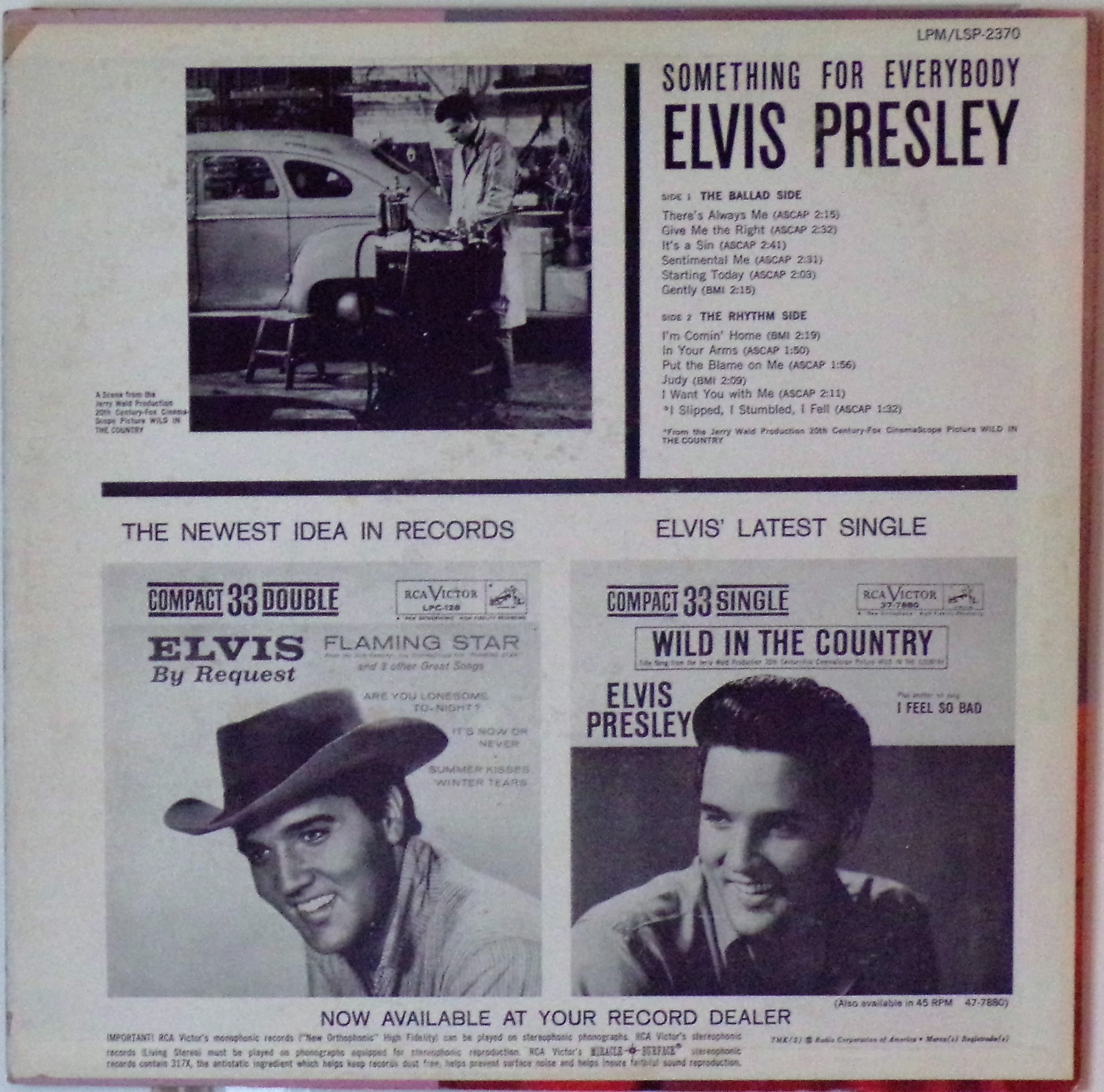 Radio Recorders, Hollywood, November 8, 1960 Something For Everybody is the thirteenth album by Elvis Presley, released on RCA Victor in mono and stereo, LPM/LSP 2370, in June 1961. Recording sessions took place on November 8, 1960, at Radio Recorders in Hollywood, and on March 12, 1961 at RCA Studio B in Nashville, Tennessee. It peaked at #1 on the Top Pop Albums chart. It was certified Gold on 7/15/1999 by the R.I.A.A. After his military discharge from the army in March 1960, any doubts about Presley's ability to recapture the momentum of his career in the 1950s had been laid to rest. During that year his three singles had all topped the charts, and his first album, Elvis Is Back!, had gone to #2 on the album chart. His musical film G.I. Blues had been wildly successful, its soundtrack also going to #1 on the album chart. Pressing on, he entered the familiar Studio B in Nashville and recorded eleven of the tracks for this album in one twelve-hour session, in addition to the single "I Feel So Bad". The single was initially scheduled to be the twelfth track for the album, but Presley chose it to accompany the title track to the film Wild in the Country as the promotional 45 for the film. Another track that had appeared in the film but not released commercially on records, "I Slipped, I Stumbled, I Fell", became the final track for the album. Front Cover : Photo of Elvis. Song titles to right. Catalogue number