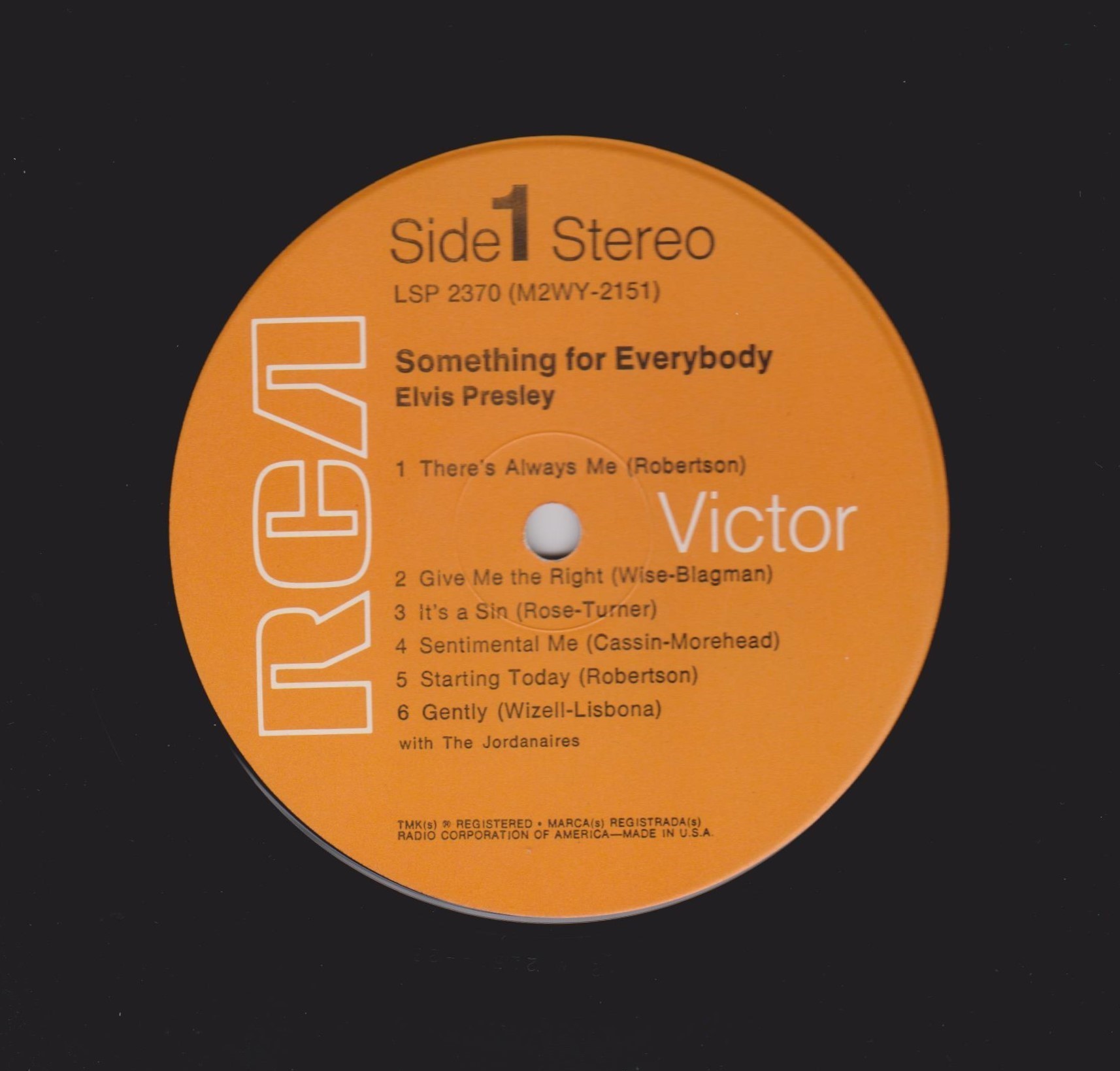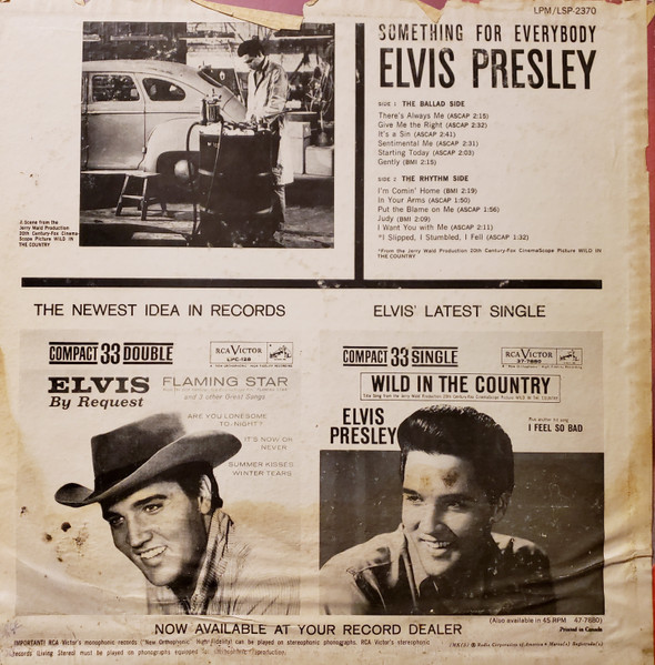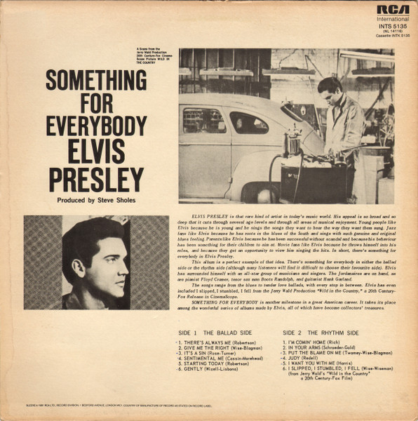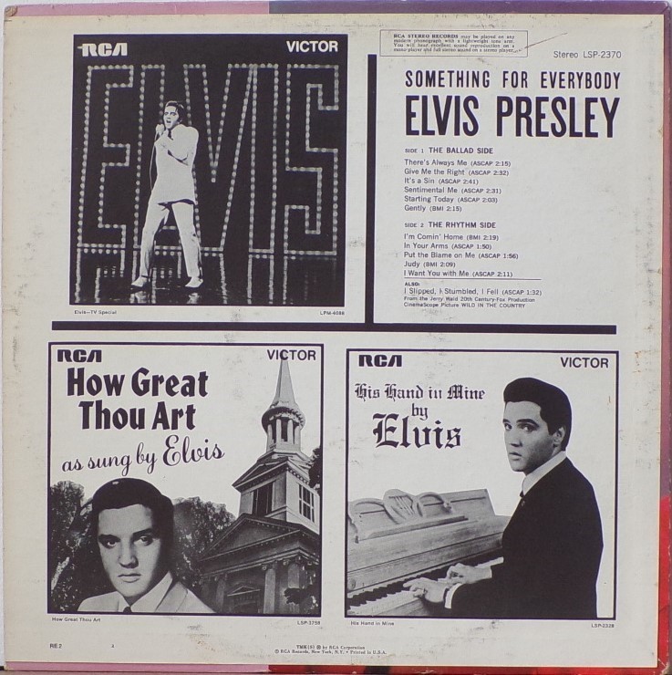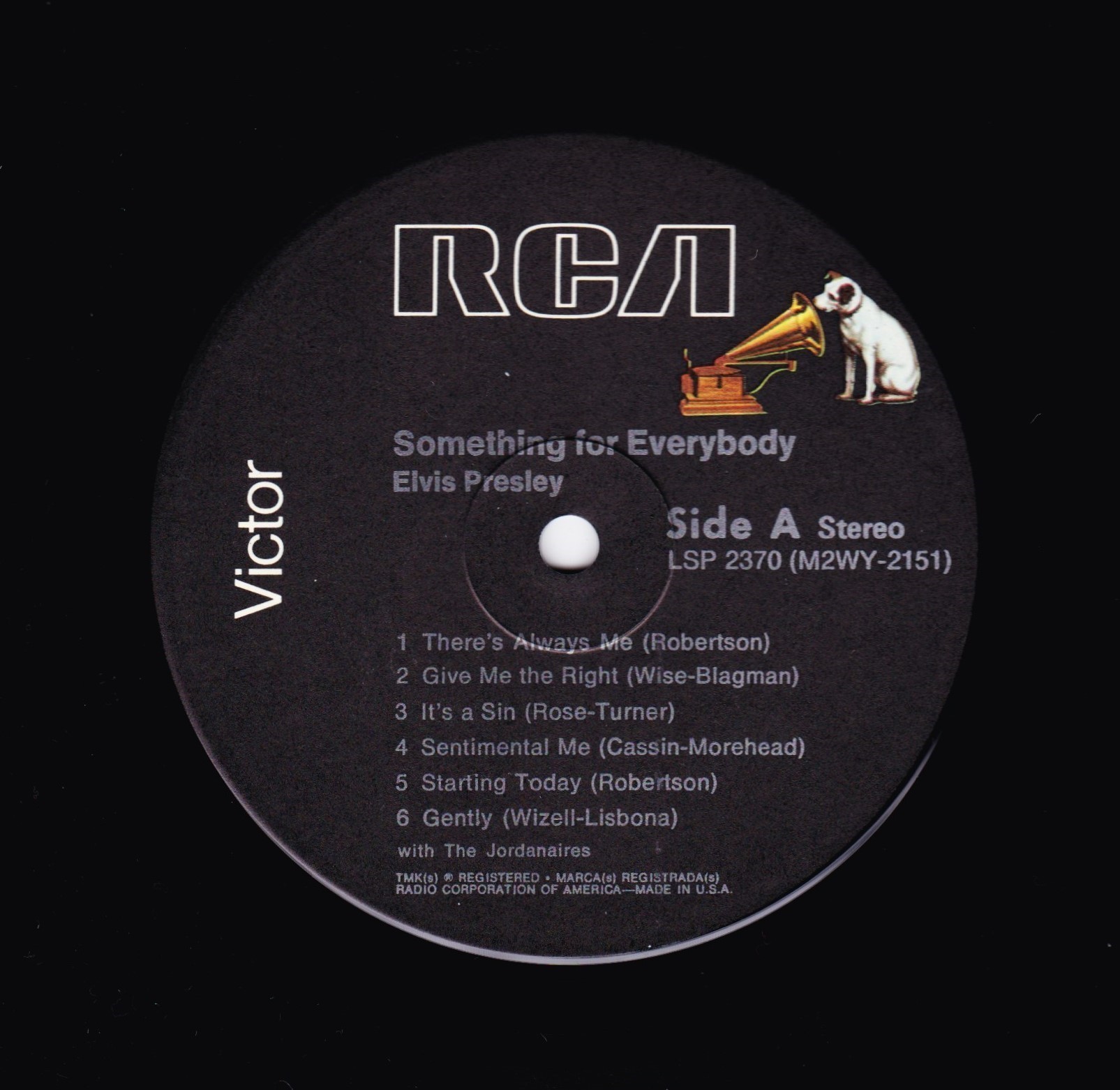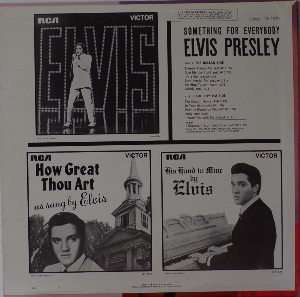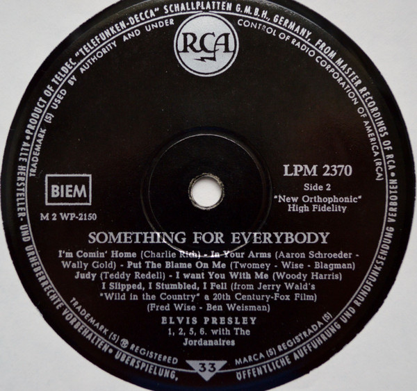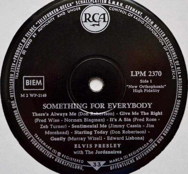 Radio Recorders, Hollywood, November 8, 1960 Something For Everybody is the thirteenth album by Elvis Presley, released on RCA Victor in mono and stereo, LPM/LSP 2370, in June 1961. Recording sessions took place on November 8, 1960, at Radio Recorders in Hollywood, and on March 12, 1961 at RCA Studio B in Nashville, Tennessee. It peaked at #1 on the Top Pop Albums chart. It was certified Gold on 7/15/1999 by the R.I.A.A. After his military discharge from the army in March 1960, any doubts about Presley's ability to recapture the momentum of his career in the 1950s had been laid to rest. During that year his three singles had all topped the charts, and his first album, Elvis Is Back!, had gone to #2 on the album chart. His musical film G.I. Blues had been wildly successful, its soundtrack also going to #1 on the album chart. Pressing on, he entered the familiar Studio B in Nashville and recorded eleven of the tracks for this album in one twelve-hour session, in addition to the single "I Feel So Bad". The single was initially scheduled to be the twelfth track for the album, but Presley chose it to accompany the title track to the film Wild in the Country as the promotional 45 for the film. Another track that had appeared in the film but not released commercially on records, "I Slipped, I Stumbled, I Fell", became the final track for the album. Front Cover : Photo of Elvis. Song titles to right. Catalogue number