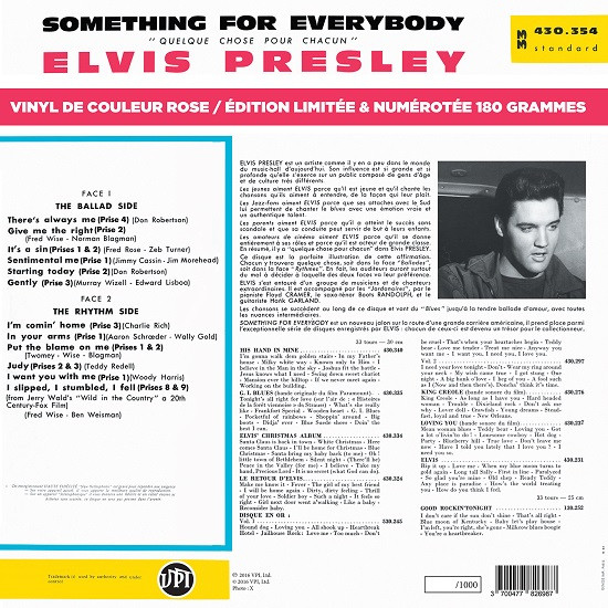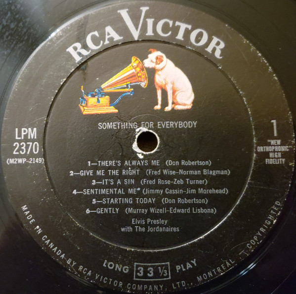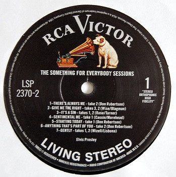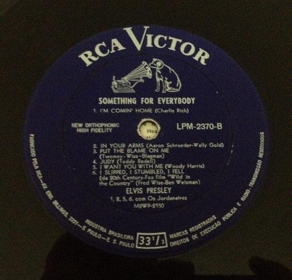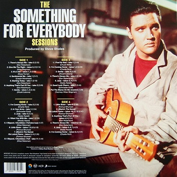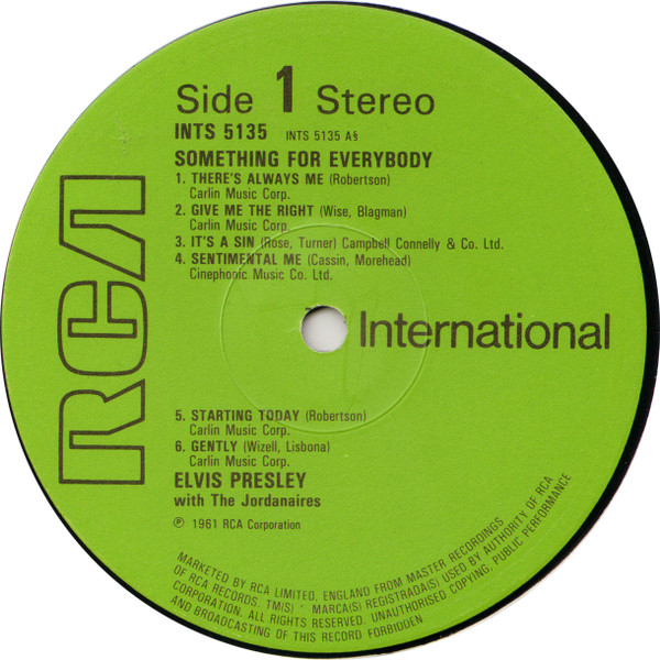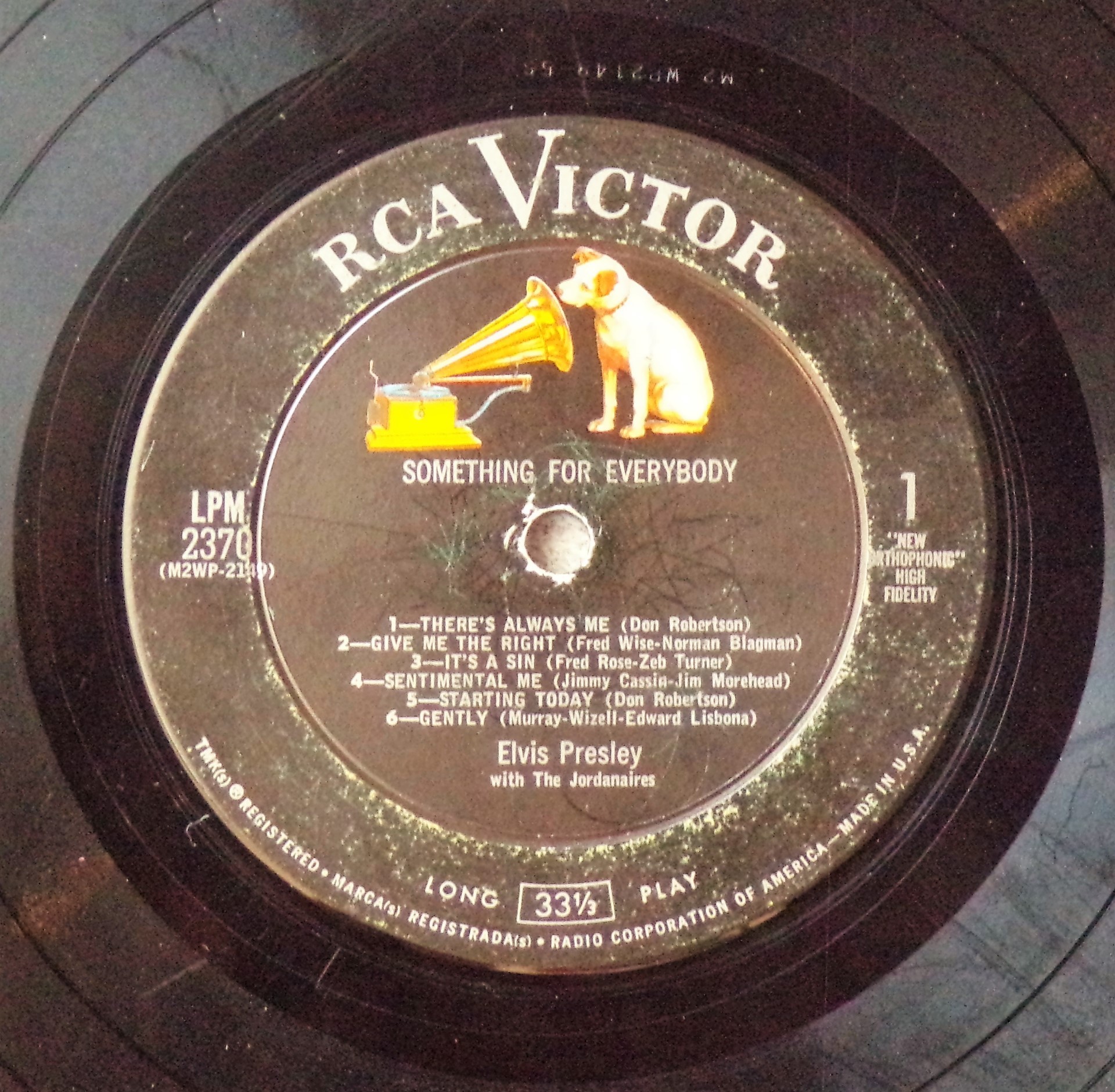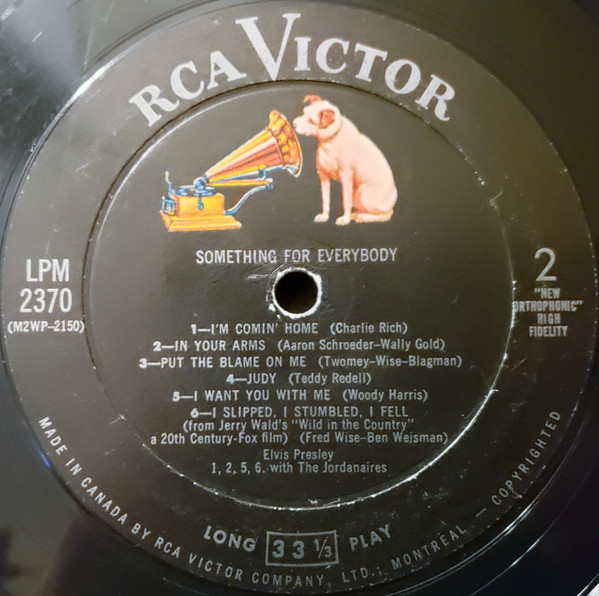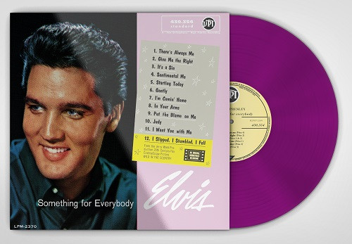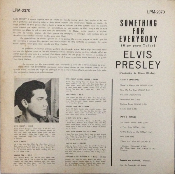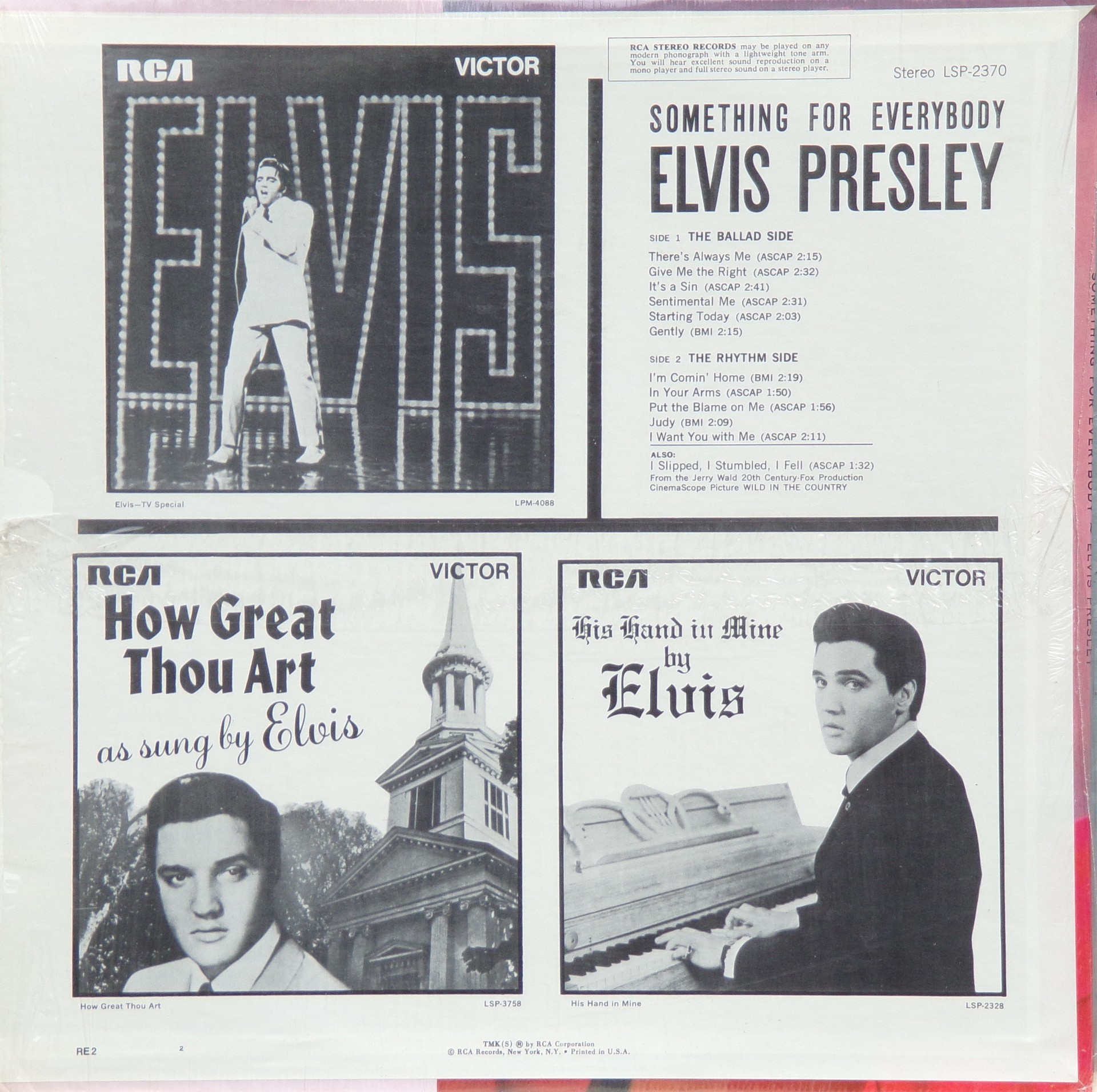 Radio Recorders, Hollywood, November 8, 1960 Something For Everybody is the thirteenth album by Elvis Presley, released on RCA Victor in mono and stereo, LPM/LSP 2370, in June 1961. Recording sessions took place on November 8, 1960, at Radio Recorders in Hollywood, and on March 12, 1961 at RCA Studio B in Nashville, Tennessee. It peaked at #1 on the Top Pop Albums chart. It was certified Gold on 7/15/1999 by the R.I.A.A. After his military discharge from the army in March 1960, any doubts about Presley's ability to recapture the momentum of his career in the 1950s had been laid to rest. During that year his three singles had all topped the charts, and his first album, Elvis Is Back!, had gone to #2 on the album chart. His musical film G.I. Blues had been wildly successful, its soundtrack also going to #1 on the album chart. Pressing on, he entered the familiar Studio B in Nashville and recorded eleven of the tracks for this album in one twelve-hour session, in addition to the single "I Feel So Bad". The single was initially scheduled to be the twelfth track for the album, but Presley chose it to accompany the title track to the film Wild in the Country as the promotional 45 for the film. Another track that had appeared in the film but not released commercially on records, "I Slipped, I Stumbled, I Fell", became the final track for the album. Front Cover : Photo of Elvis. Song titles to right. Catalogue number
