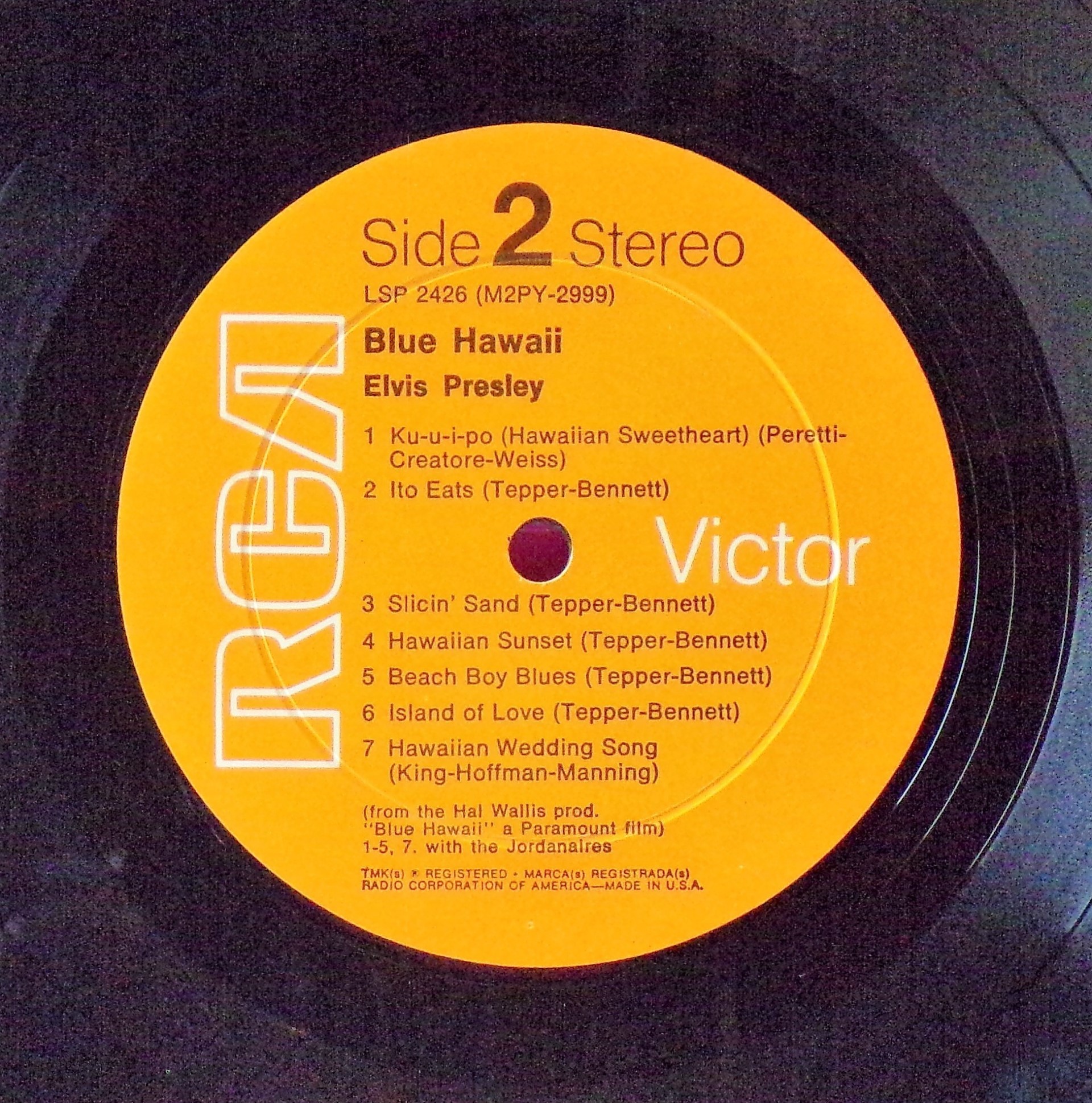 number bottom left. Logo top right. Bottom side left Printed In U.S.A. Rear Cover : 4 Elvis photos from Blue Hawaii. Catalogue number top right LPM/LSP 2426. Label : Black with silver lettering & dog on top. Side 1 : Right side has "New Orthophonic" High Fidelity under the number 1. Long Play at bottom. Side 2 : Right side has "New Orthophonic" High Fidelity under the number 2. Long Play at bottom. Pressing Plant : Indianapolis Matrix Number Side 1 : M2PP - 2996 - 1S B1 (Machine Stamped) Matrix Number Side 2 : M2PP - 2997 - 1S A3 (Machine Stamped) *NOTE* Front cover bottom side left Printed In U.S.A. |