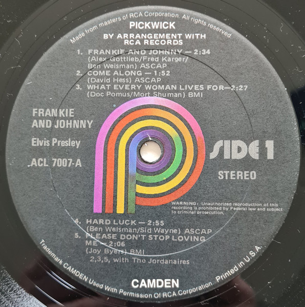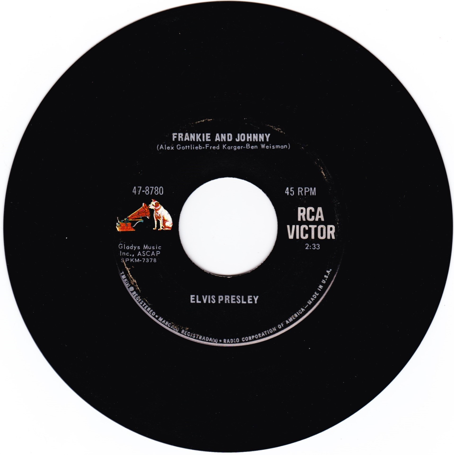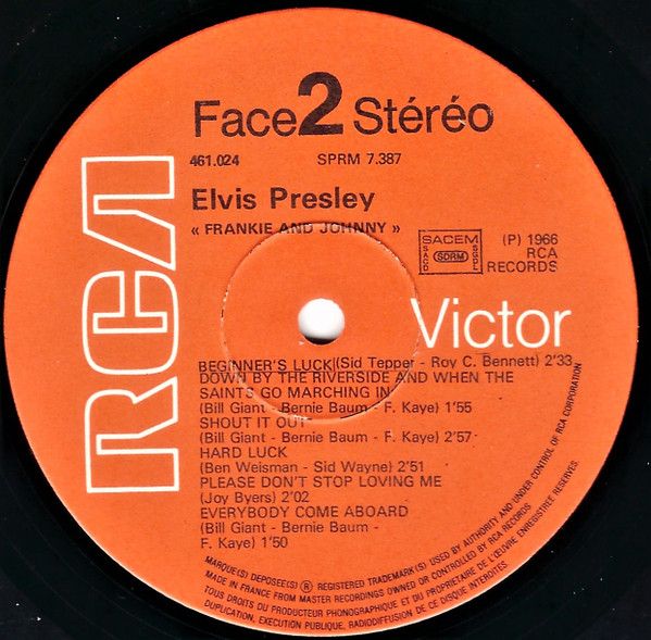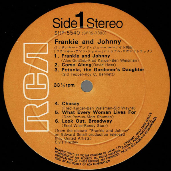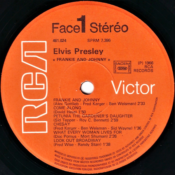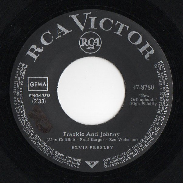 | Label: RCA Victor – 447-0656 Series: Gold Standard Series Format: Vinyl, 7", 45 RPM, Single, Reissue Country: US Released: 1970 Published By – Gladys Music Inc. Label Variant: Red 'Gold Standard' labels. Reissue of Frankie And Johnny. Rights Society (A): ASCAP |
