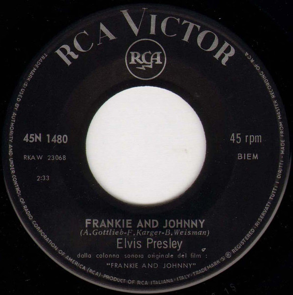 | Label: RCA Victor – 45N 1480 Format: Vinyl, 7", 45 RPM Country: Italy Released: 1966 Pressed By – RCA Records Factory, Italy Dalla colonna originale del film: "Frankie And Johnny". Matrix / Runout (Label side A): RKAW 23068 |