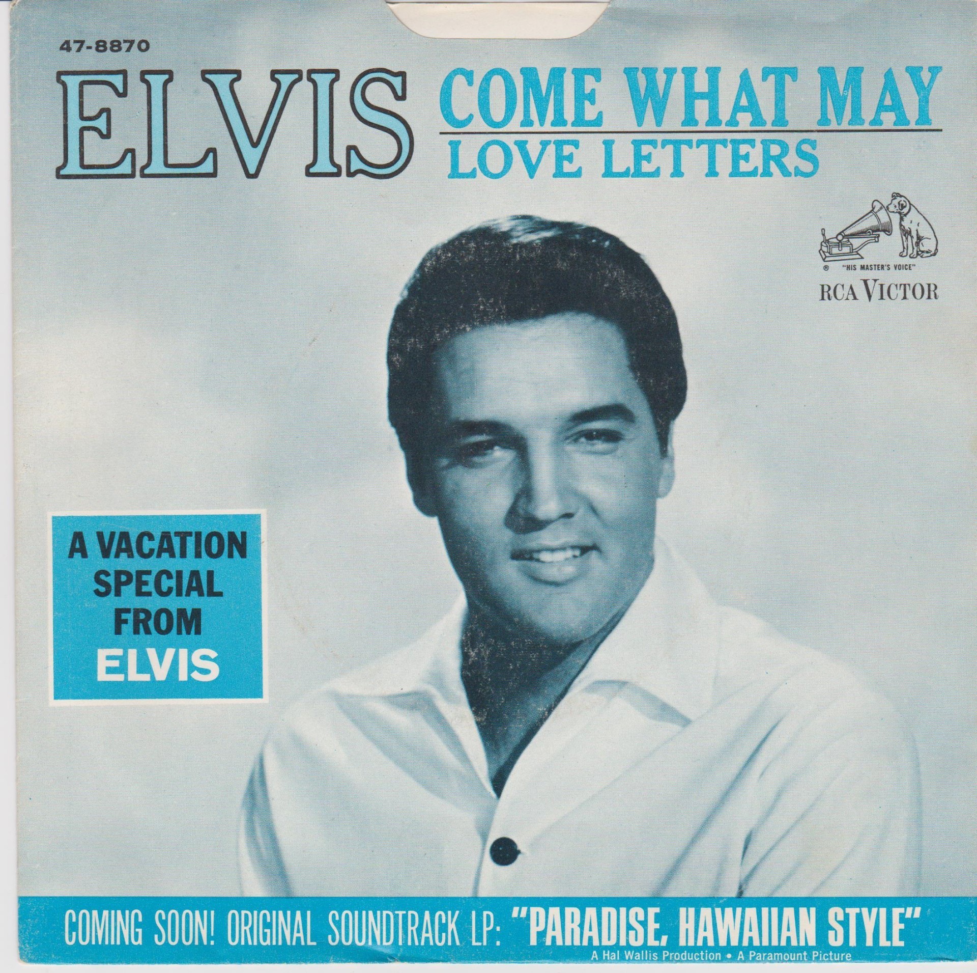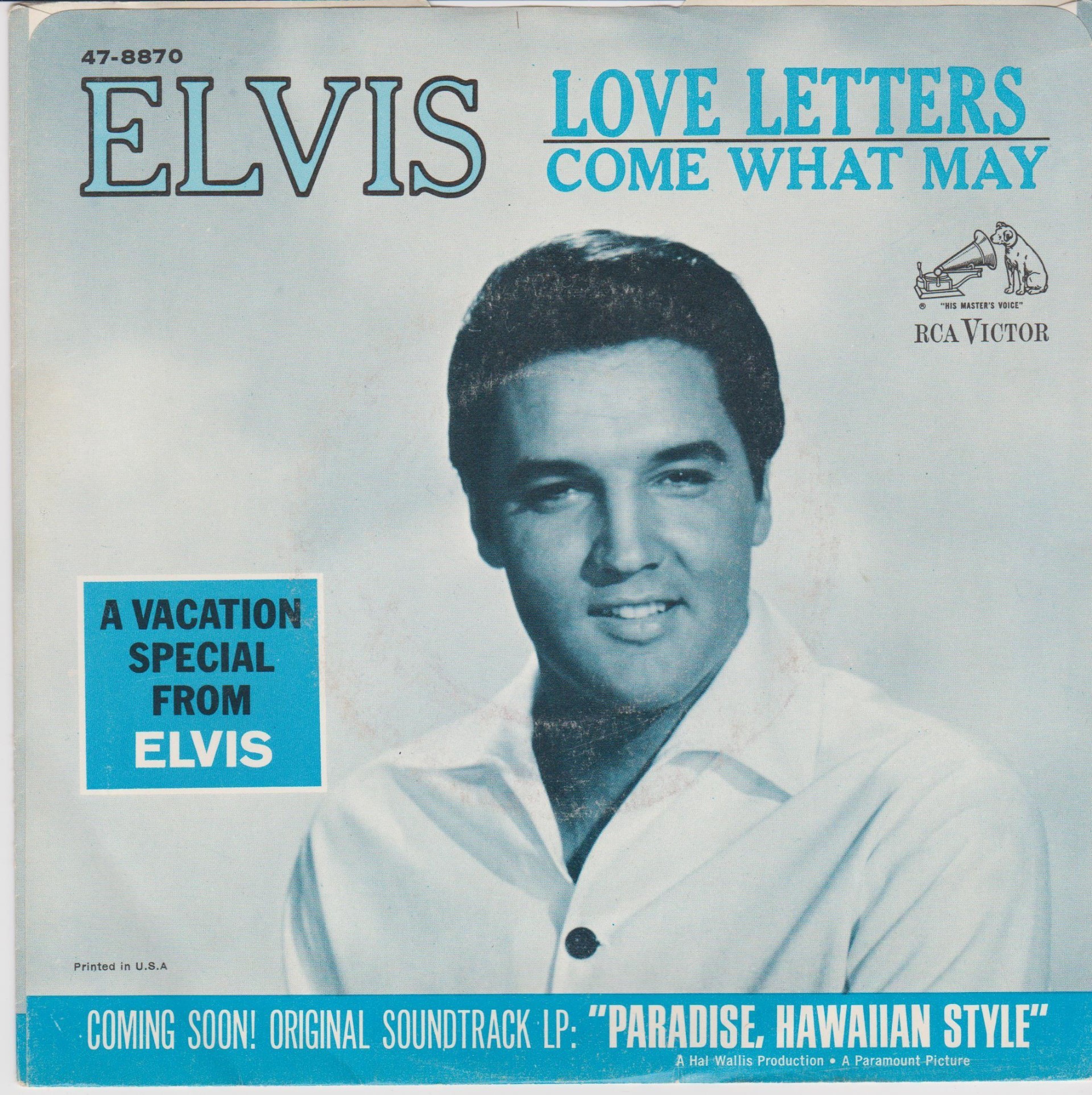 Hollywood, August 2, 1965 Brief History : Presley found himself in 1965 recording soundtrack albums for films that were almost a year away from release — gone were the days when the turnaround time from the final session for Elvis Is Back! to its arrival in the shops was less than one week. While working on this album, his most recent film in the theaters was Tickle Me, and Presley had completed three more movies since then. With titles like "A Dog's Life" and "Queenie Wahine's Papaya," he openly ridiculed the material, wasting time before finally approaching the microphone to do the job. He begrudgingly accepted songs given him that he would have rejected outright years earlier. He always finished the work, but in essence Presley had become a hired hand in his own career. No singles were issued from songs on the album. Ten songs were recorded at the sessions for the soundtrack, but only nine were used in the film. The omitted song, "Sand Castles," was included on the album to bring the running order to ten tracks. Sales for the album were under 250,000, a new low for Presley's LP catalogue. The good news was the single issued in June 1966 two days before the album, the 1945 Victor Young standard "Love Letters" backed with Clyde McPhatter's 1958 rhythm and blues hit "Come What May." It made a respectable #19 on the Billboard Hot 100, and at least reflected Presley's actual tastes away from obligations to the soundtrack recordings. It was also his first contemporary record release in three years since "(You're the) Devil in Disguise" in June 1963, arriving in stores less than two weeks after it was recorded. Front Cover : Photo of Elvis. LP title top. Catalogue number bottom