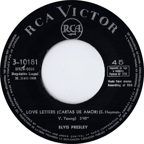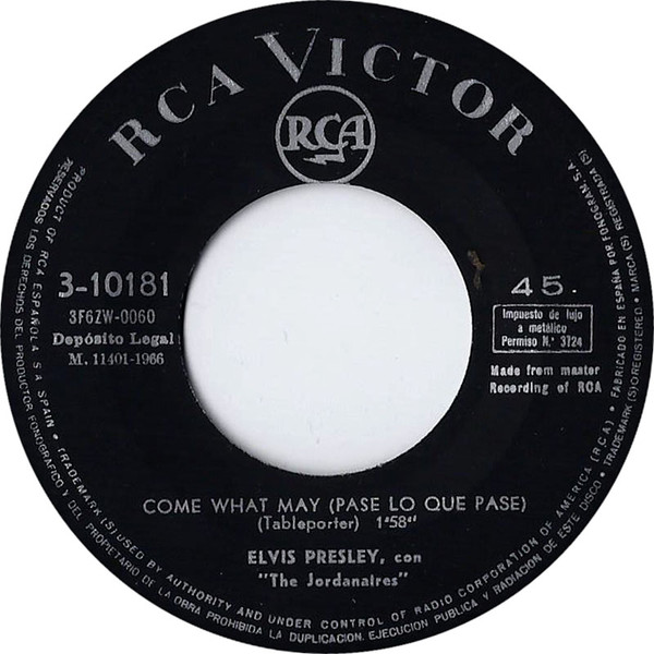 | Label: RCA Victor – 3-10181 Format: Vinyl, 7", 45 RPM, Single Country: Spain Released: 1966 Record Company – RCA Española, S.A. Spanish titles on vinyl labels Matrix / Runout (Printed A side): 3F6ZW-0059 |