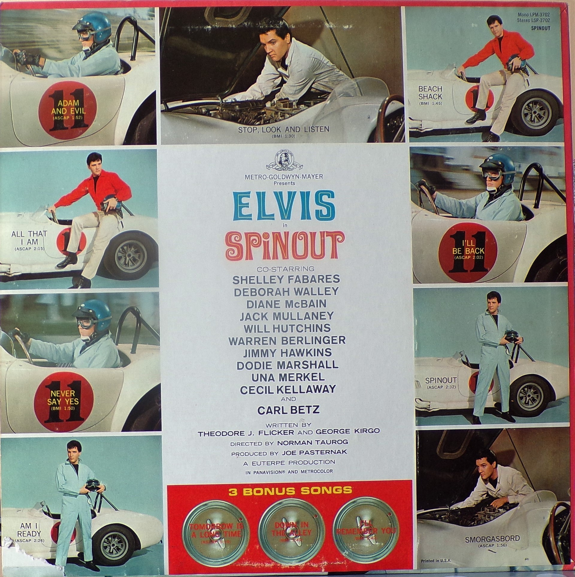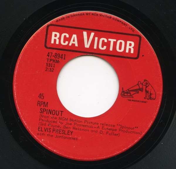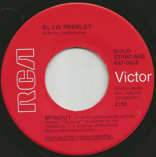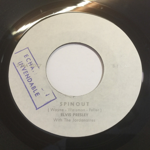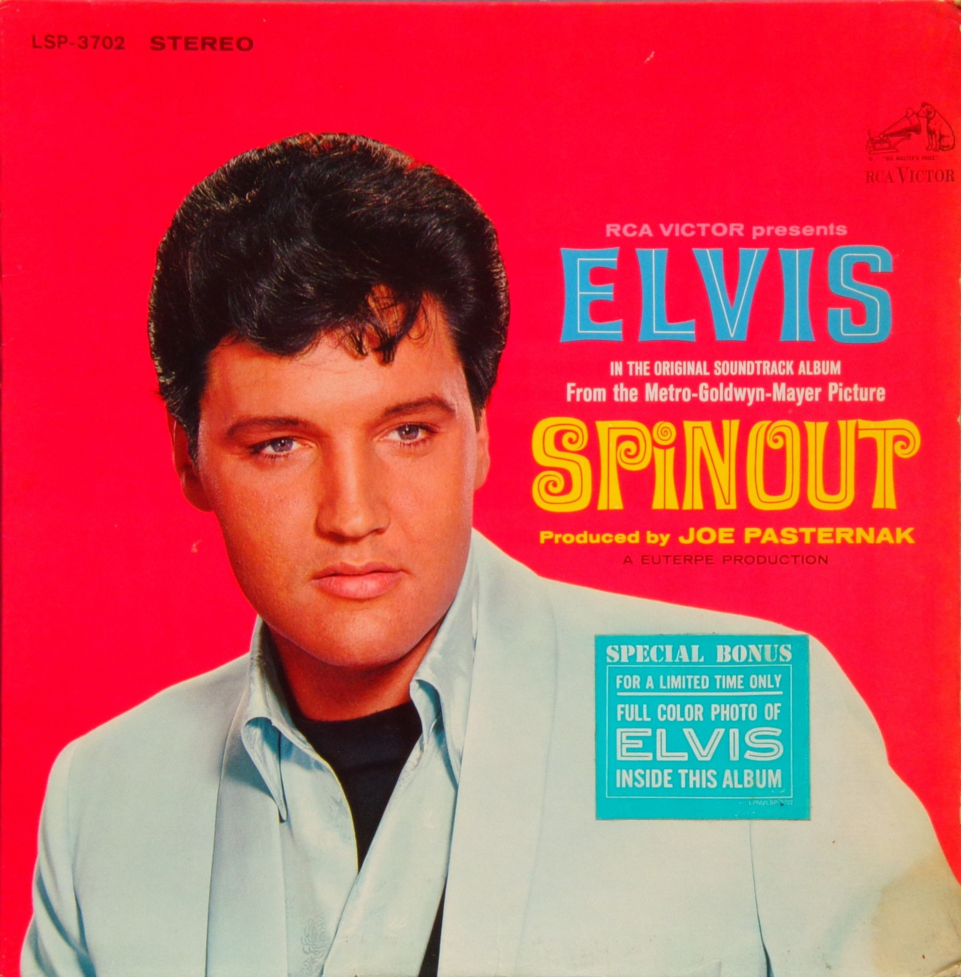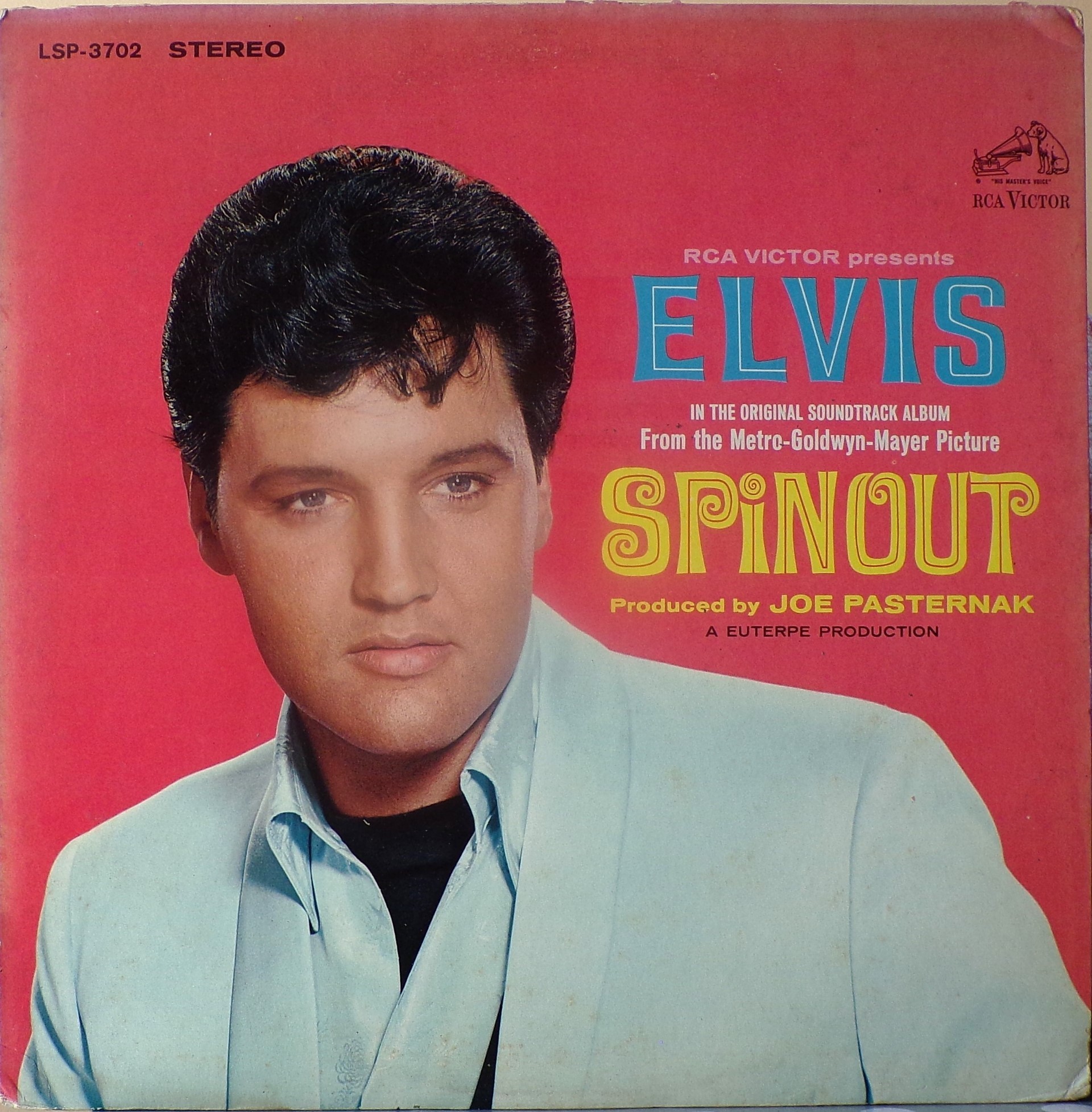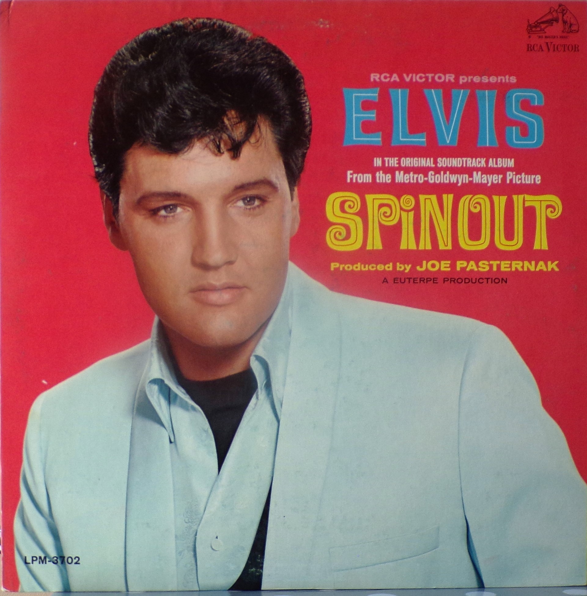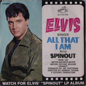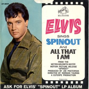 Recorded: Radio Recorders, Hollywood, February 16, 1966 Brief History : Spinout is the twenty-seventh album by Elvis Presley, released on RCA Victor Records in mono and stereo, LPM/LSP 3702, in October 1966. Recording sessions took place at Radio Recorders in Hollywood, California, on February 16 and 17, 1966. It peaked at #18 on the Top Pop Albums chart. In early 1966, executives at RCA and the Colonel had arrived at the same conclusion. They could no longer expect records of only soundtrack recordings and session leftovers to perform as strongly as in the past. Popular music was rife with changes in the mid-1960s, and with chart dominance from The Beatles, Bob Dylan, and a host of others, Presley no longer reigned supreme in the marketplace. Soundtrack sales were plunging, shifting fewer units and peaking at lower positions on the chart. But the Spinout sessions still adhered to the same formula of the past four years. Nine songs were recorded for the soundtrack, all of which appeared in the film. The songs derived from the standard pool of songwriters, their publishing rights signed over to Elvis Presley Music and Gladys Music, the companies owned by Elvis and the Colonel. One song "Stop, Look, and Listen" had been a recent b-side for Bill Haley & His Comets in February 1965. Two songs were released as a single the month before the film's premiere, the title track backed with "All That I Am," and although both sides charted independently the A-side just barely made the Top 40. Elvis performed the song "Adam and Evil" on stage in the film which features a long drum roll at the beginning. He makes reference to Adam and Eve in the Bible, that "Adam and Evil they go hand in hand / Eve taught him sin, that's the way it all began". Elvis clicks his fingers throughout the track. Acknowledging shifts in taste, three additional tracks of a contemporary nature were added as a "special bonus" to bring the album up to a more acceptable running time. Recorded at RCA Studio B in Nashville, Tennessee during the sessions for his gospel album How Great Thou Art, two were rhythm and blues songs. The other was an original by Bob Dylan (publishing rights were, of course, not signed over to Presley and Parker), with a ballad from a later Nashville session in June. "Down in the Alley' had been released in 1957 by The Clovers, and Presley knew of and appreciated the Dylan song from the version on Odetta Sings Dylan by the folk singer Odetta. "I'll Remember You" had been a record by Don Ho, and reflected Presley's infatuation with Hawaii and its culture. Even with these inclusions, the album fared little better than its predecessors in 1966. Dylan confessed to Rolling Stone in June 1969 that Presley's version of "Tomorrow Is A Long Time" was the cover of one of his songs that he "treasured the most." The three additional songs can be found on From Nashville to Memphis: The Essential 60's Masters, while three songs from the film soundtrack appeared on its sister compilation: "Spinout," "All That I Am," and "I'll Be Back." Front Cover : Photo of Elvis. Title to the right. Catalogue number