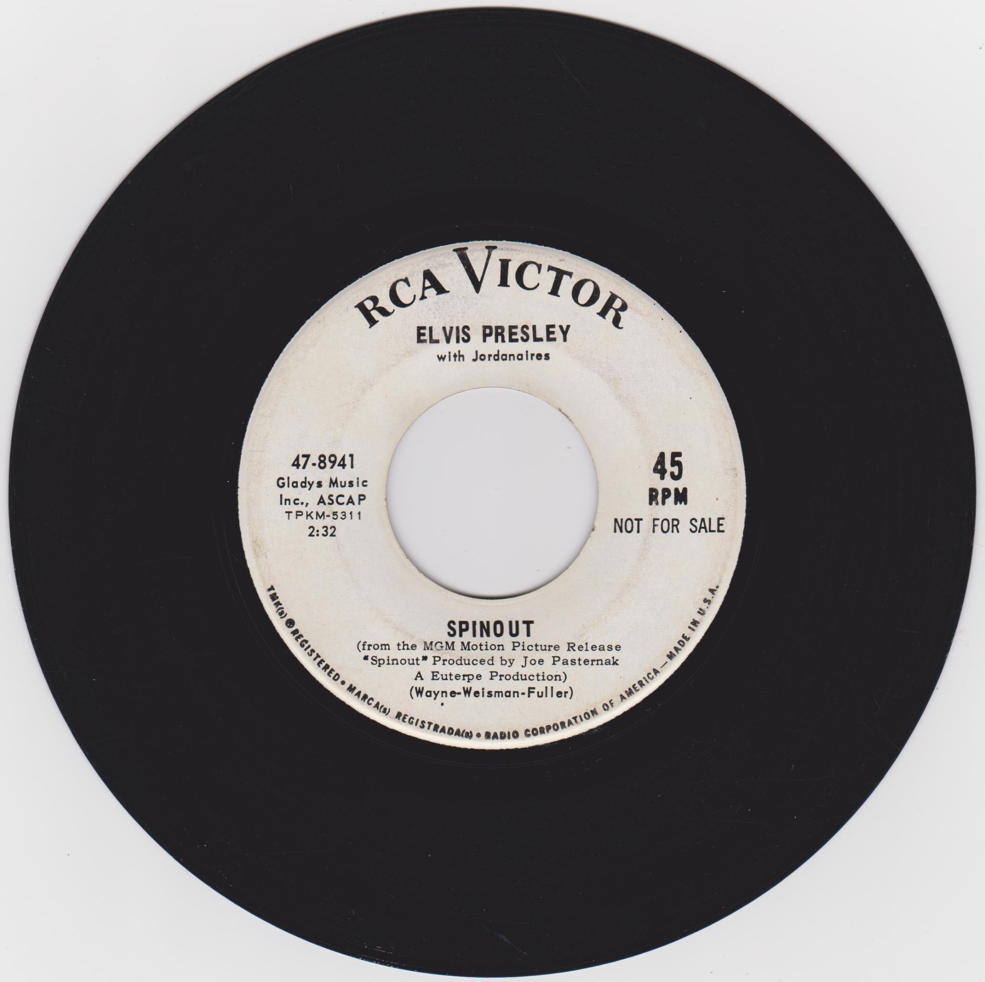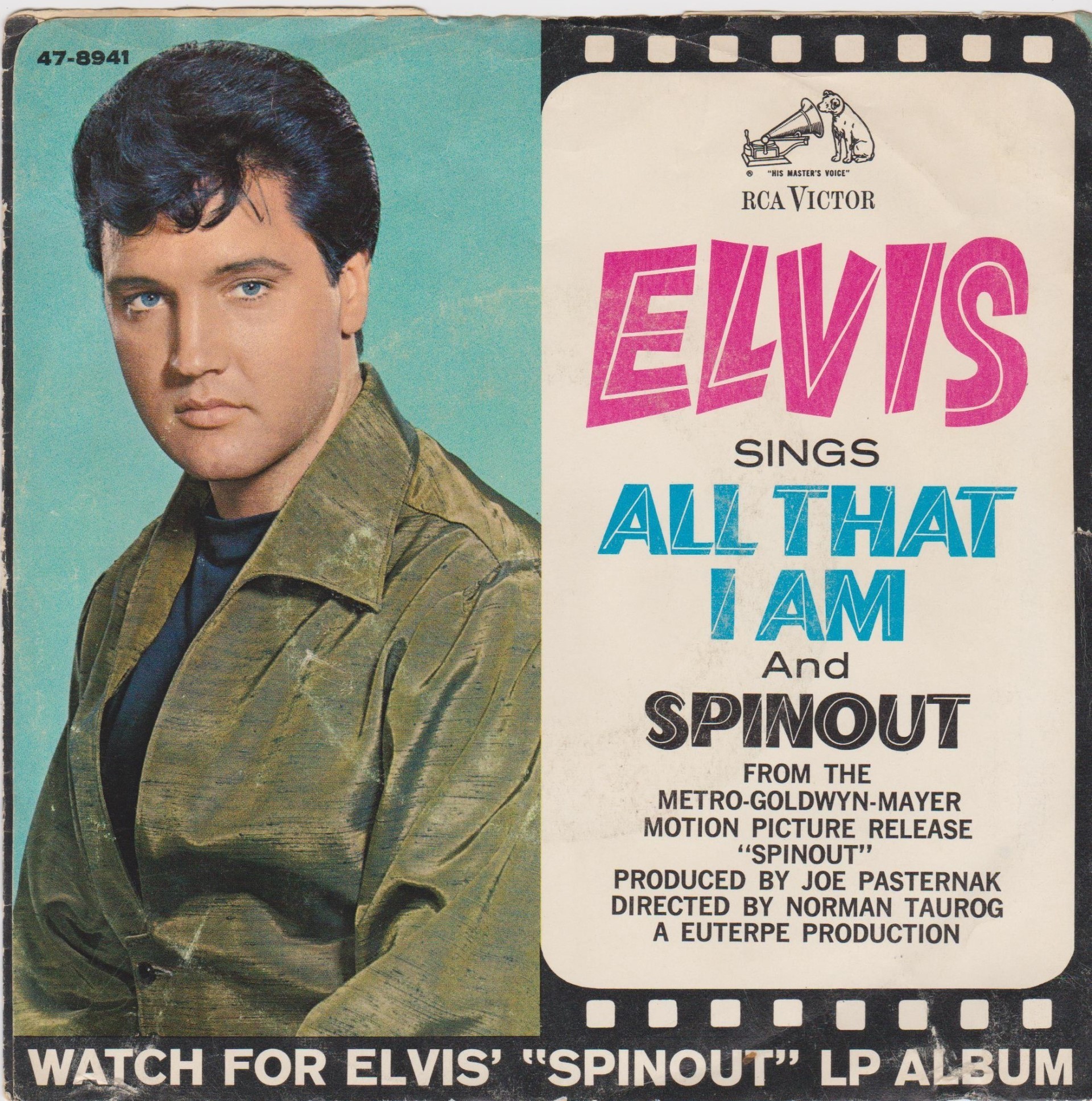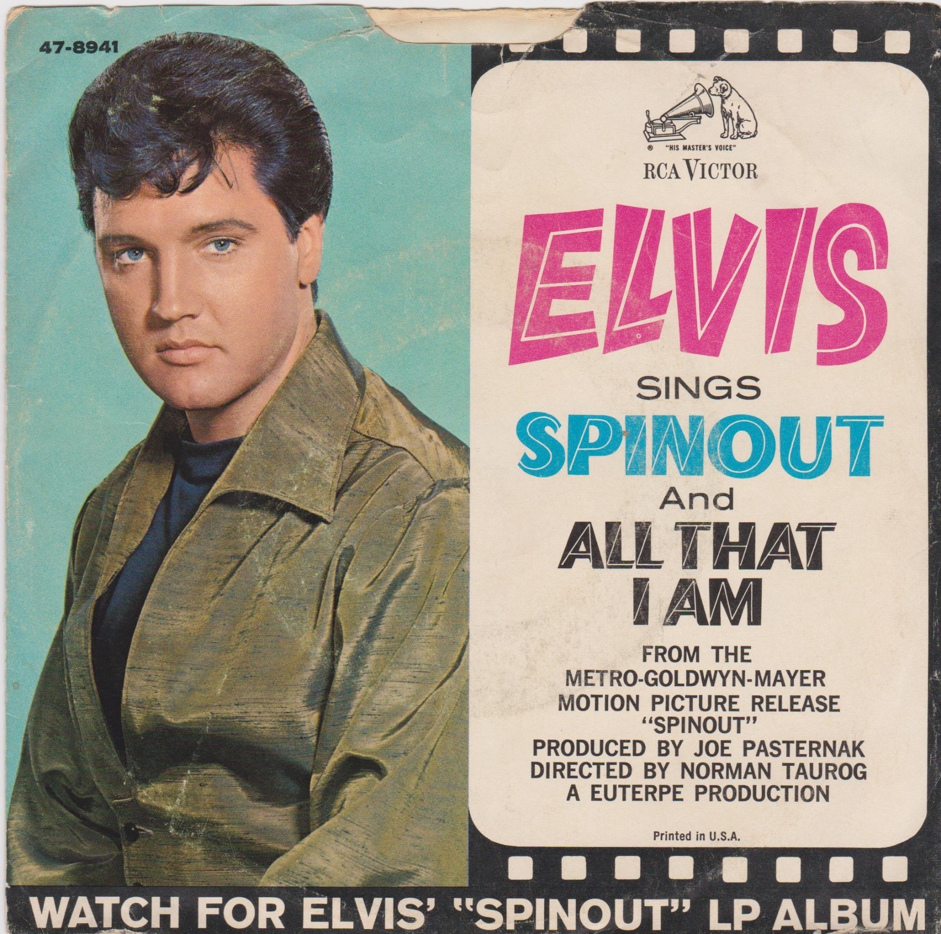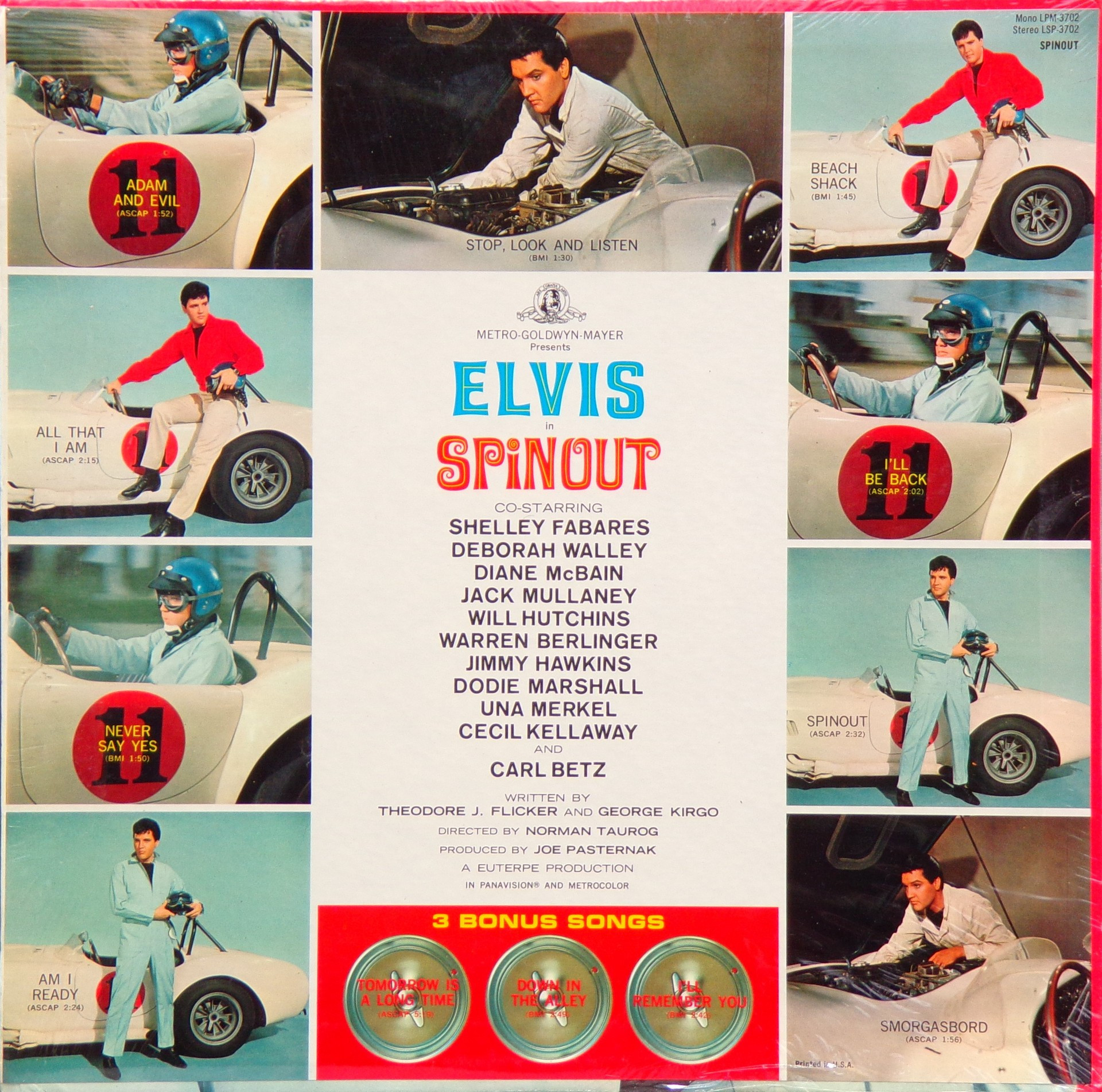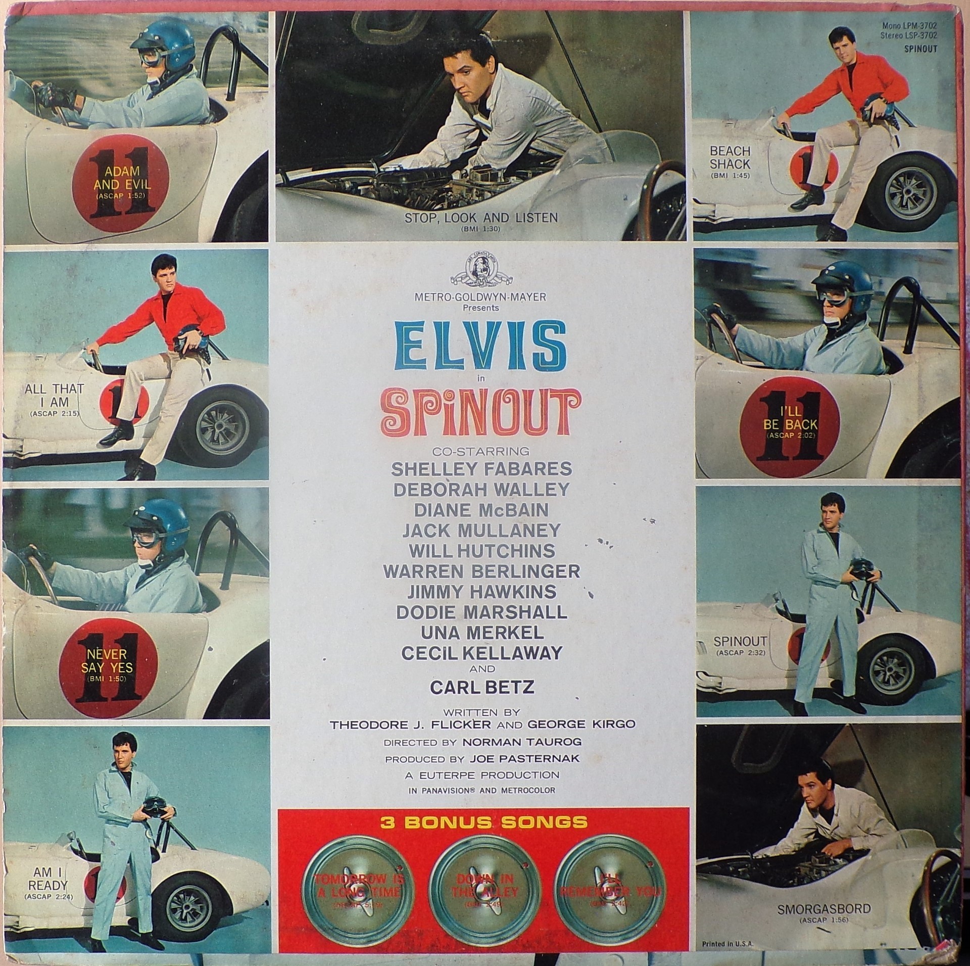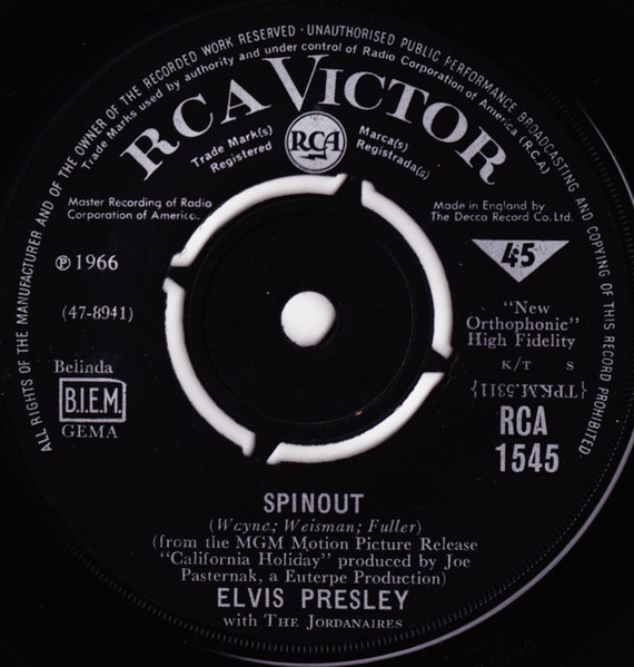 Recorded: Radio Recorders, Hollywood, February 16, 1966 Brief History : Spinout is the twenty-seventh album by Elvis Presley, released on RCA Victor Records in mono and stereo, LPM/LSP 3702, in October 1966. Recording sessions took place at Radio Recorders in Hollywood, California, on February 16 and 17, 1966. It peaked at #18 on the Top Pop Albums chart. In early 1966, executives at RCA and the Colonel had arrived at the same conclusion. They could no longer expect records of only soundtrack recordings and session leftovers to perform as strongly as in the past. Popular music was rife with changes in the mid-1960s, and with chart dominance from The Beatles, Bob Dylan, and a host of others, Presley no longer reigned supreme in the marketplace. Soundtrack sales were plunging, shifting fewer units and peaking at lower positions on the chart. But the Spinout sessions still adhered to the same formula of the past four years. Nine songs were recorded for the soundtrack, all of which appeared in the film. The songs derived from the standard pool of songwriters, their publishing rights signed over to Elvis Presley Music and Gladys Music, the companies owned by Elvis and the Colonel. One song "Stop, Look, and Listen" had been a recent b-side for Bill Haley & His Comets in February 1965. Two songs were released as a single the month before the film's premiere, the title track backed with "All That I Am," and although both sides charted independently the A-side just barely made the Top 40. Elvis performed the song "Adam and Evil" on stage in the film which features a long drum roll at the beginning. He makes reference to Adam and Eve in the Bible, that "Adam and Evil they go hand in hand / Eve taught him sin, that's the way it all began". Elvis clicks his fingers throughout the track. Acknowledging shifts in taste, three additional tracks of a contemporary nature were added as a "special bonus" to bring the album up to a more acceptable running time. Recorded at RCA Studio B in Nashville, Tennessee during the sessions for his gospel album How Great Thou Art, two were rhythm and blues songs. The other was an original by Bob Dylan (publishing rights were, of course, not signed over to Presley and Parker), with a ballad from a later Nashville session in June. "Down in the Alley' had been released in 1957 by The Clovers, and Presley knew of and appreciated the Dylan song from the version on Odetta Sings Dylan by the folk singer Odetta. "I'll Remember You" had been a record by Don Ho, and reflected Presley's infatuation with Hawaii and its culture. Even with these inclusions, the album fared little better than its predecessors in 1966. Dylan confessed to Rolling Stone in June 1969 that Presley's version of "Tomorrow Is A Long Time" was the cover of one of his songs that he "treasured the most." The three additional songs can be found on From Nashville to Memphis: The Essential 60's Masters, while three songs from the film soundtrack appeared on its sister compilation: "Spinout," "All That I Am," and "I'll Be Back." Front Cover : Photo of Elvis. Title to the right. Catalogue number