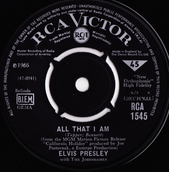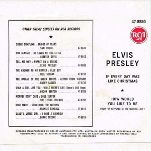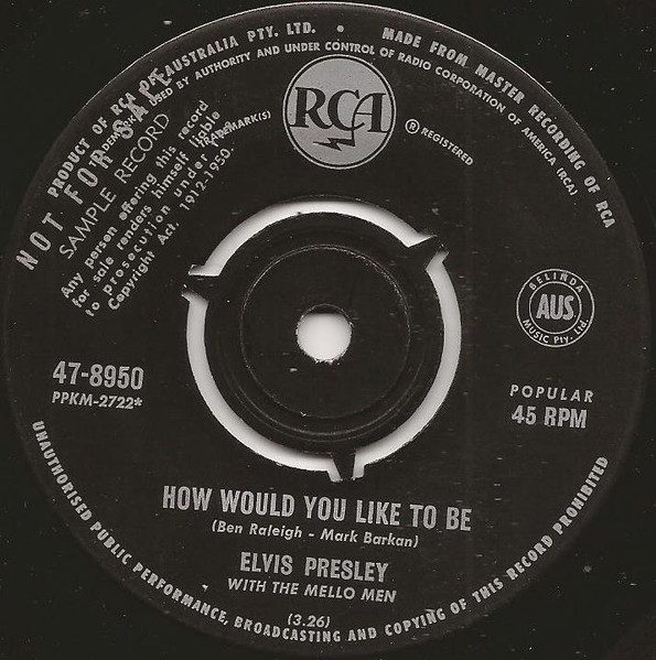 | Label: RCA Victor – 47-8950 Format: Vinyl, 7", 45 RPM, Single Country: Germany Released: 1966 Lacquer Cut At – TELDEC-Studio, Hamburg How Would You Like To Be is from the MGM picture "It Happened At The World's Fair". Rights Society (Boxed): GEMA |