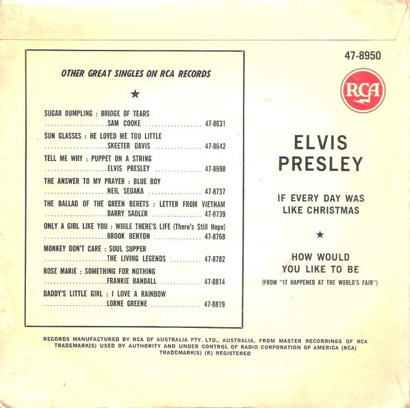 | Label: RCA – 47-8950 Format: Vinyl, 7", 45 RPM, Single, Promo Country: Australia Released: Unknown Manufactured By – RCA Of Australia Pty.