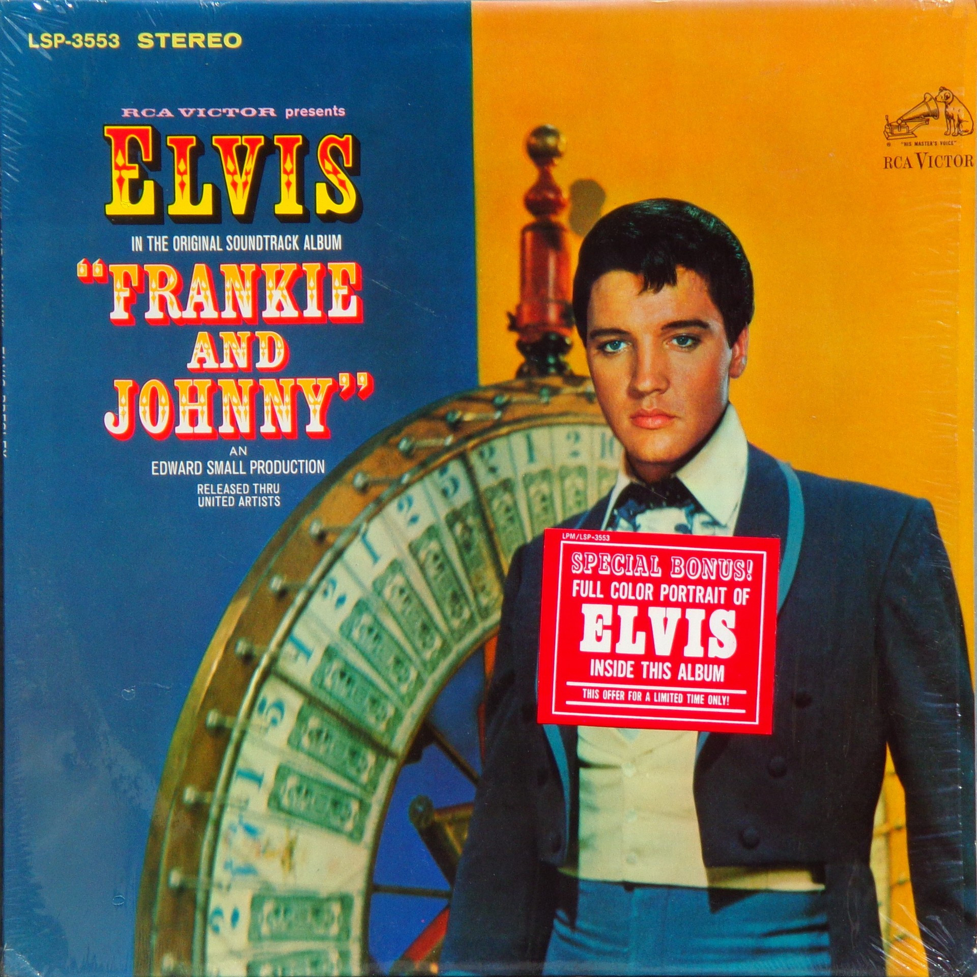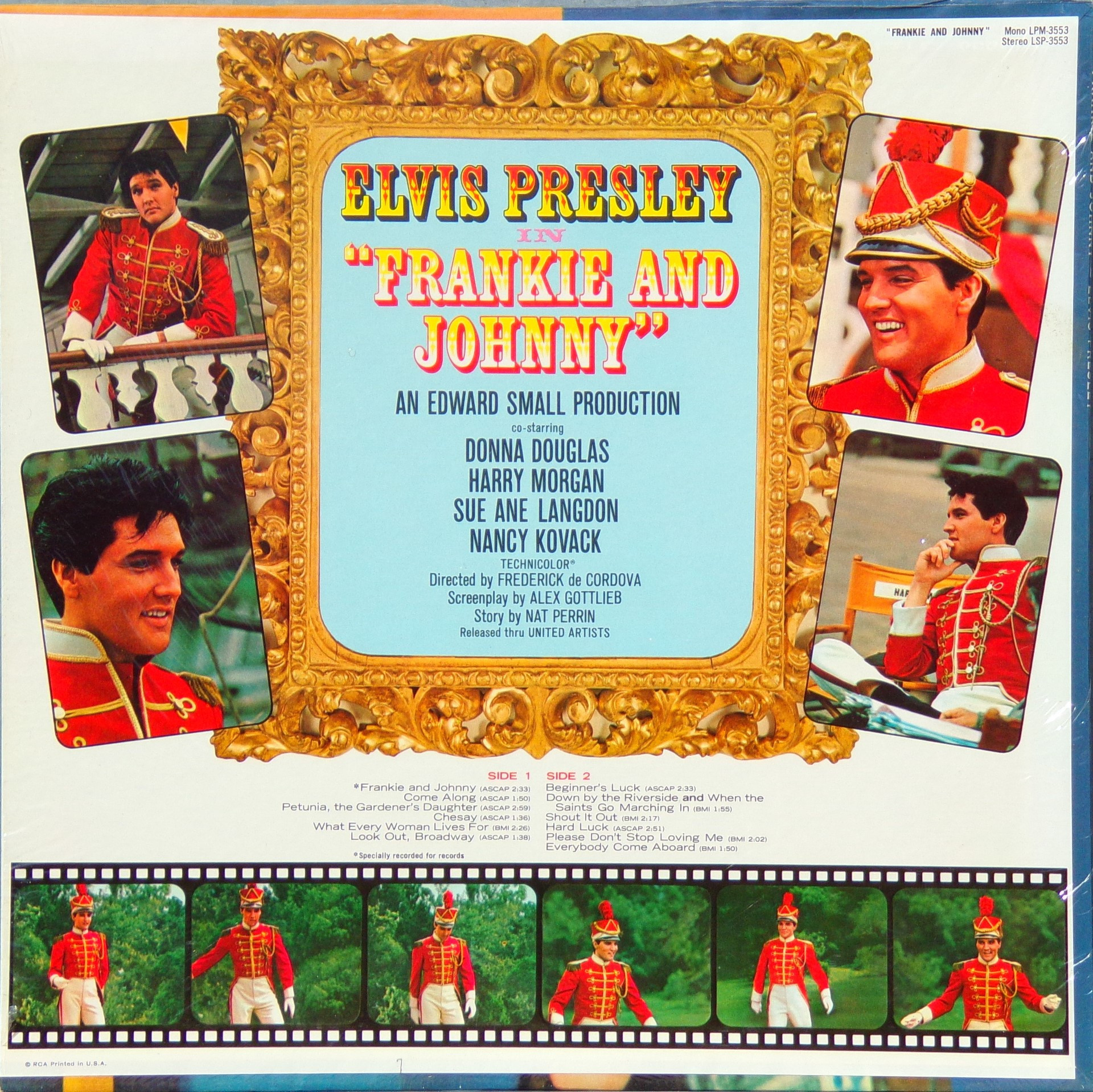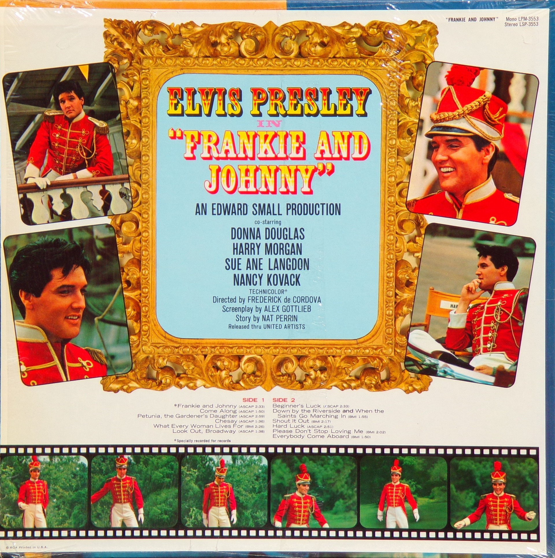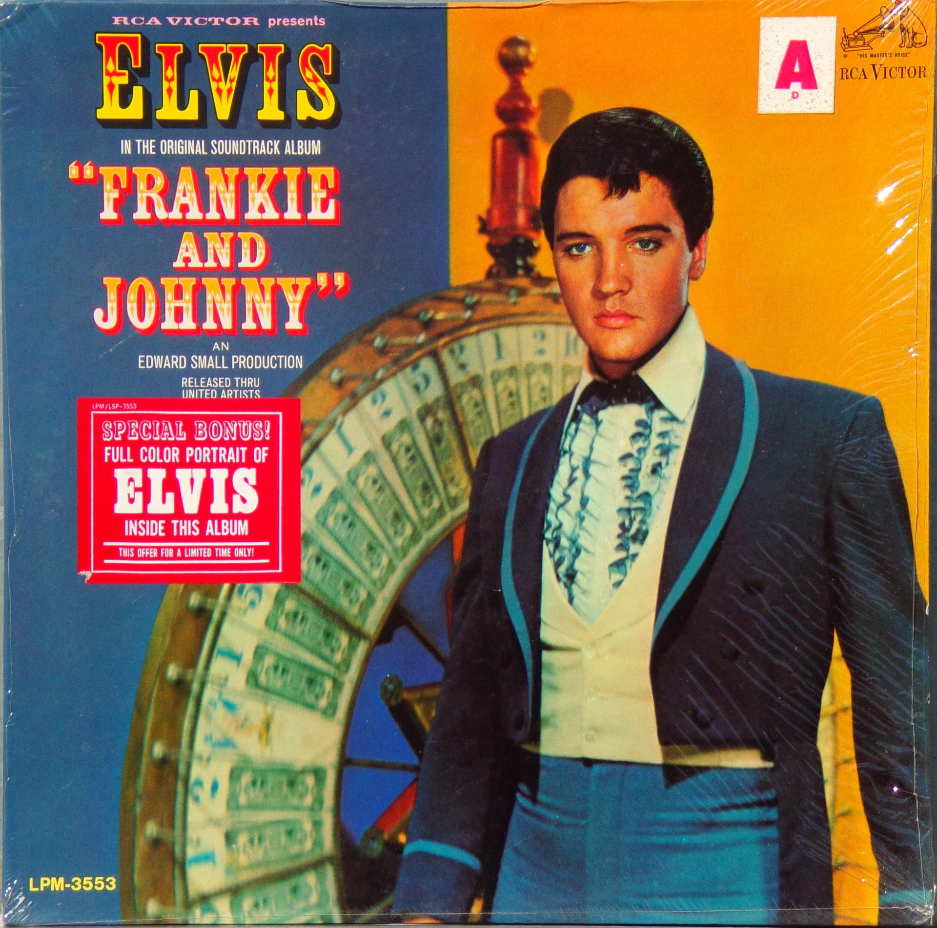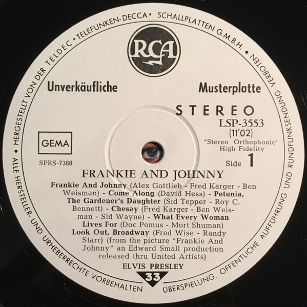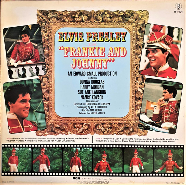 Radio Recorders, Hollywood, May 13, 1965 Brief History : Frankie and Johnny is the twenty-fifth album by Elvis Presley, released on RCA Victor Records in mono and stereo, LPM/LSP 3553, in March 1966. Recording sessions took place at Radio Recorders in Hollywood, California, on May 12, 13, and 14, 1965. It peaked at #20 on the Top Pop Albums chart. It was certified Gold and Platinum on 1/6/2004 by the R.I.A.A. To coincide with the 19th century setting of the film, some traditional song material was utilized for the soundtrack. "When the Saints Go Marching In" is an old gospel hymn that has become a jazz standard associated with the traditional hot jazz of New Orleans. It is paired in a medley with "Down by the Riverside," another traditional gospel song dating back to the relevant time period. Both are in the public domain, and the team of Giant, Baum, and Kaye captured the publishing for Freddy Bienstock and the Colonel. The title song, "Frankie and Johnny," is a variant on the American popular song first published in 1904 and credited to Hughie Cannon. With changed lyrics, another publishing royalty was secured for Gladys Music. Twelve songs were recorded at the sessions for Frankie and Johnny, and all were used and issued on the soundtrack. The title song was issued as a single, with "Please Don't Stop Loving Me" on the b-side. Released either just before or simultaneously with the album, "Frankie and Johnny" peaked at #25 on the Billboard Hot 100, with the b-side also charting at #45. Front Cover : Photo of Elvis. Catalogue number bottom left. *NOTE* Hype Sticker. A 12 X 12 inch photo was given away free for a period during this release. It was enclosed inside the album. Different matrix numbers. |