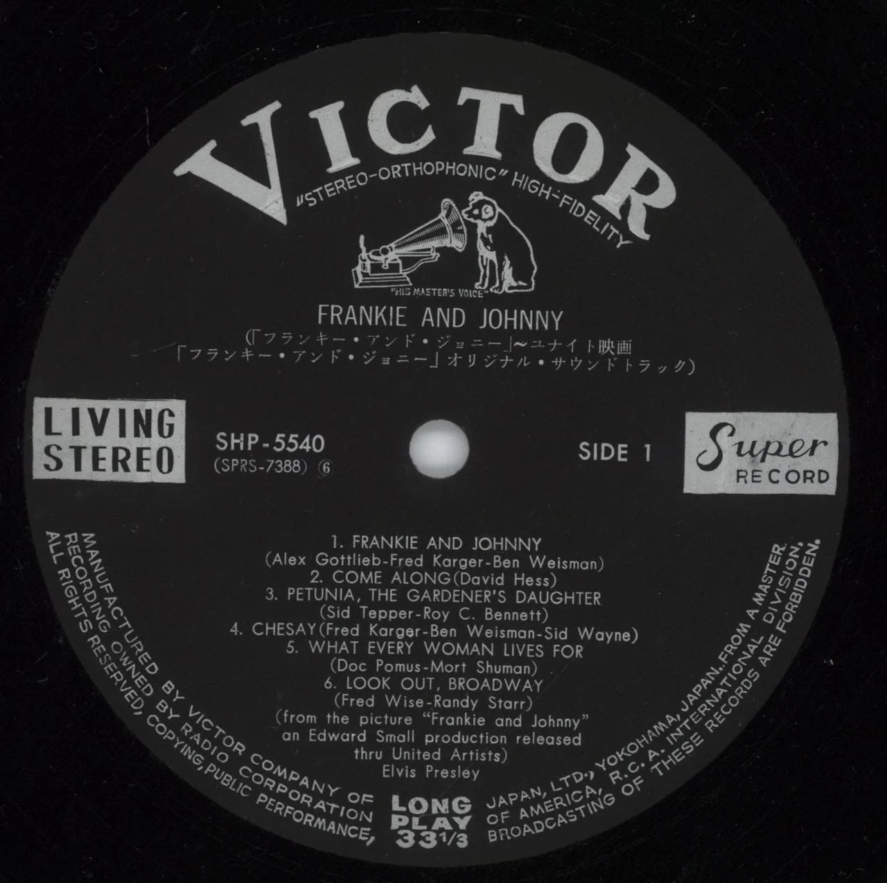 | Label: RCA – RPL-2021 Series: エルヴィス・オン・スクリーン1800 Format: Vinyl, LP, Album, Reissue, Stereo Country: Japan Released: Aug 1982 Phonographic Copyright ℗ – RCA Records Previously released in Japan in 1966 and 1969. This version was released with obi and insert containing English lyrics and Japanese liner notes. Matrix / Runout (Runout Side A - Stamped): RPL-2021A 121 Track 3, Side 2 misspelled track "Shout it out", listed as "Shot it out" |