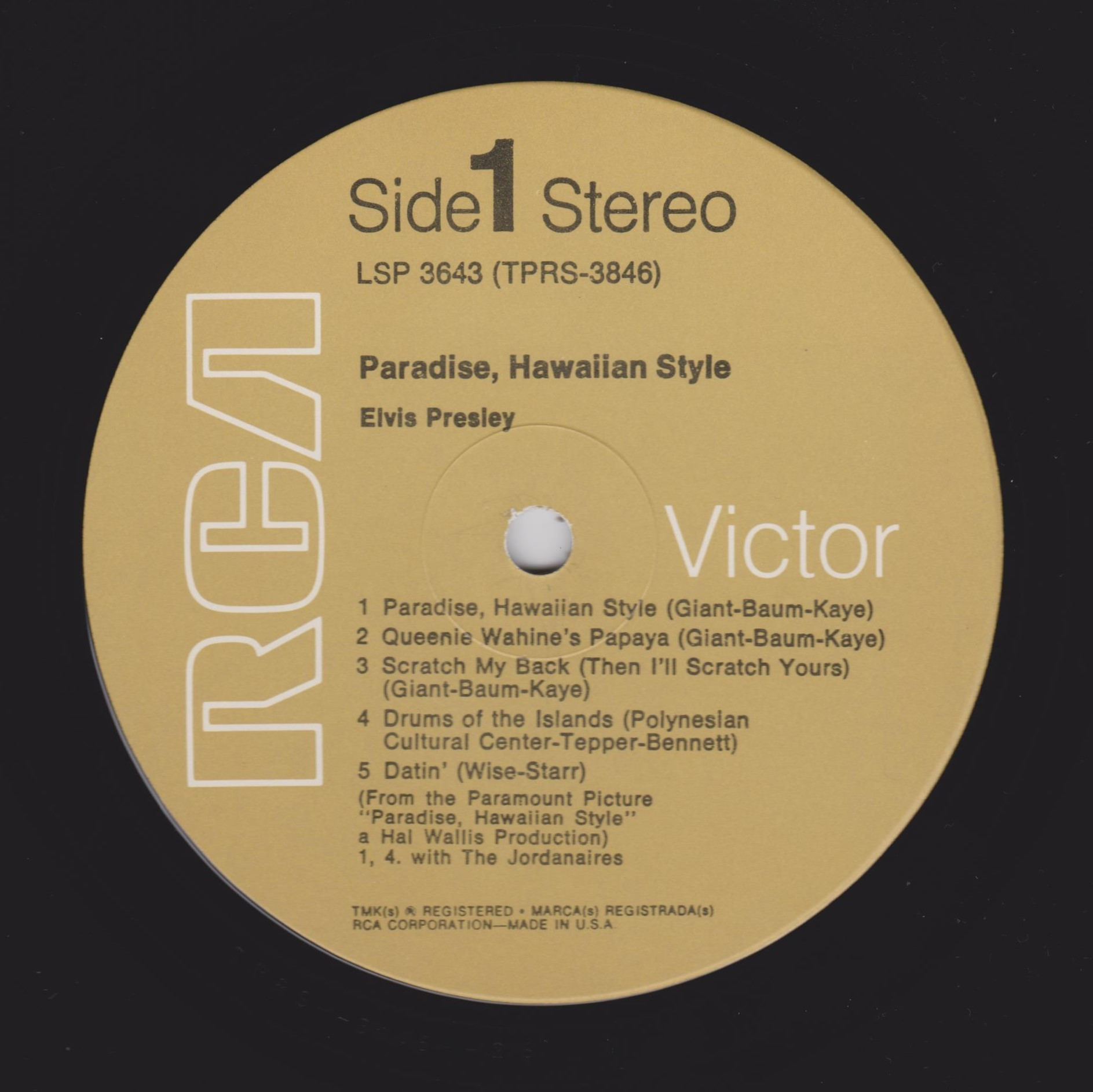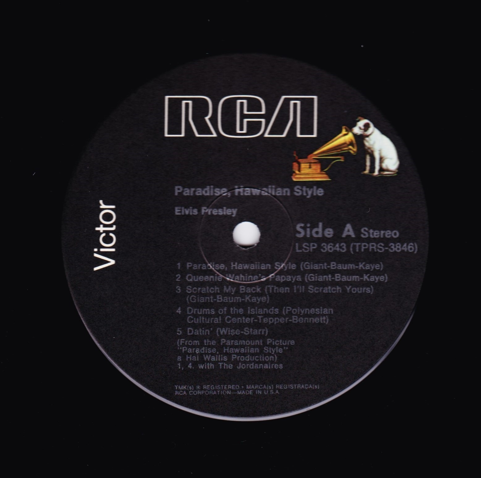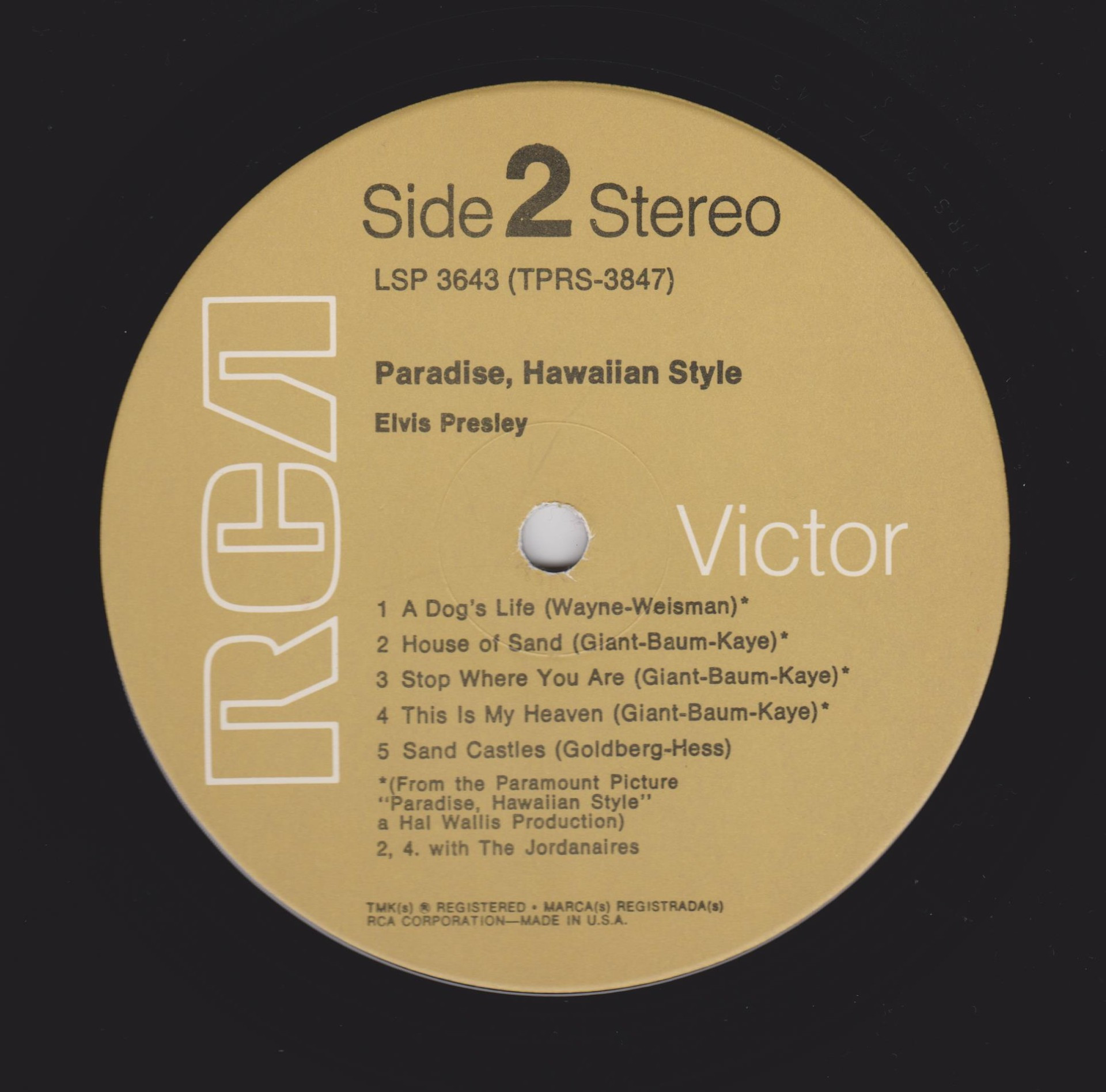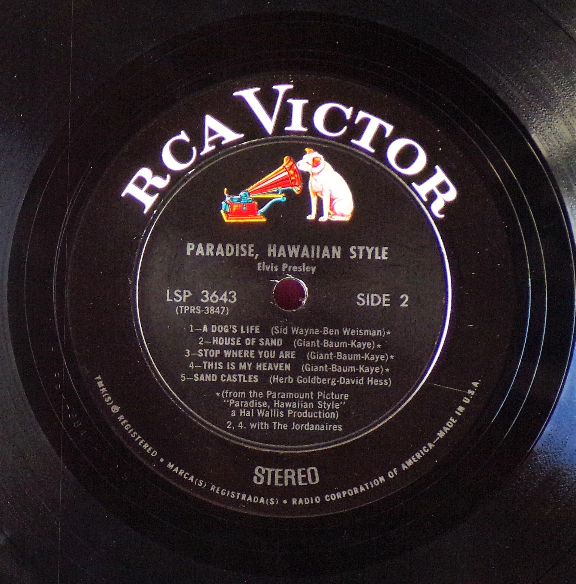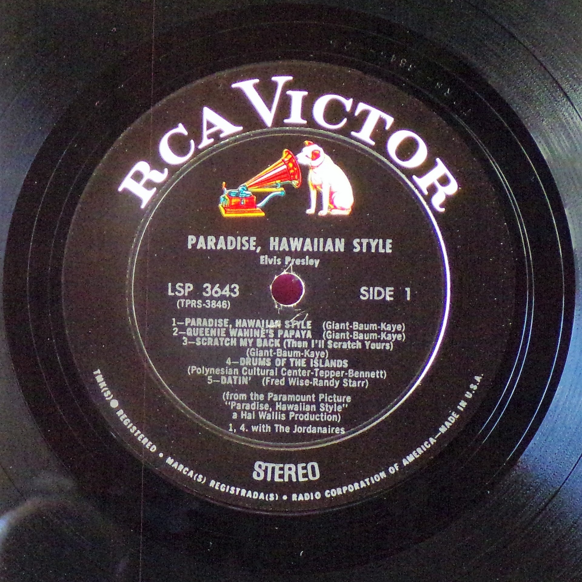 left. Rear Cover : 9 photos of Elvis. Catalogue number top right Mono LPM / Stereo LSP 3643. Printed in U.S.A. bottom left. Label : Black with silver lettering & dog on top. Side 1 : STEREO at bottom. Side 2 : STEREO at bottom. Pressing Plant : Indianapolis Matrix Number Side 1 : TPRS - 3846 - 2S A1 (Machine Stamped) Matrix Number Side 2 : TPRS - 3847 - 2S A4 (Machine Stamped) *NOTE* RCA Victor Logo in white. |