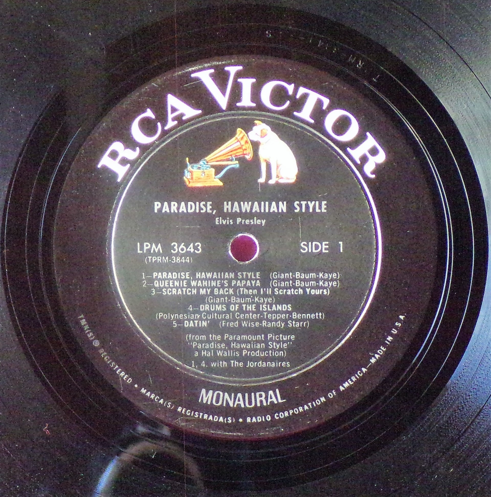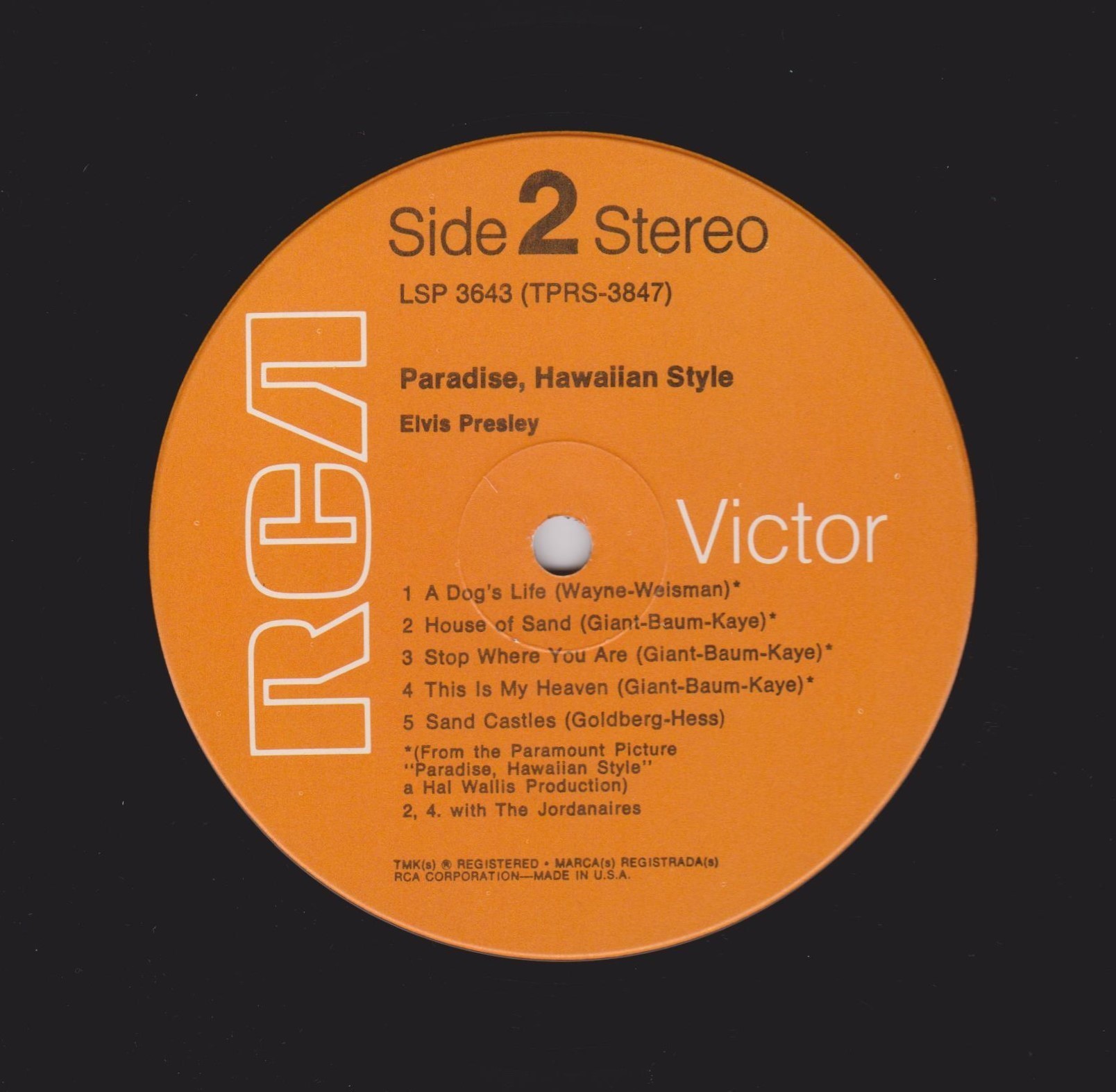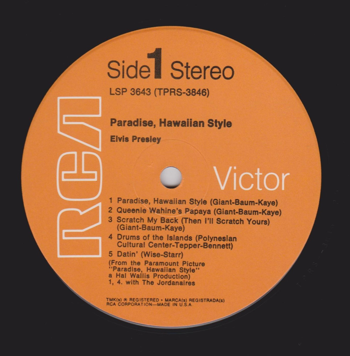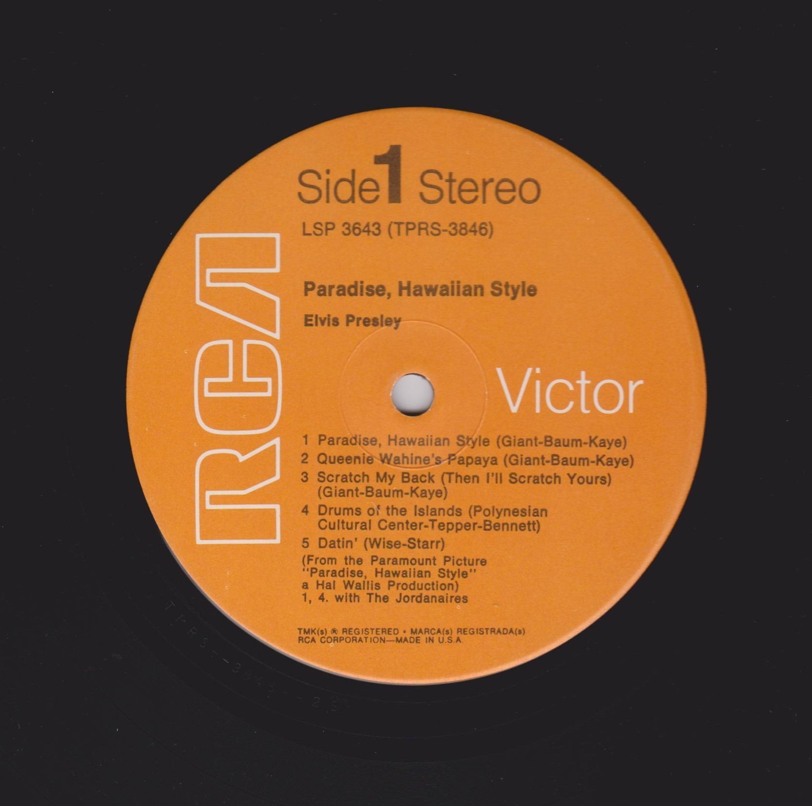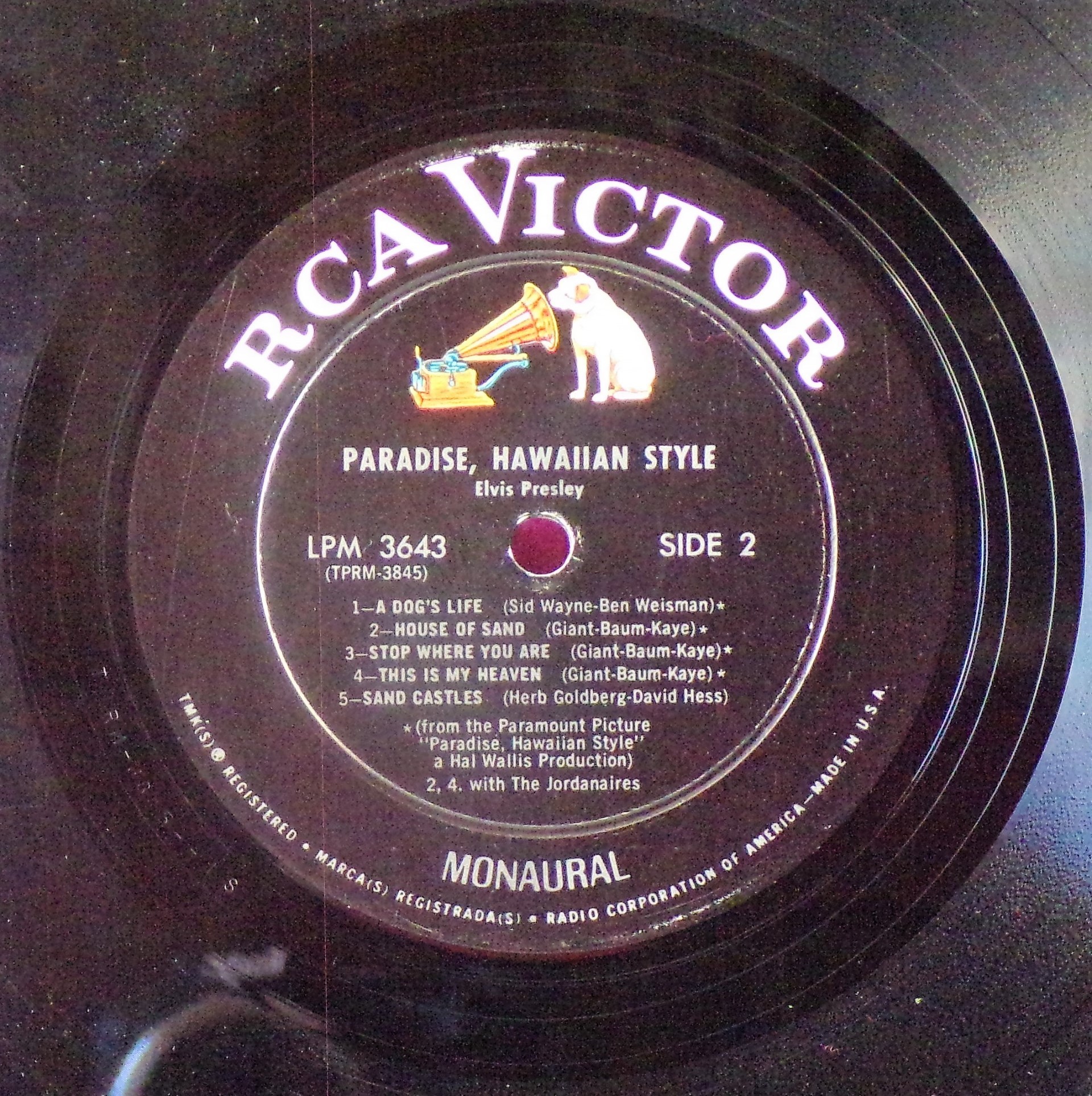 left. Rear Cover : 9 photos of Elvis. Catalogue number top right Mono LPM / Stereo LSP 3643. Printed in U.S.A. bottom left. Label : Black with silver lettering & dog on top. Side 1 : STEREO at bottom. Side 2 : STEREO at bottom. Pressing Plant : Indianapolis Matrix Number Side 1 : TPRS - 3846 - 2S A1 (Machine Stamped) Matrix Number Side 2 : TPRS - 3847 - 2S A4 (Machine Stamped) *NOTE* RCA Victor Logo in white. |