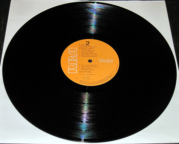 | Details : 1971 Release Front Cover : Photo of Elvis. Title across top. Catalogue number top left. Victor top right with Stereo beneath. "RE" bottom left. Rear Cover : 9 photos of Elvis. Catalogue number top right Mono LPM / Stereo LSP 3643. Printed in U.S.A. bottom left. Label : Orange. Flexible vinyl. Side 1 : Stereo at top. Side 2 : Stereo at top. Pressing Plant : Indianapolis Matrix Number Side 1 : TPRS - 3846 - 2S C4 (Machine Stamped) Matrix Number Side 2 : TPRS - 3847 - 4S B1 (Machine Stamped) *NOTE* Light font print on labels. Front cover "RE" bottom left in blue text. Rear cover bottom right "Library of Congress Card Number" states "Mono & Stereo". |