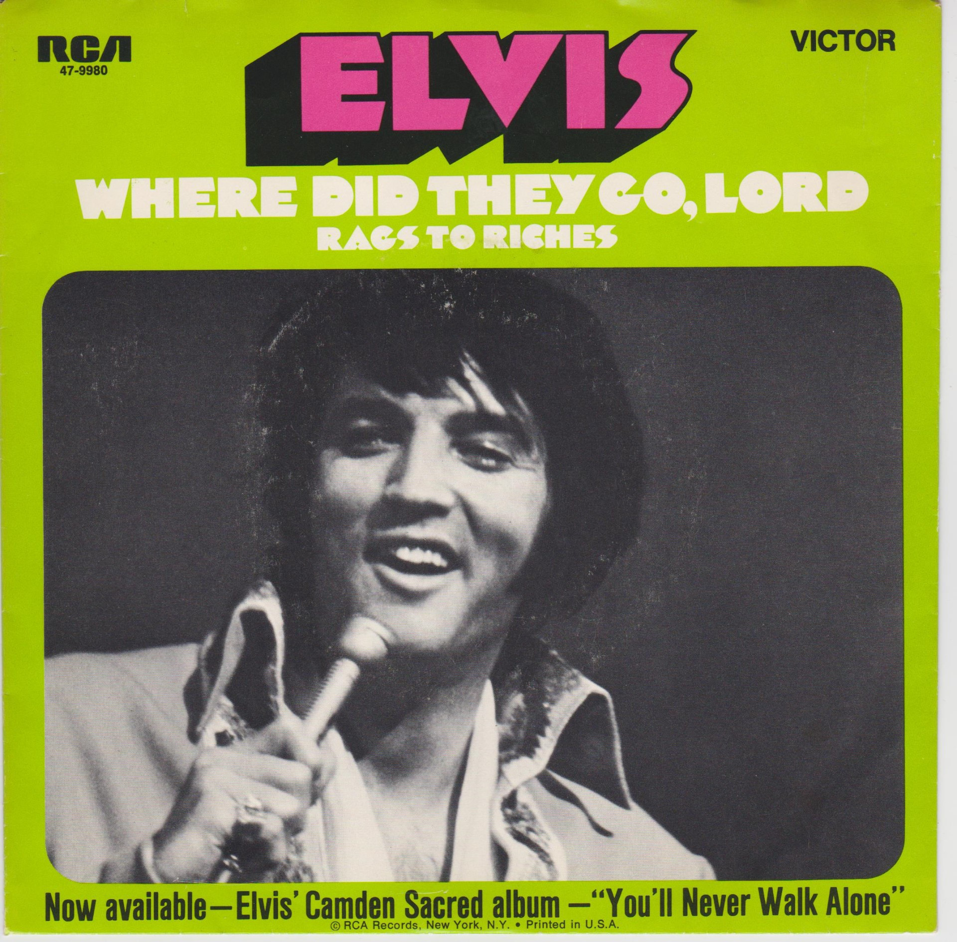 Rags To Riches * Side ZPKM 1798 : Where Did They Go, Lord Side ZPKM 1800 : Rags To Riches Front Cover : Picture Sleeve. *NOTE* Now Available - Elvis' Camden Sacred Albim - "You'll Never Walk Alone" sleeve. |