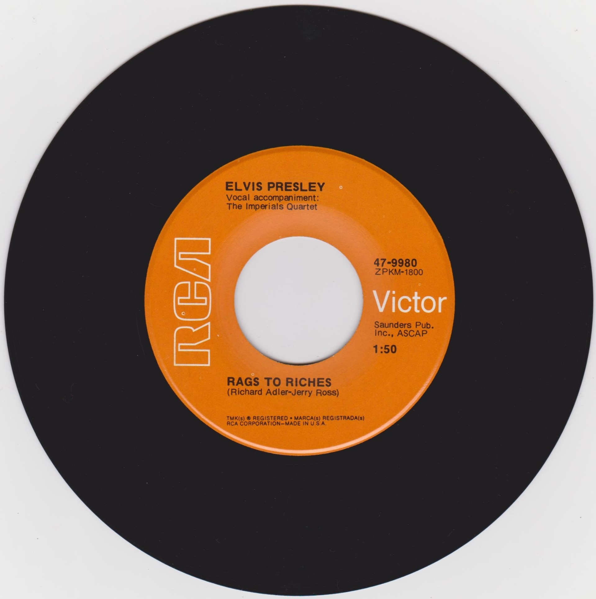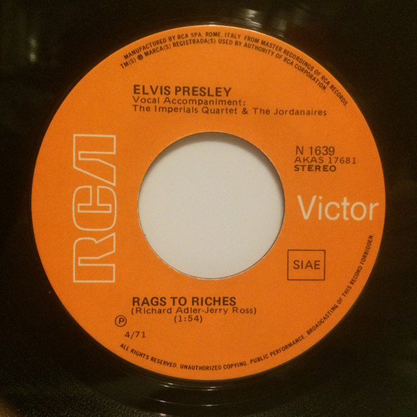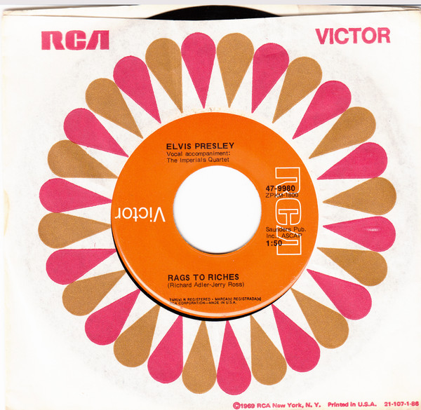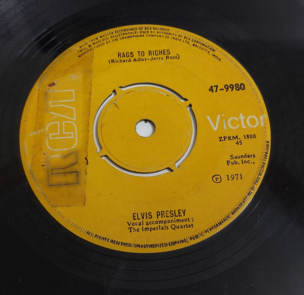 Label: RCA Victor – 47-9980 Format: Vinyl, 7", 45 RPM, Single, Misprint Country: US Released: 1971 Rags To Riches Label Is Printed With the RCA Logo and Victor Name, Backwards, And The Victor Is Upside Down. |