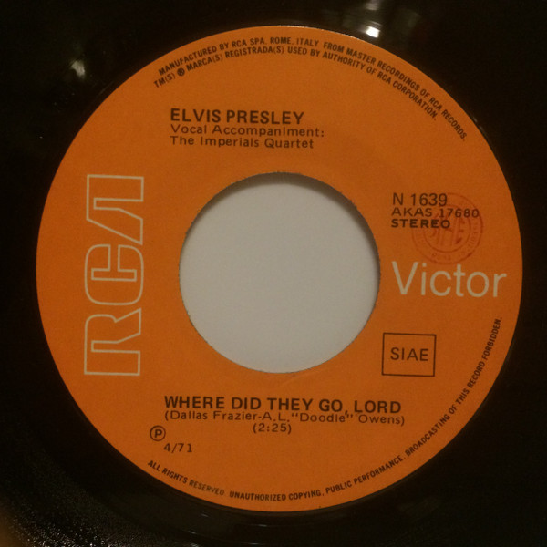 | Label: RCA Victor – 49840, RCA Victor – 74-0572 Series: Hit-Parade Format: Vinyl, 7", 45 RPM, Single, Stereo Country: France Released: 1971 Printed By – S.I.A.T. RCA 6, Rond-Point des Champs Elysées - Paris Side A edited for single use from the "Elvis Sings