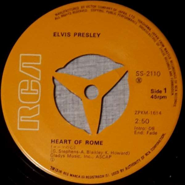 Title on top. Catalogue number top left. Rear Cover : Photo of Elvis in between song titles. Catalogue number top centre. Printed in U.S.A. bottom centre. Label : Orange. Non Flexible vinyl. Side 1 : Stereo at top. Side 2 : Stereo at top. Pressing Plant : Rockaway (Hand Etched) Matrix Number Side 1 : ZPRS - 1825 - 9S AIG (Hand Etched) Matrix Number Side 2 : ZPRS - 1826 - 7S A5A (Hand Etched) *NOTE* 7inch x5inch bonus photo enclosed with this release. Colour photo front & b&w photo rear. |
