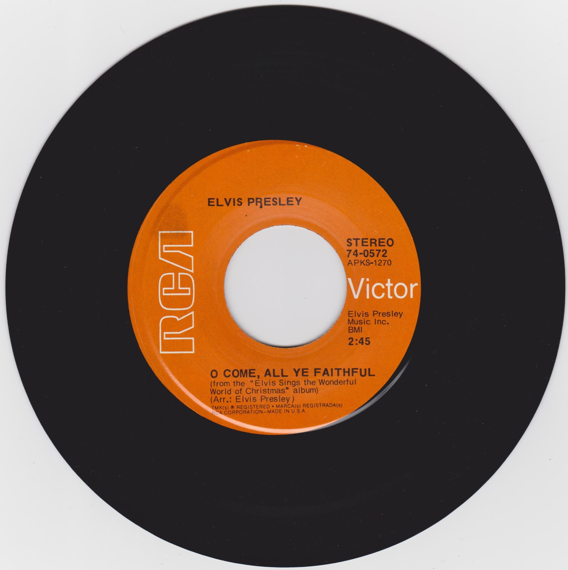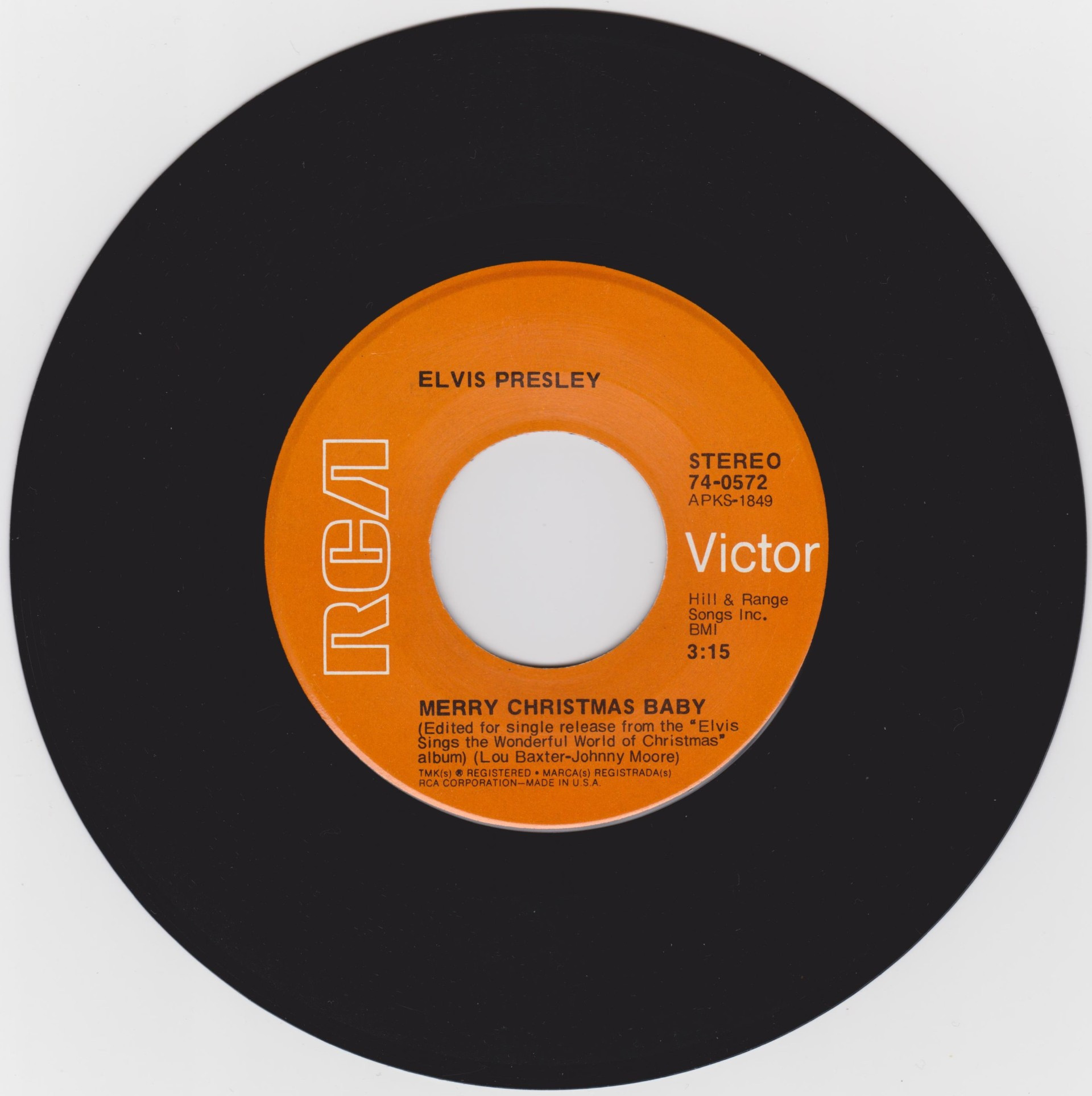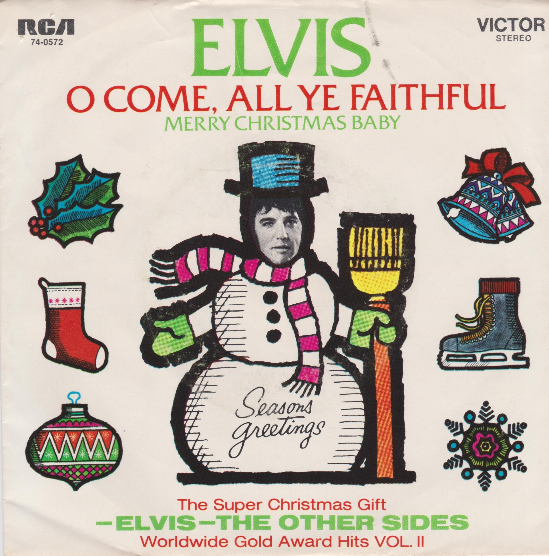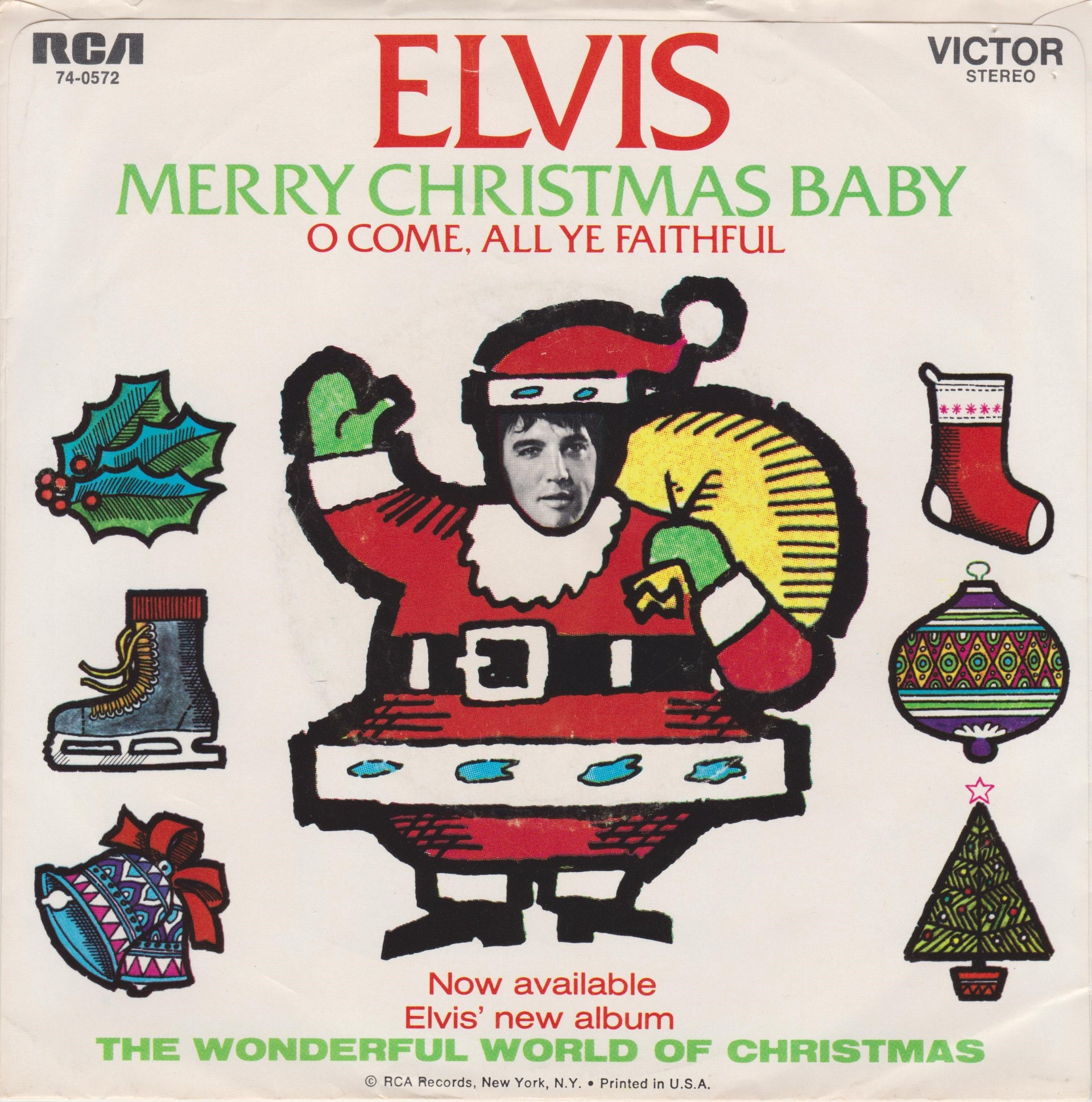 Nashville, May 15, 1971 Brief History : Elvis Sings The Wonderful World Of Christmas is a 1971 album by Elvis Presley, and Elvis' second and final Christmas album. The album was released in October 1971, followed by the single from the album "Merry Christmas Baby" / "O Come All Ye Faithful" released in November 1971. This album was a top seller and topped the Billboard Holiday Albums Chart, and would have charted high on the Billboard 200 but from 1963 to 73 Holiday albums were not allowed to chart. It did not have the commercial appeal of Elvis’ first Christmas album. Over the years, it has become a perennial favorite. It was certified Gold on 11/4/1977, Platinum on 12/1/1977, 2x Platinum on 5/20/1988 and 3x Platinum on 7/15/1999 by the RIAA. Several of the songs on the album were published by Elvis Presley's publishing company, such as "Holly Leaves And Christmas Trees", "I'll Be Home On Christmas Day", "If I Get Home On Christmas Day", and "On a Snowy Christmas Night". Orange Label Details : *NOTE* 7inch x 5inch postcard issued with this release. |